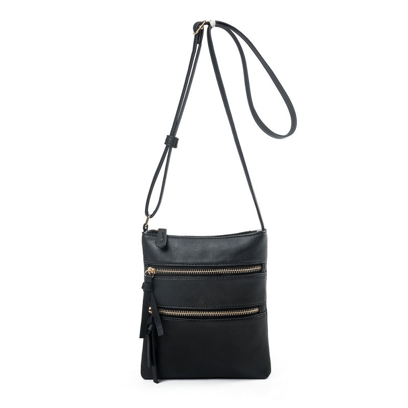 Black Compact Women’s Crossbody Bag – Adjustable Strap, Double Zipper Closure, 18x21cm Lightweight PU Leather Shoulder Bag