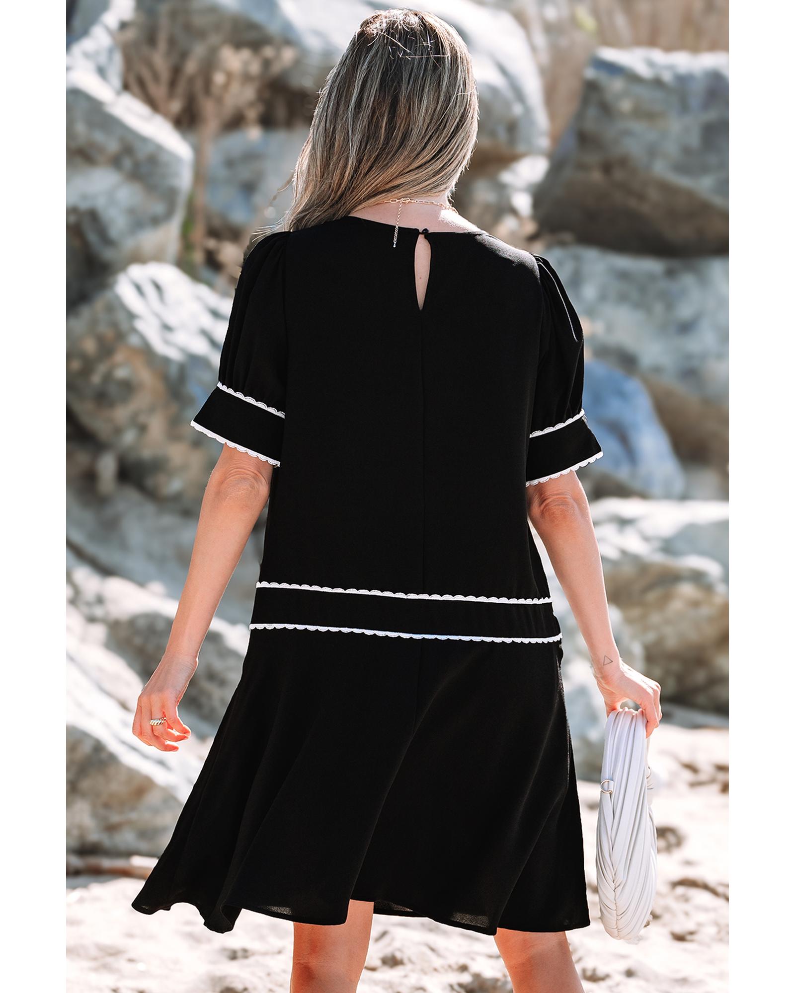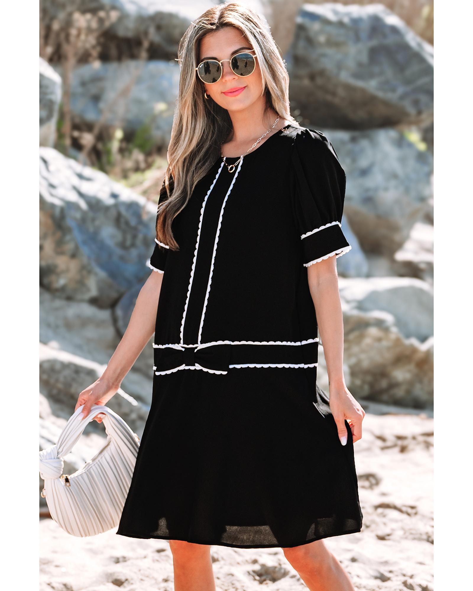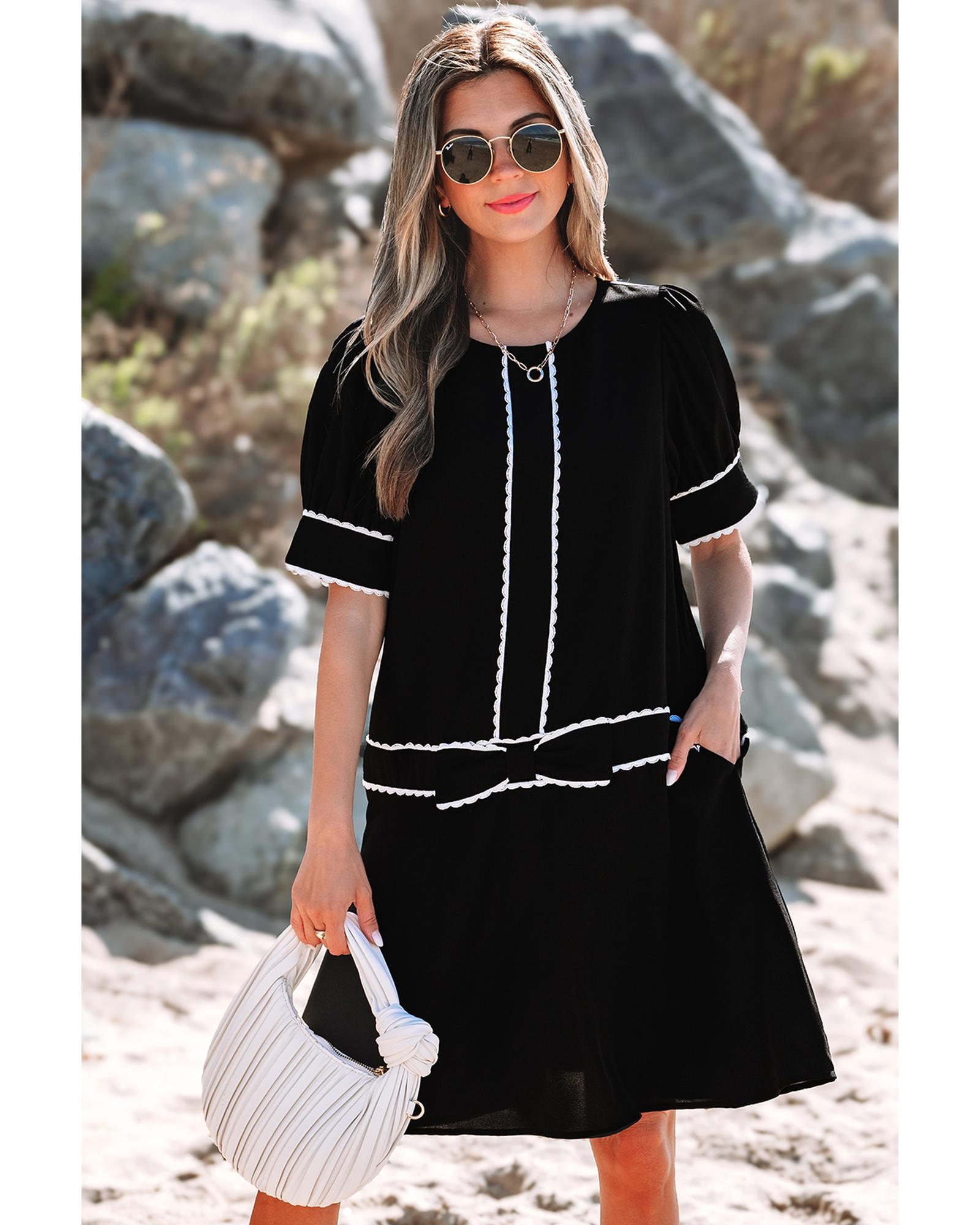 Black Contrast Scallop Trim Bow Detail Half Sleeve Shift Dress – S