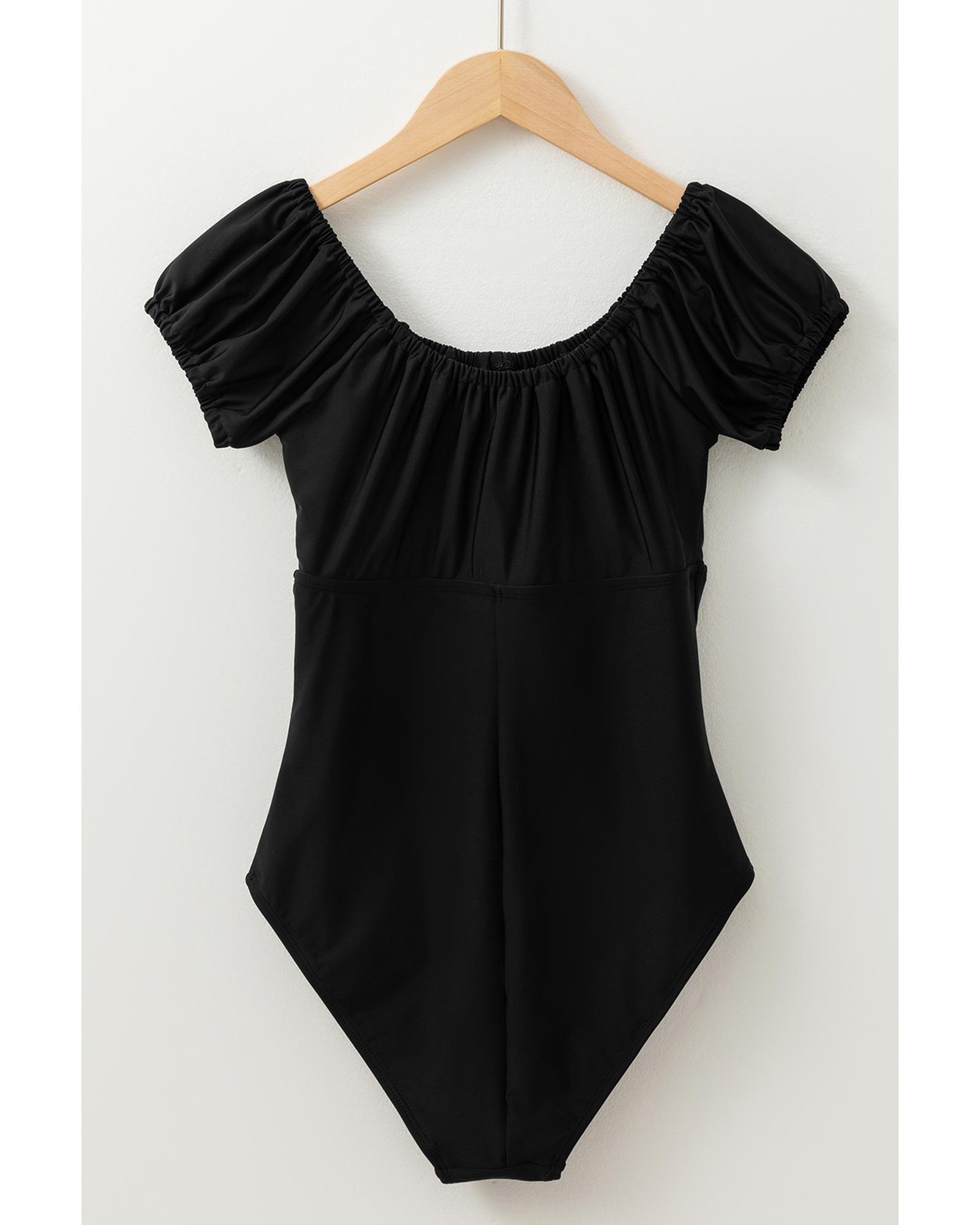 Black Elastic Neckline Short Sleeve One Piece Swimsuit – L