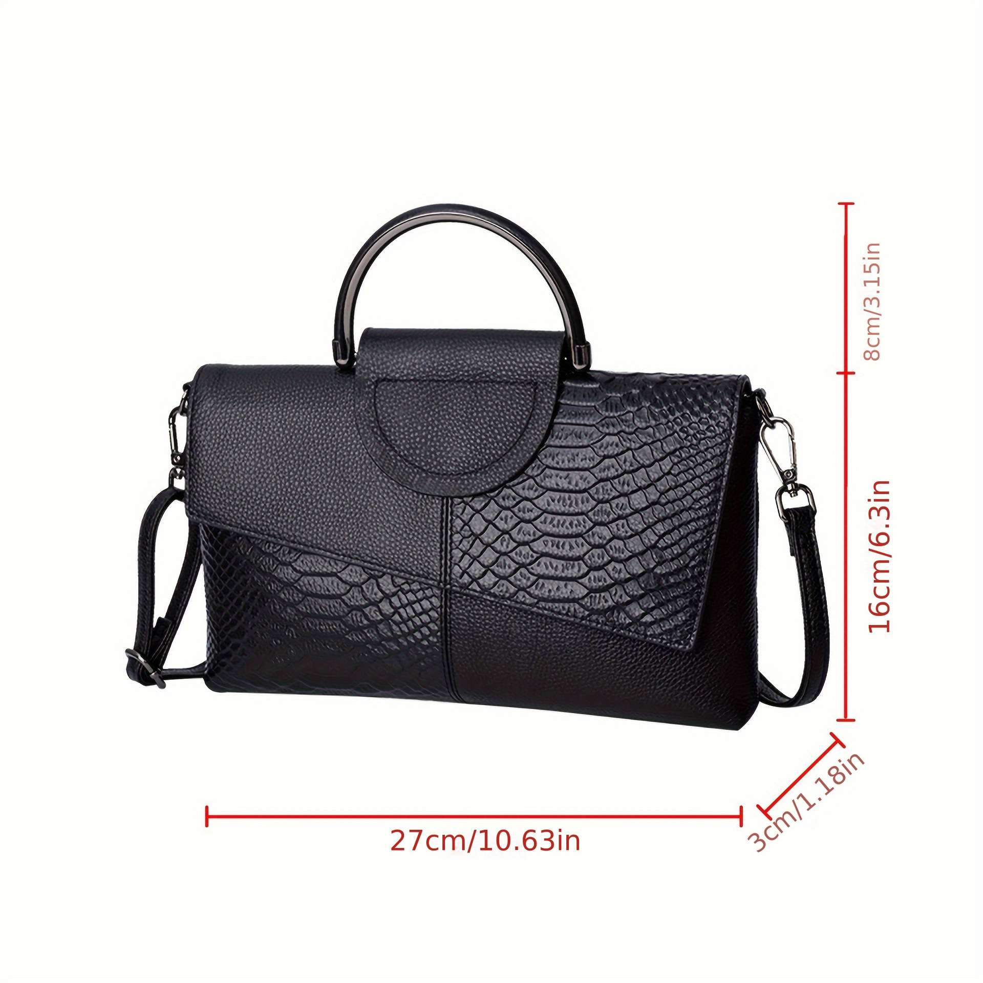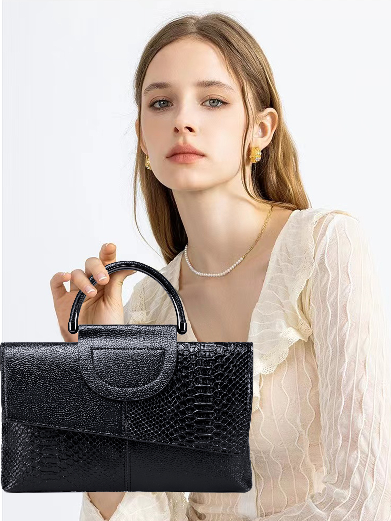 Elevate your style with this exquisite clutch bag, designed for the modern woman who appreciates timeless elegance. The bag features a sophisticated combination of smooth and crocodile-embossed leather, creating a luxurious and eye-catching texture. Its structured silhouette and unique metal top handle add a touch of vintage charm.