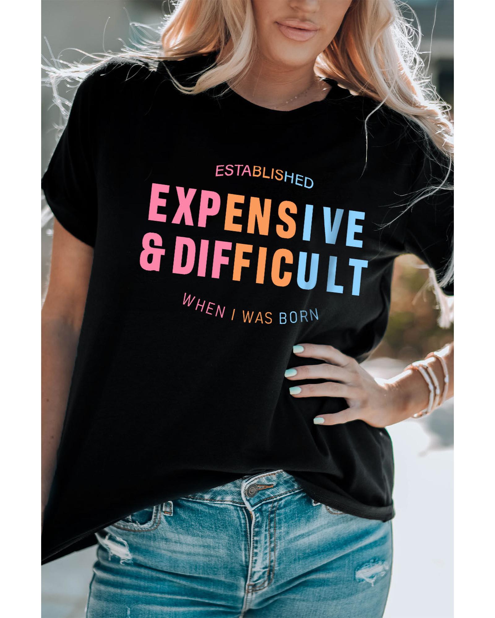 Luxurious and stylish Black EXPENSIVE&DIFFICULT Graphic Tee Made with high - quality materials for comfort and durability Unique graphic design adds sophistication to any outfit Available in multiple sizes for the perfect fit Pairs well with jeans or a skirt for a chic and fashionable look Designed for women who appreciate luxury and style