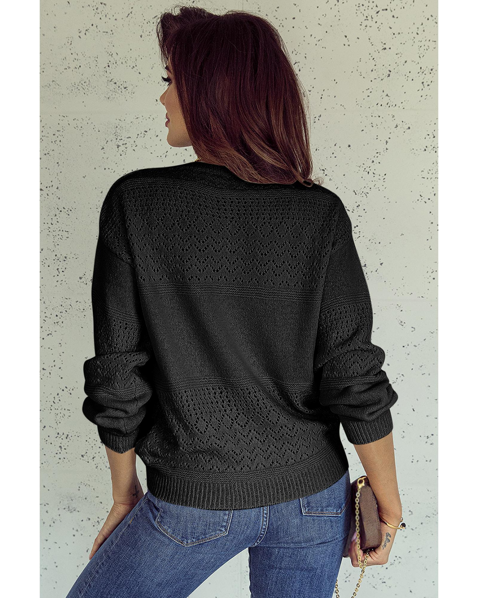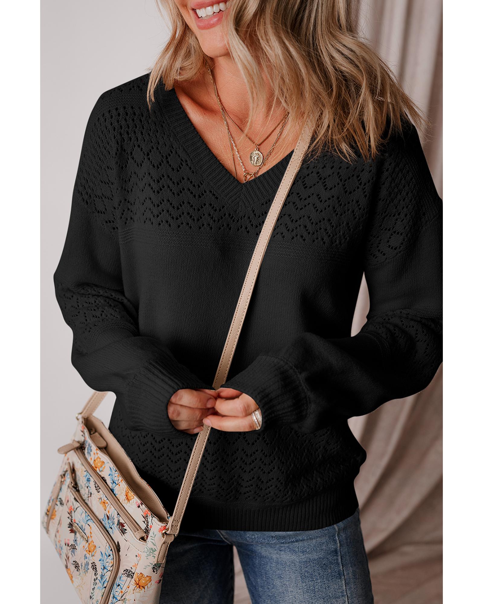 Black Eyelet Pattern Detail V Neck Drop Shoulder Sweater – L