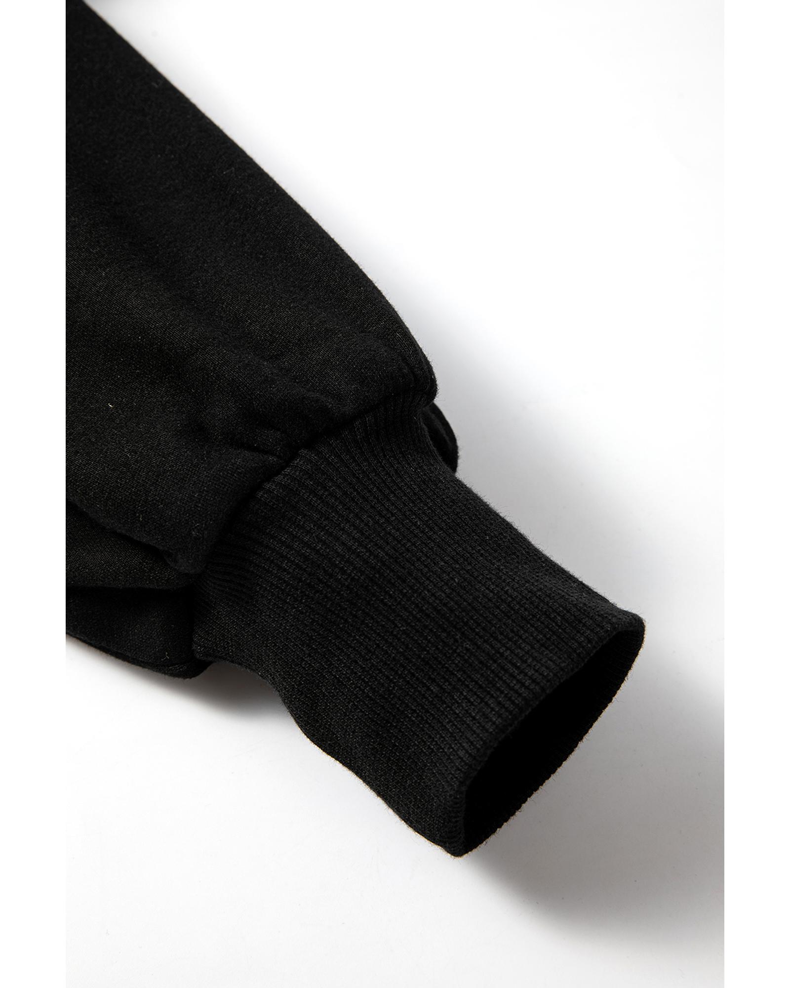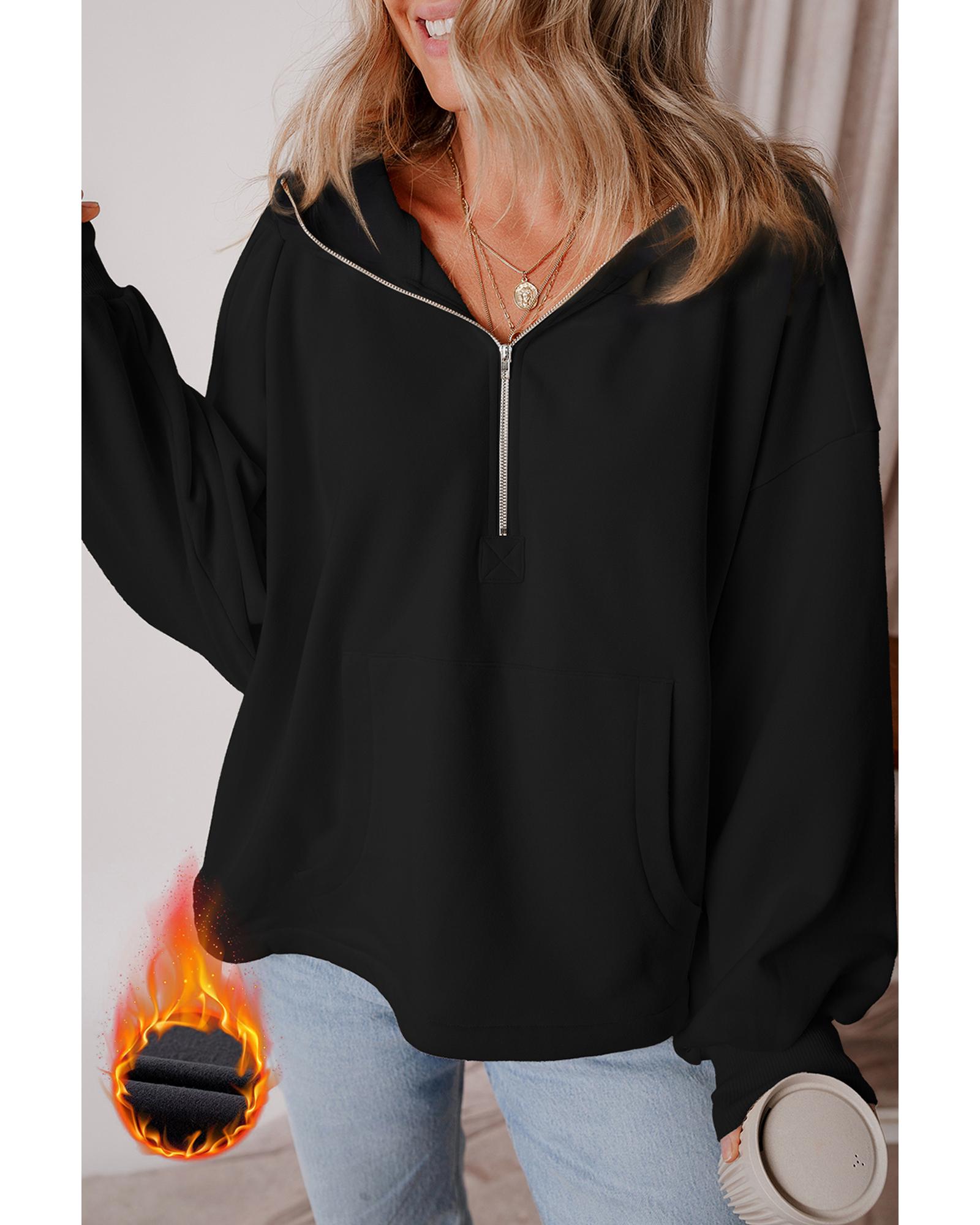 - Black Fleece Lined Half Zipper Kangaroo Pockets Loose Hoodie