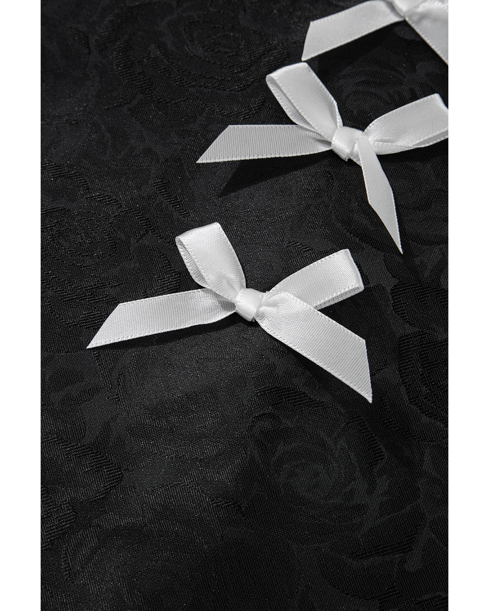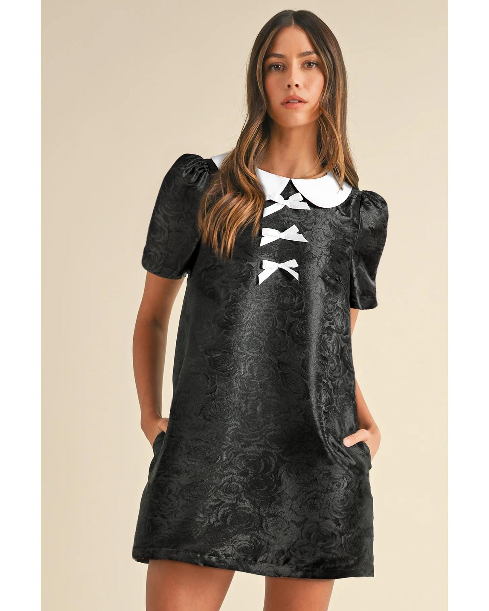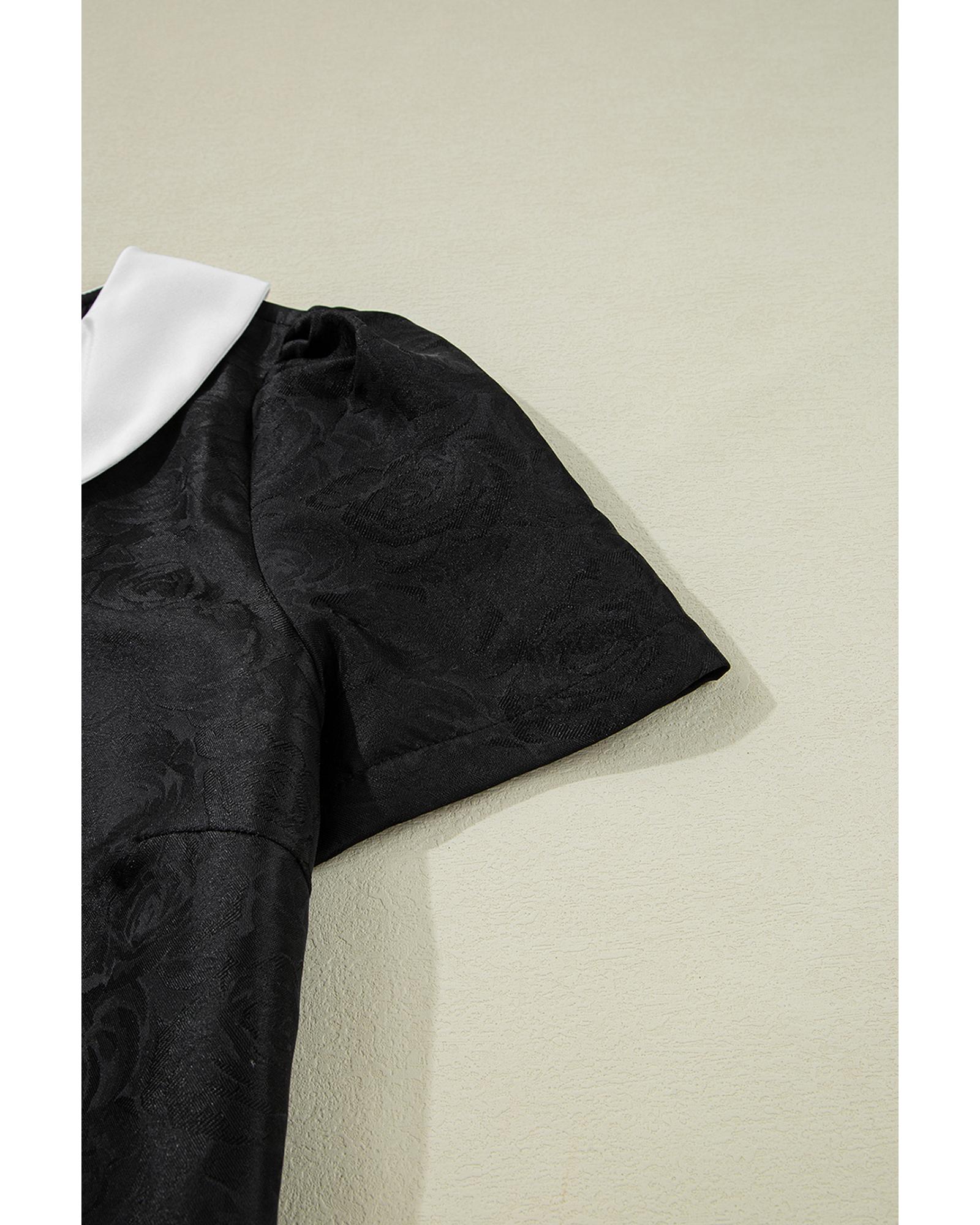 Black Floral Embossed Puff Sleeve Colorblock Bow Collared Mini Dress – L