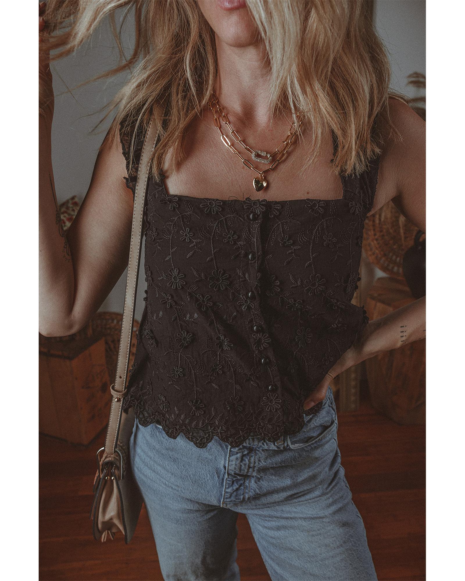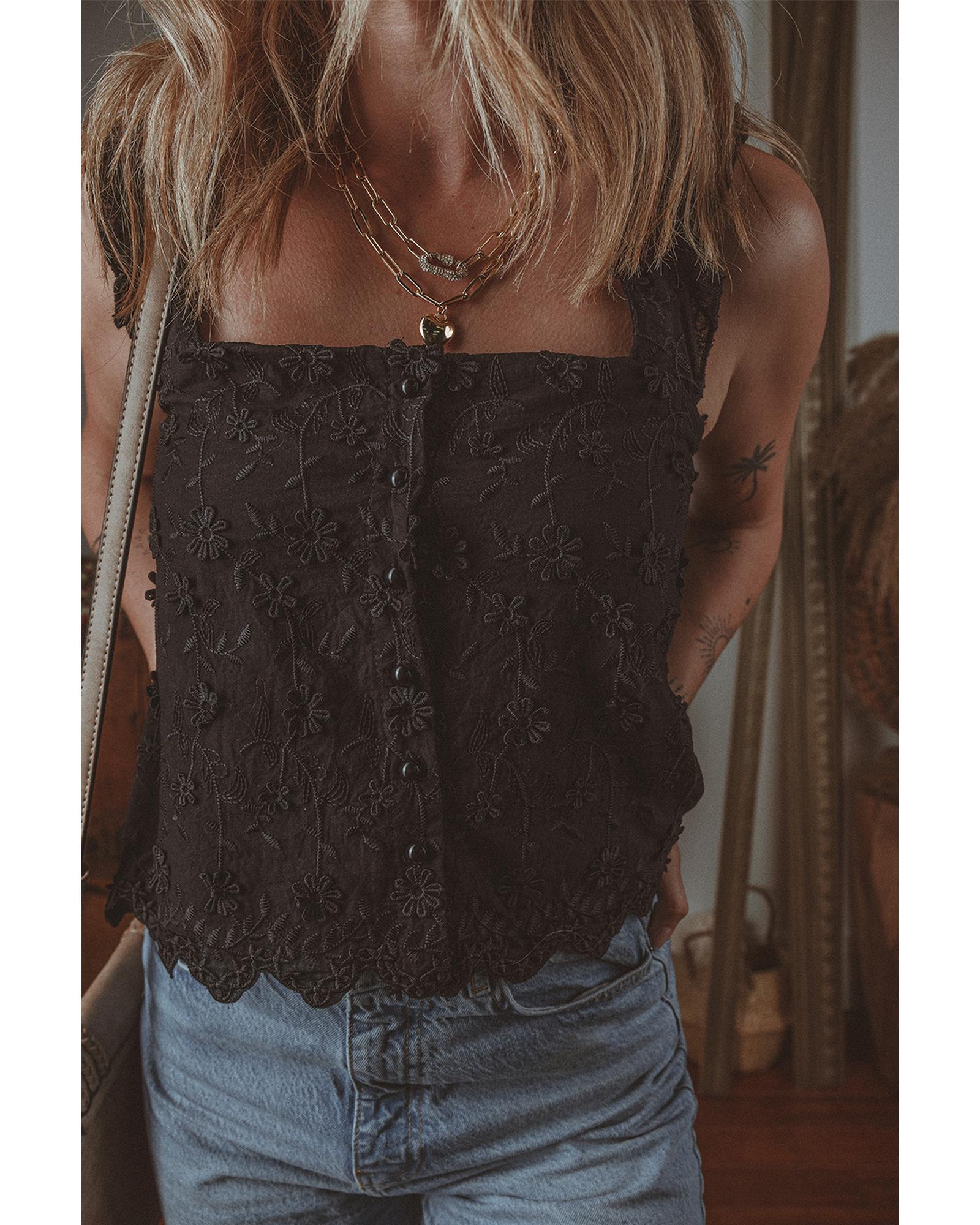 Black Floral Embroidered Buttoned Square Neck Tank Top – XL