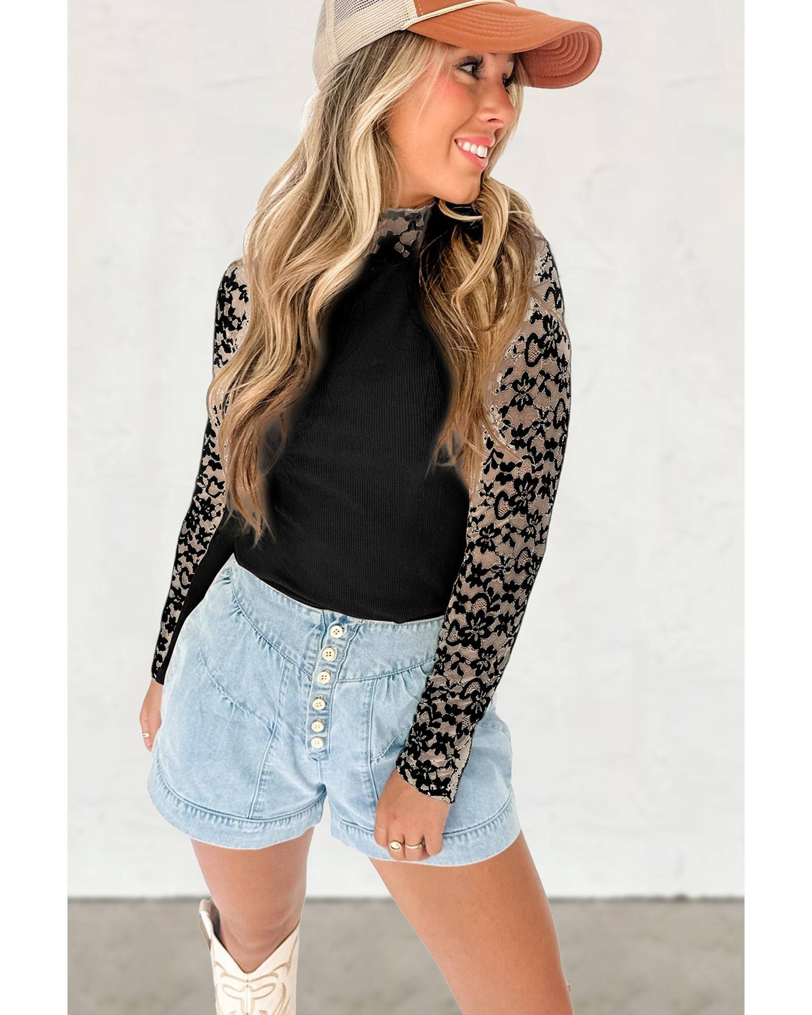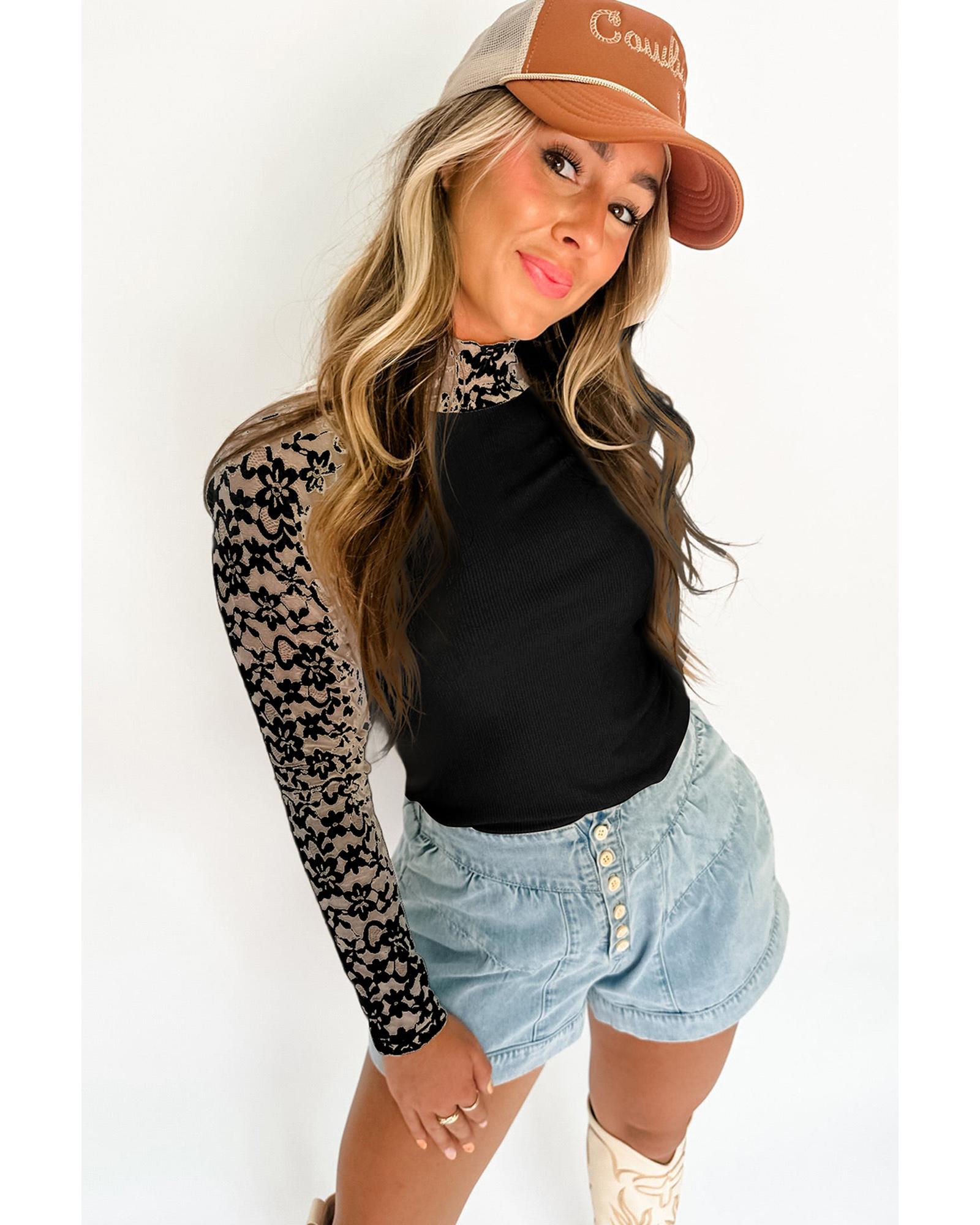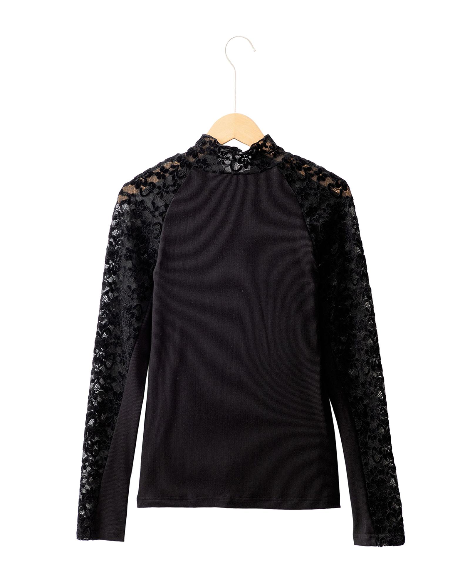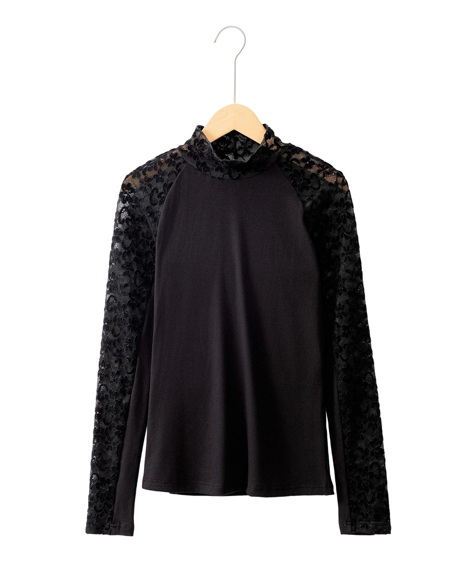 - Black Floral Lace Patchwork Long Sleeve High Neck Slim Top
