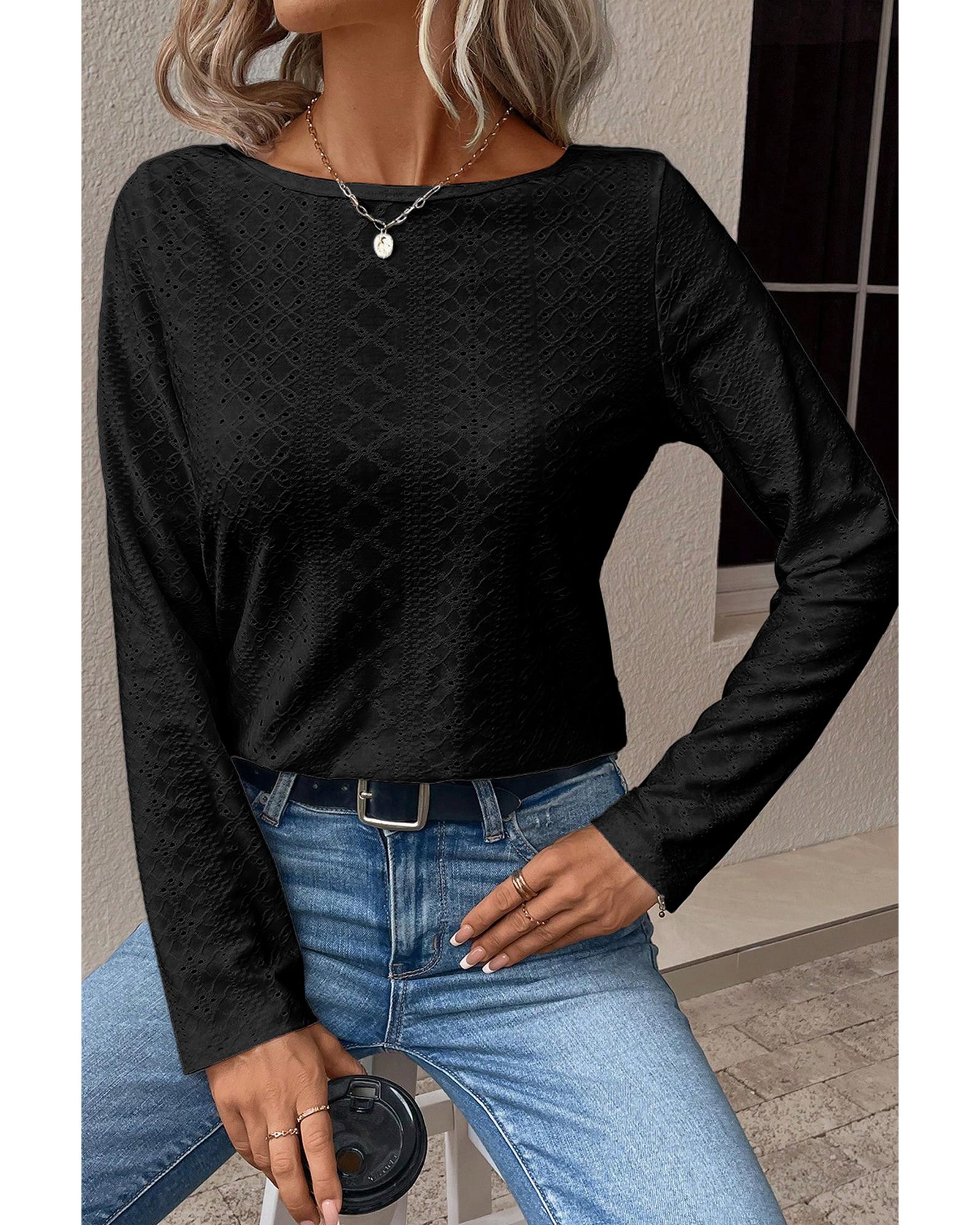 Black Floral Lace Splicing Eyelet Long Sleeve Top – S