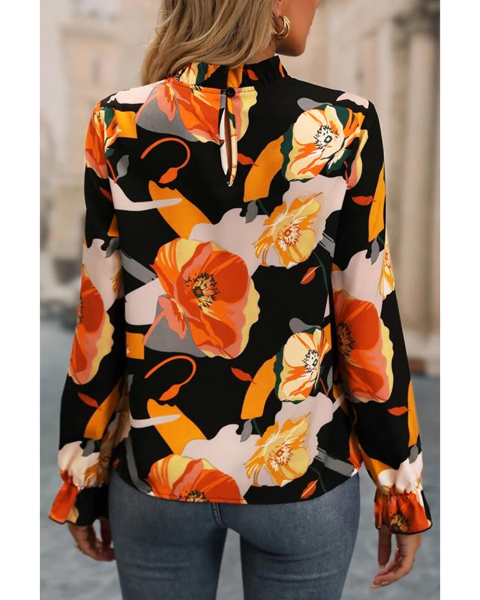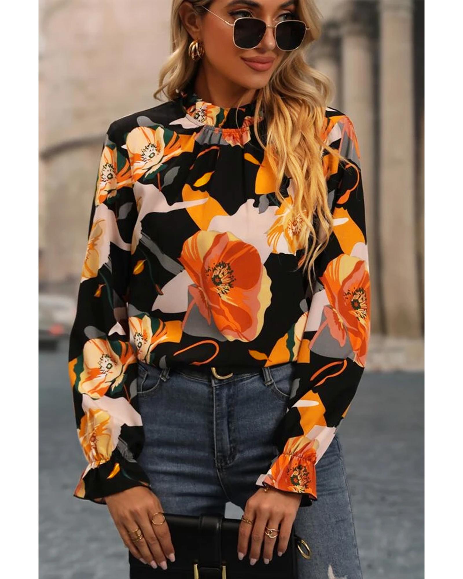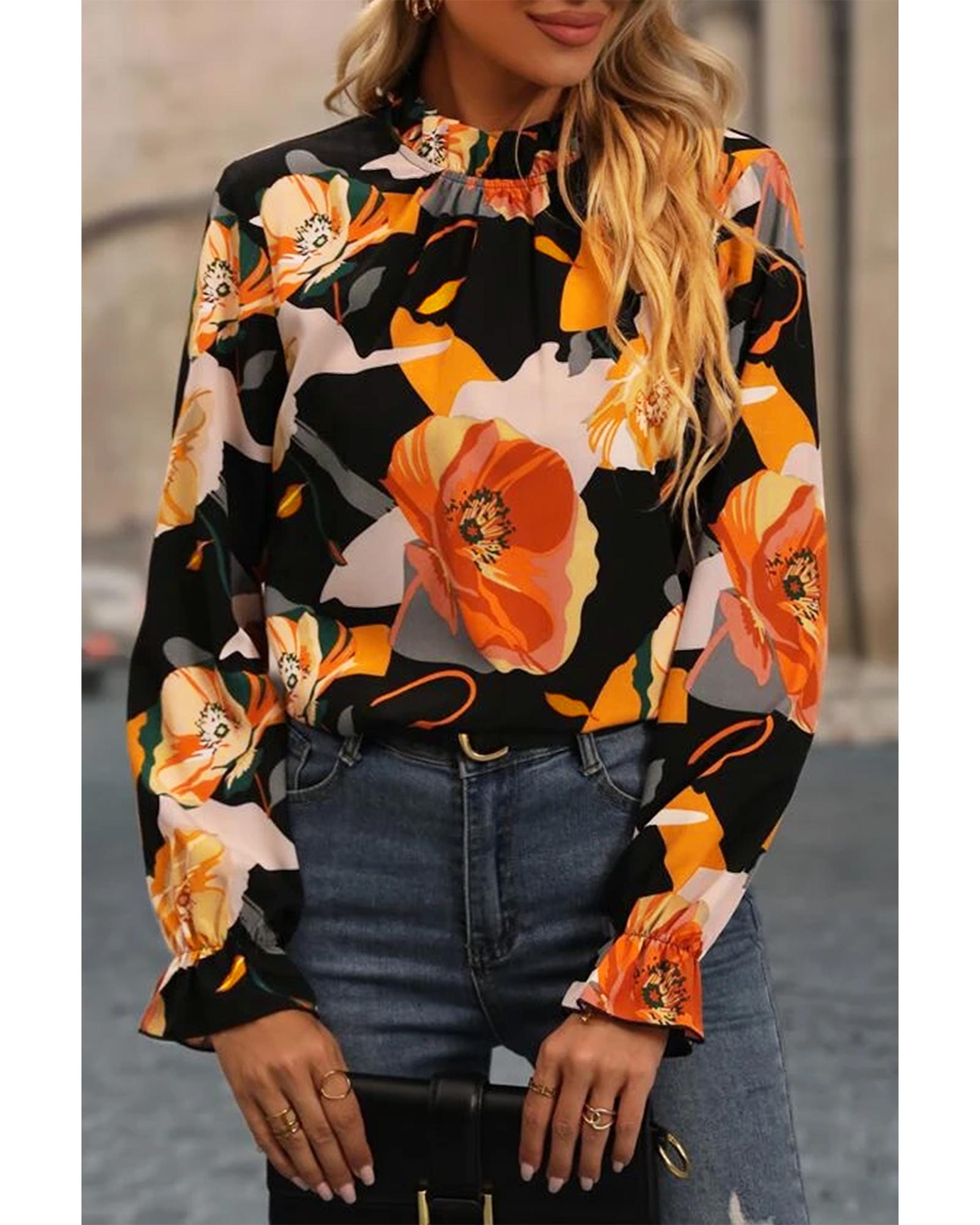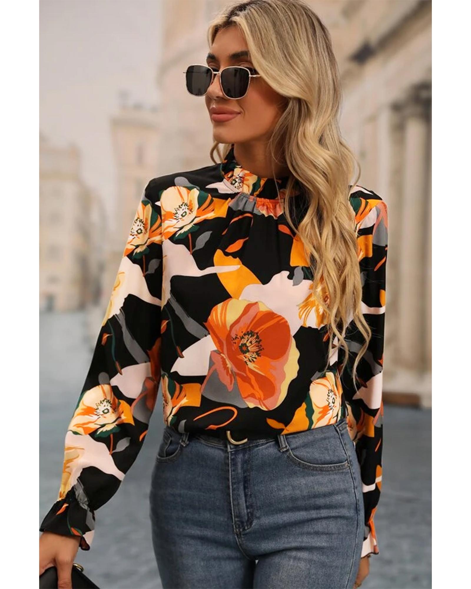 Black Floral Print Mock Neck Blouse – L