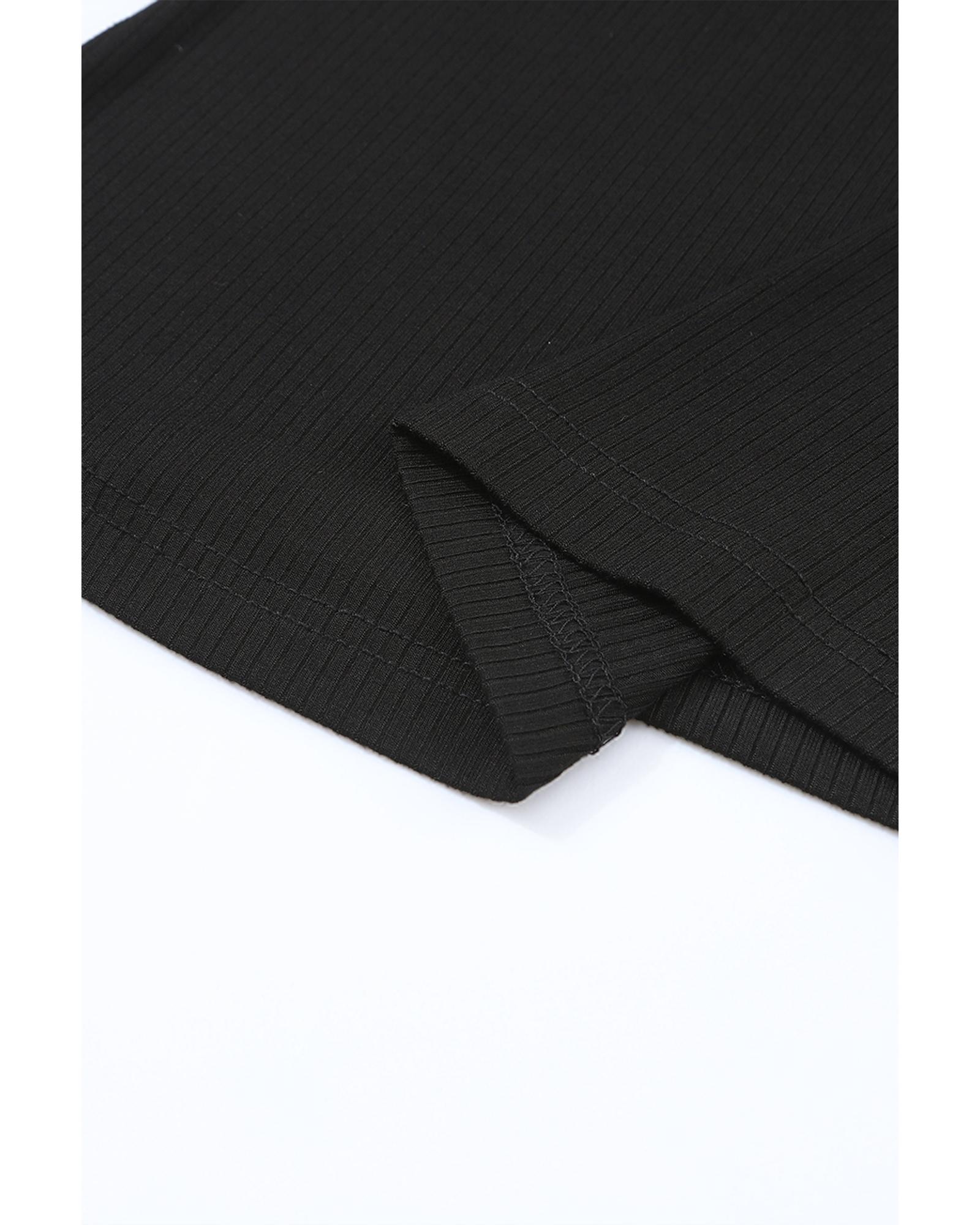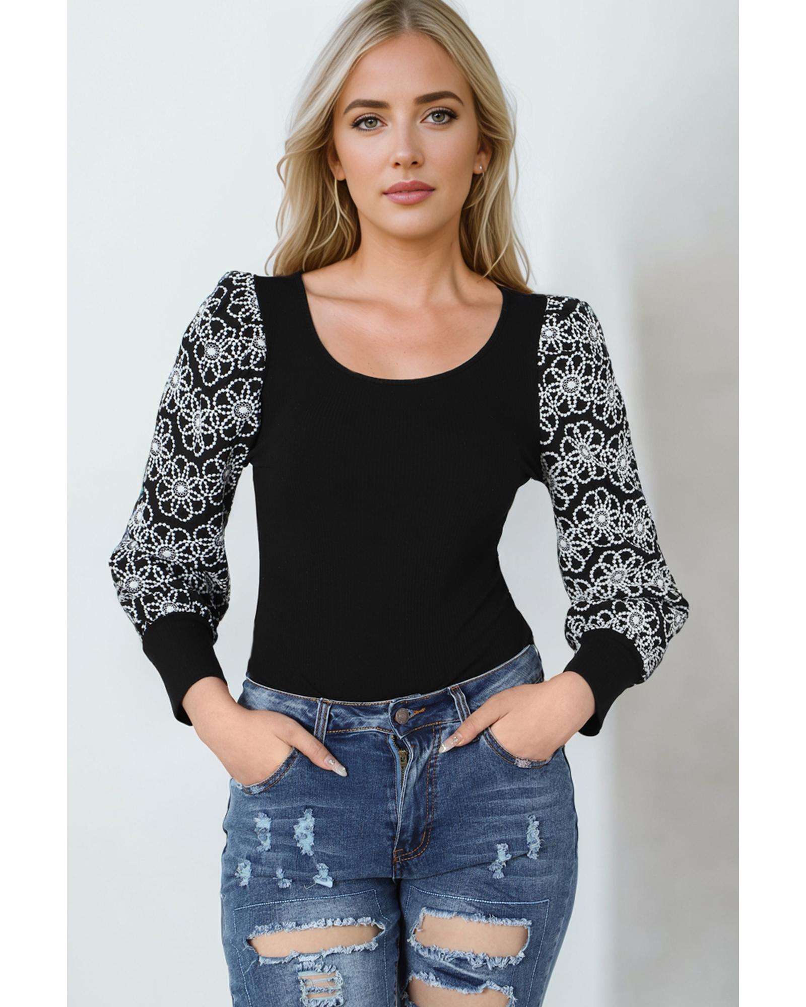 Black Flower Puff Sleeve Ribbed Knit Top – M