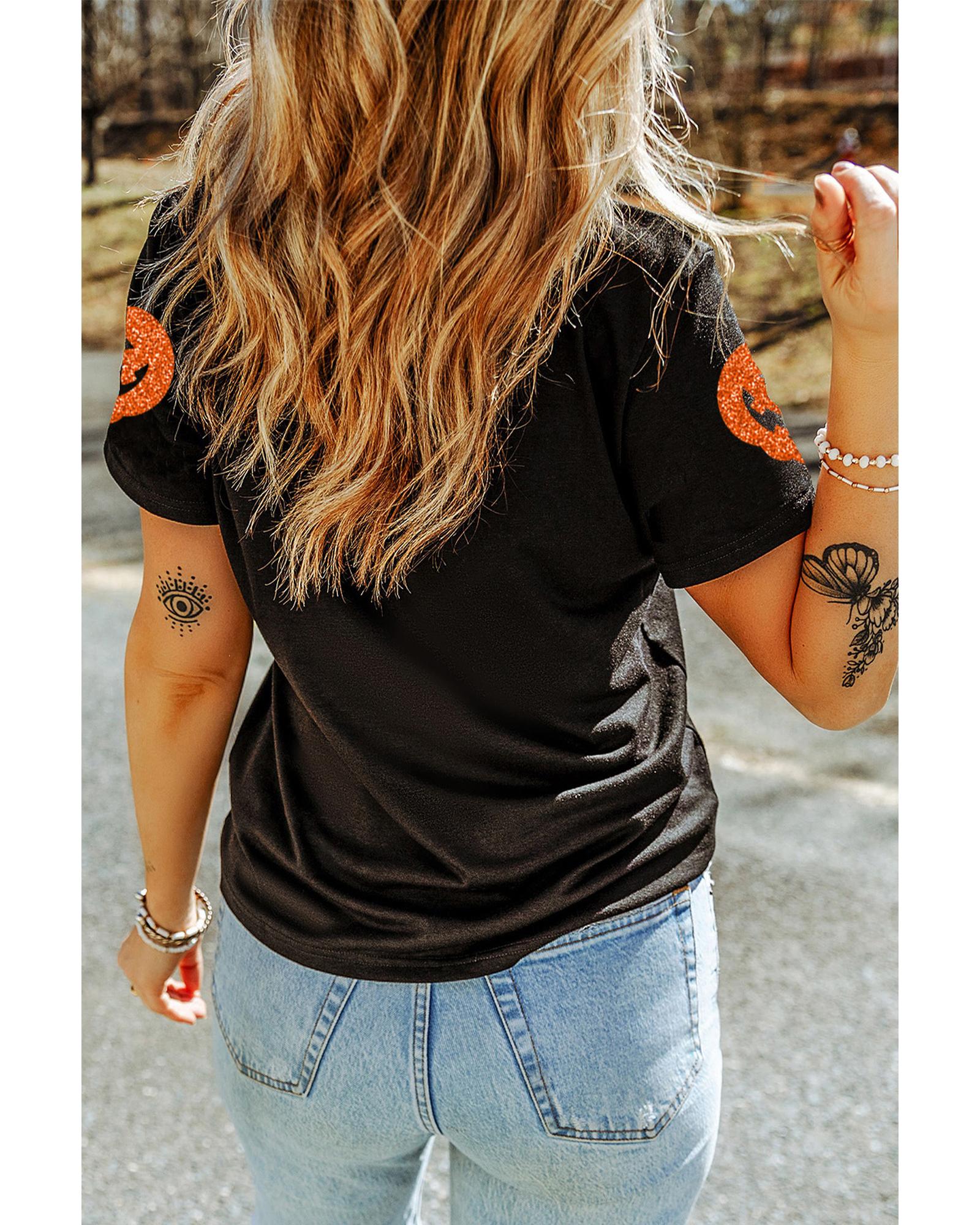 - Black Glittering Pumpkin Face Graphic Crewneck Halloween T Shirt