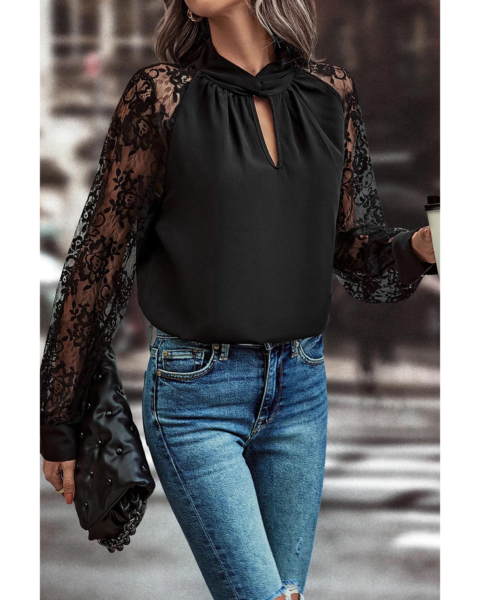 - Black Keyhole Neckline Floral Lace Raglan Sleeve Blouse
