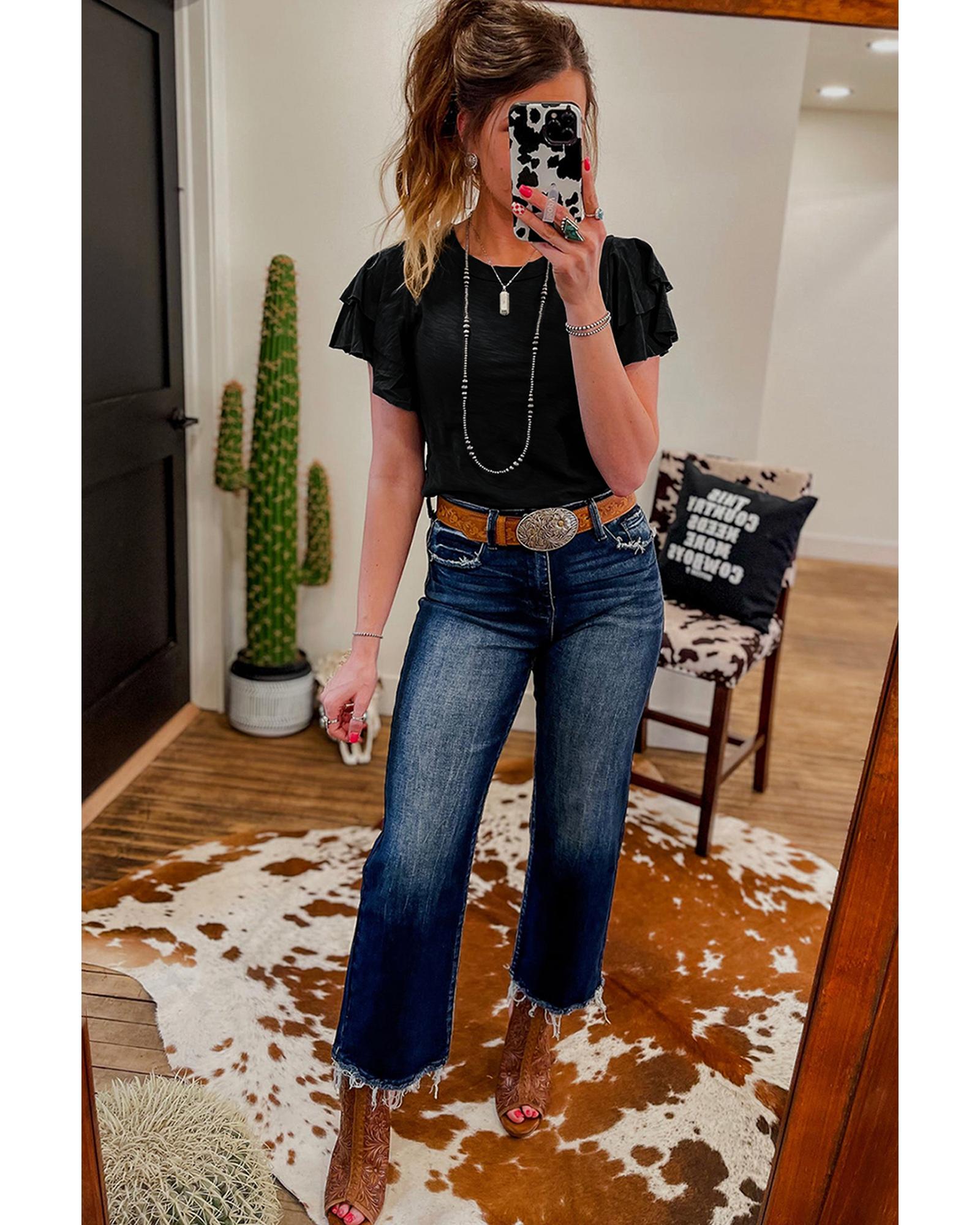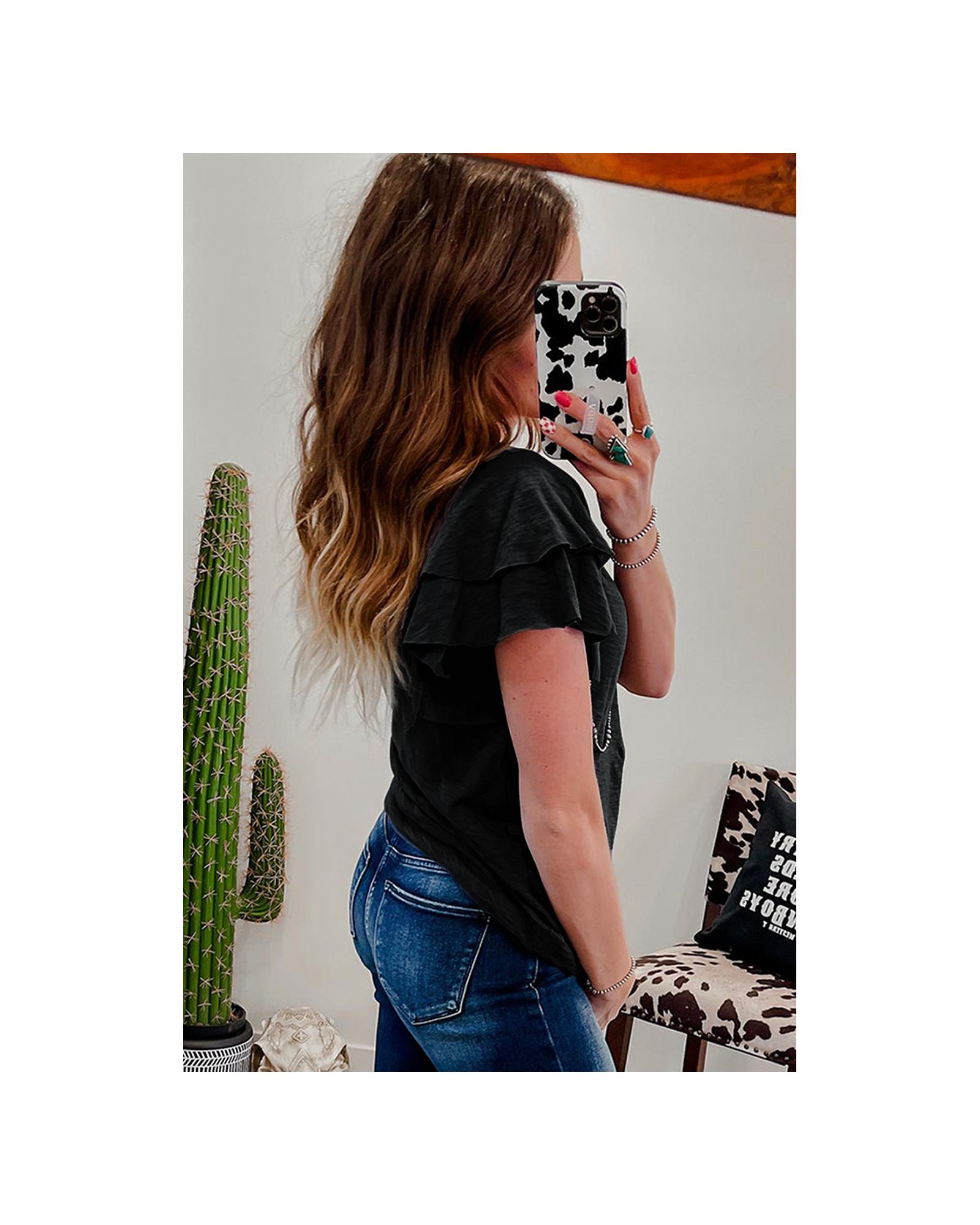 Black Layered Ruffle Short Sleeve Round Neck Top – S