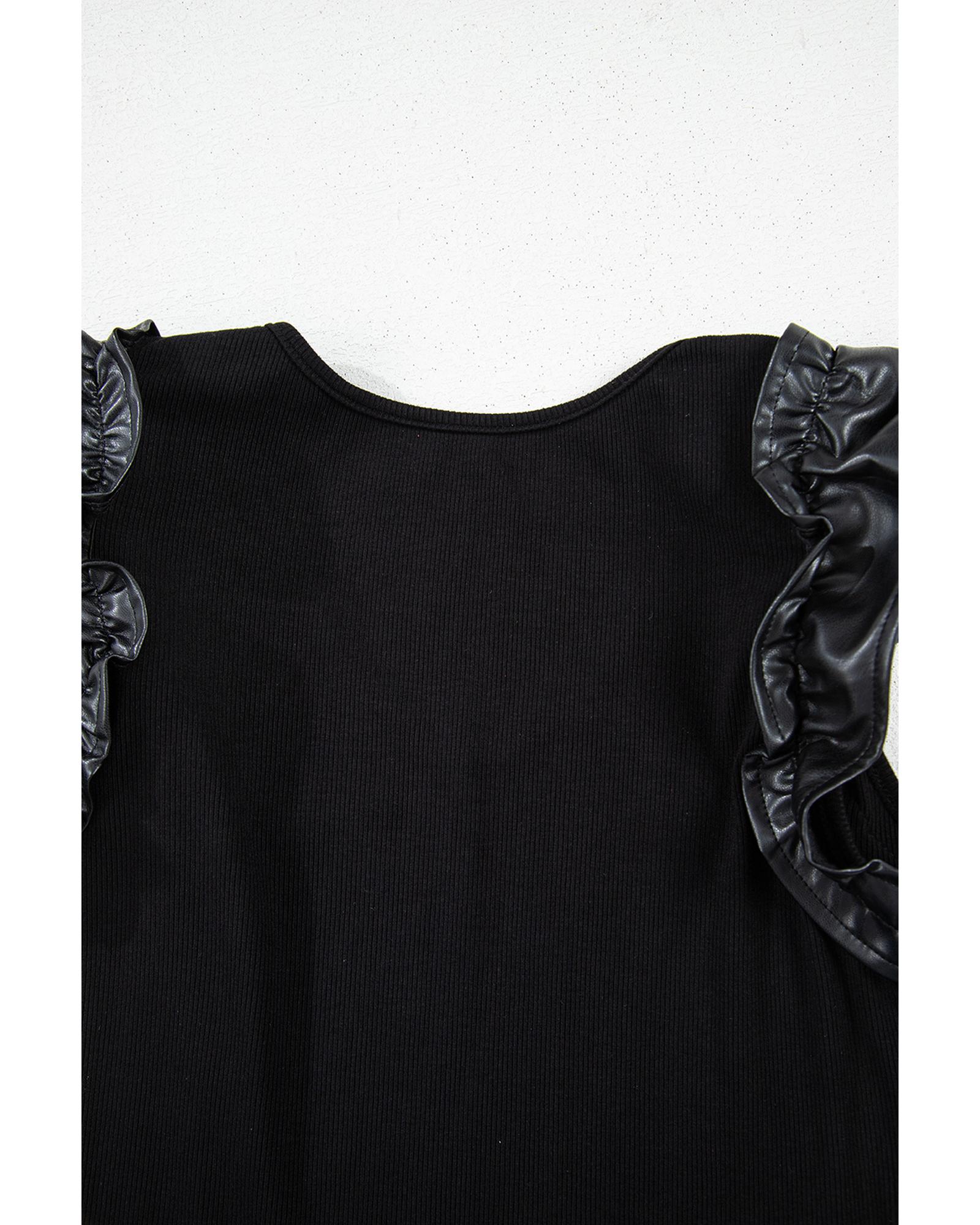 Black Leatherette Ruffle Patchwork Ribbed V Neck Bodysuit – M