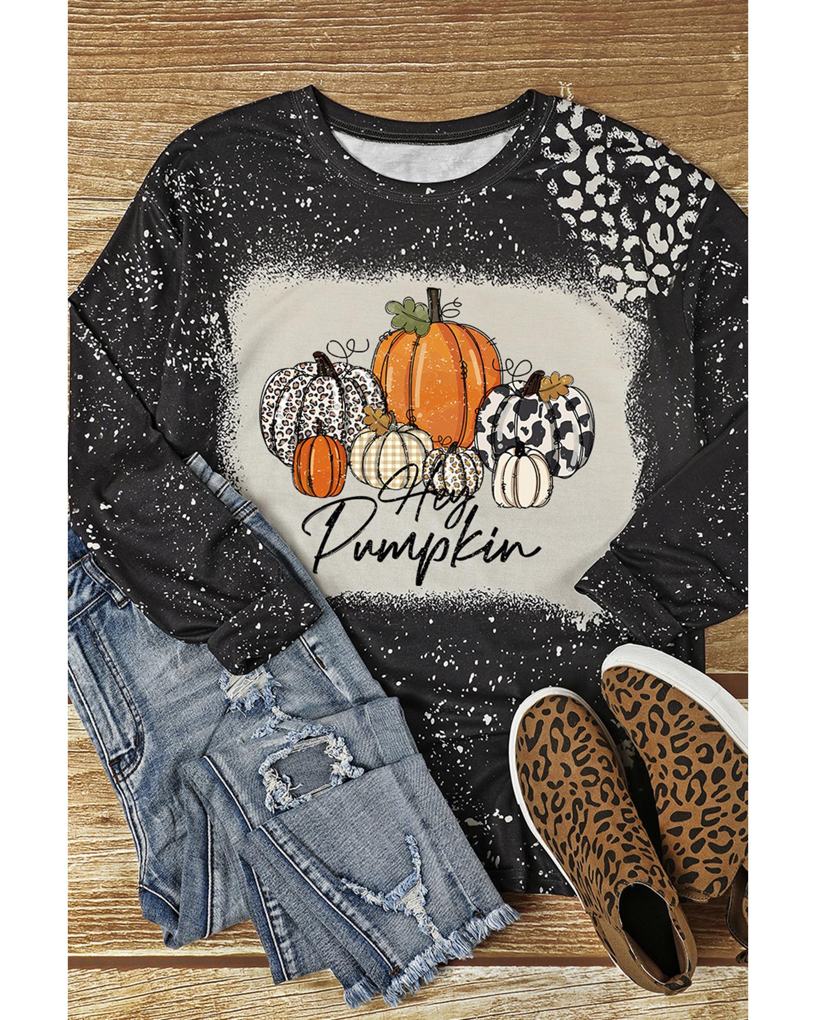 Stylish Black Leopard Bleached Pumpkin Graphic Long Sleeve Top Unique leopard print design with a bleached pumpkin graphic Made for women High - quality materials for a comfortable fit Available in various sizes Long sleeves and relaxed fit for casual wear