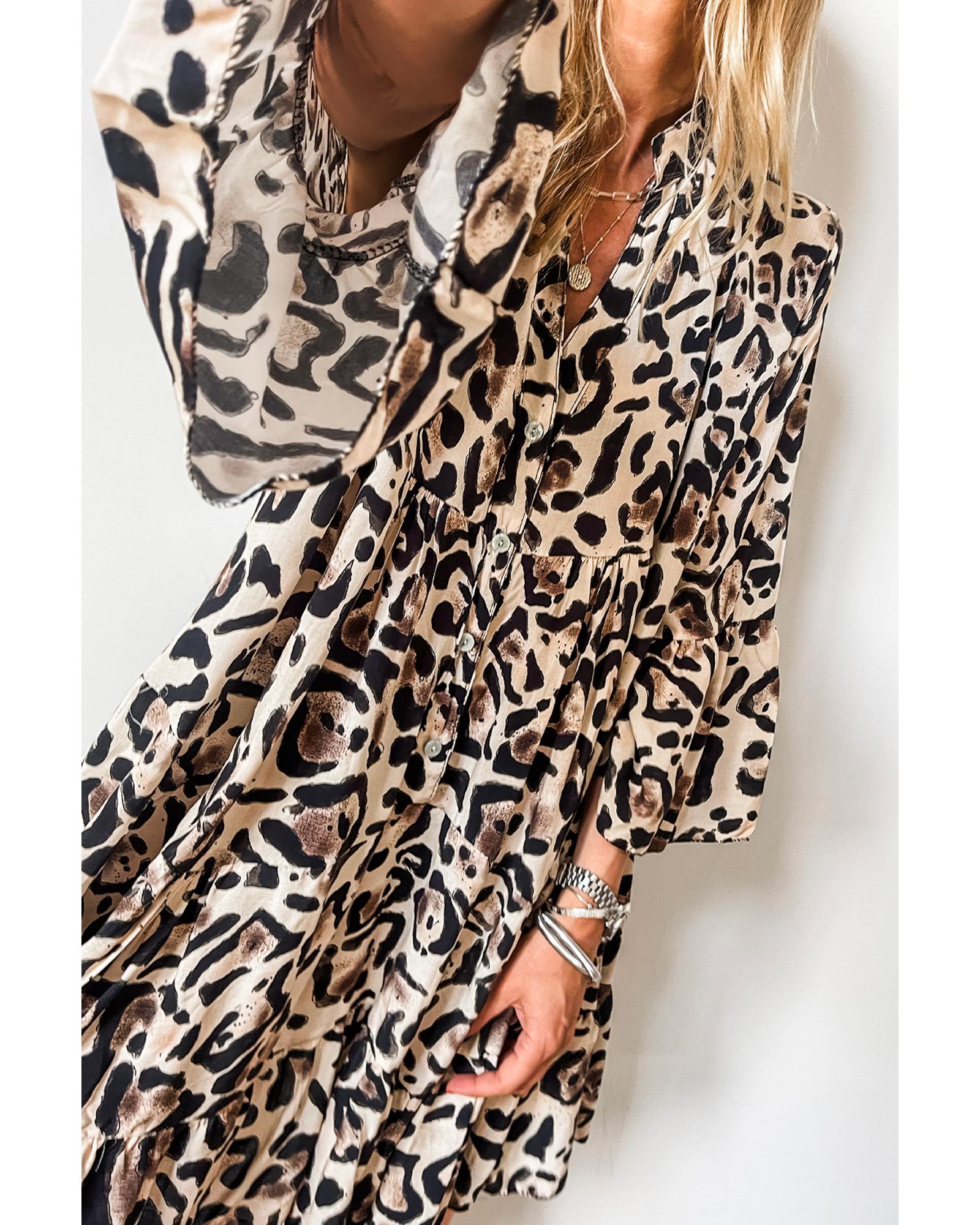 Black Leopard Print Buttoned Front 3/4 Sleeve Tiered Ruffled Hem Dress - L