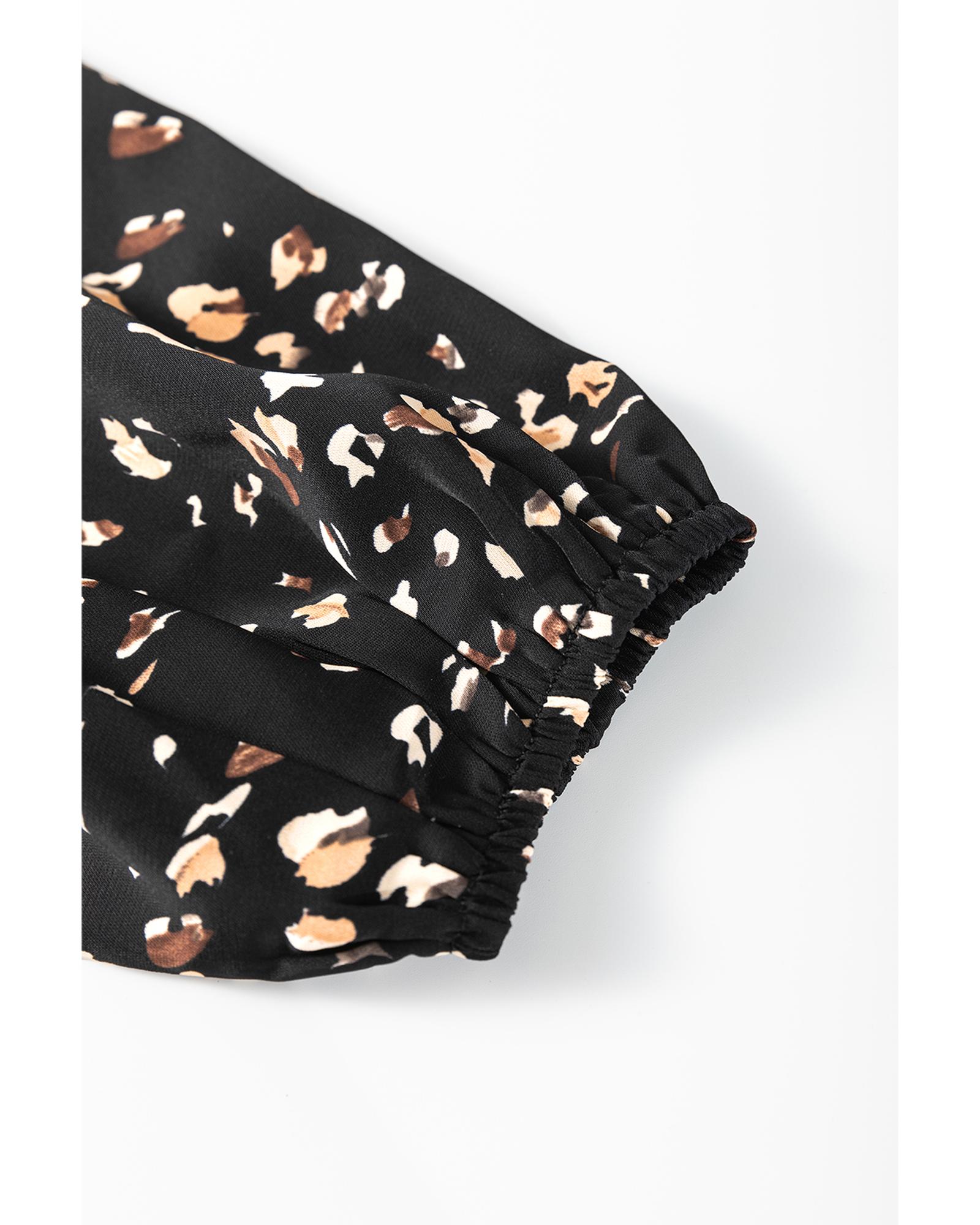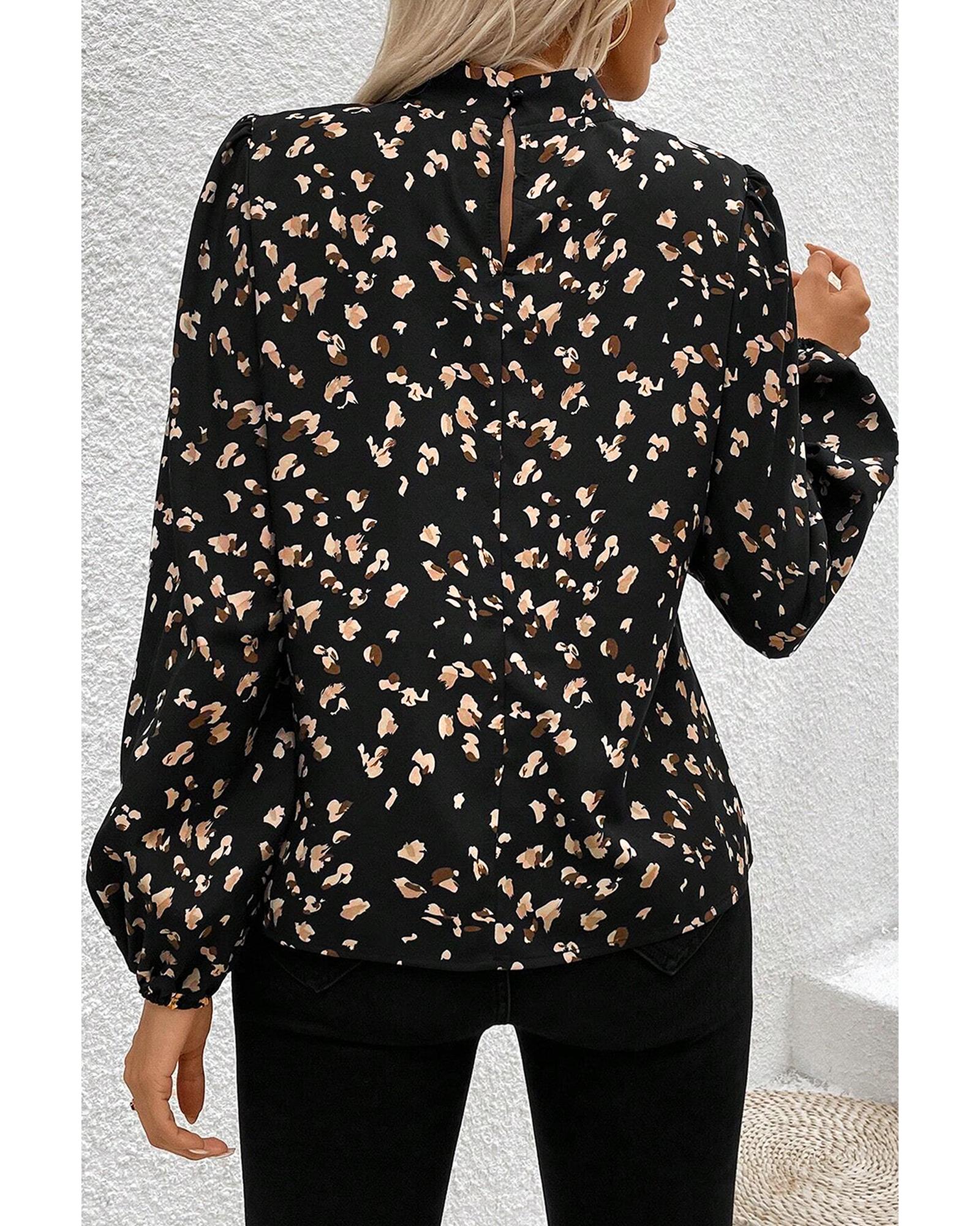 - Black Leopard Print Lantern Sleeve Mock Neck Pleated Blouse