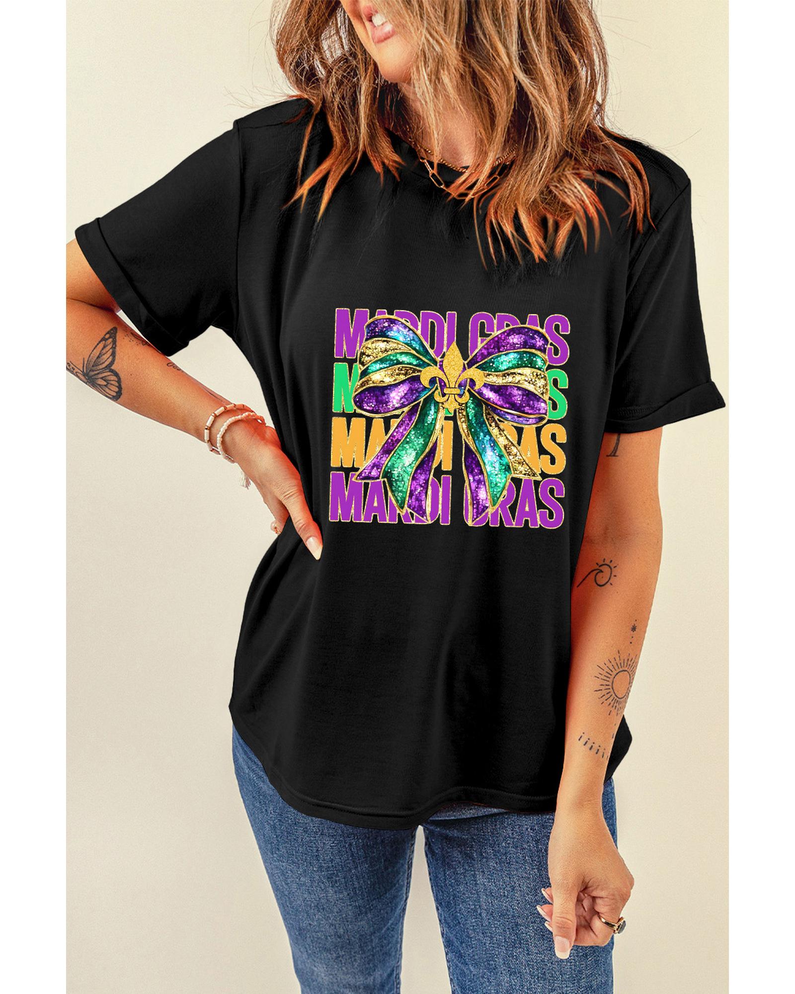 - Black MARDI GRAS Fleur de Lis Bowknot Printed Crewneck Tee