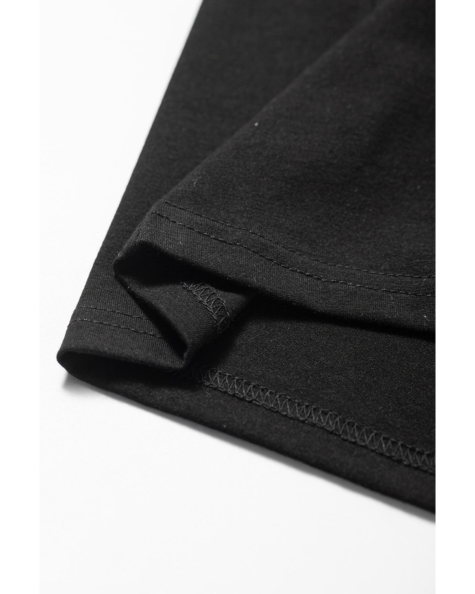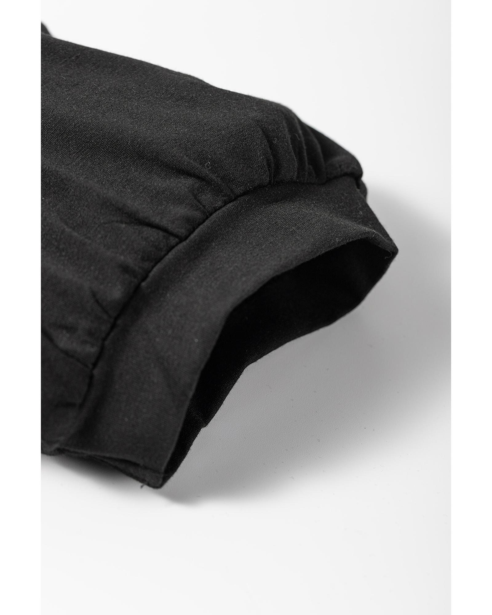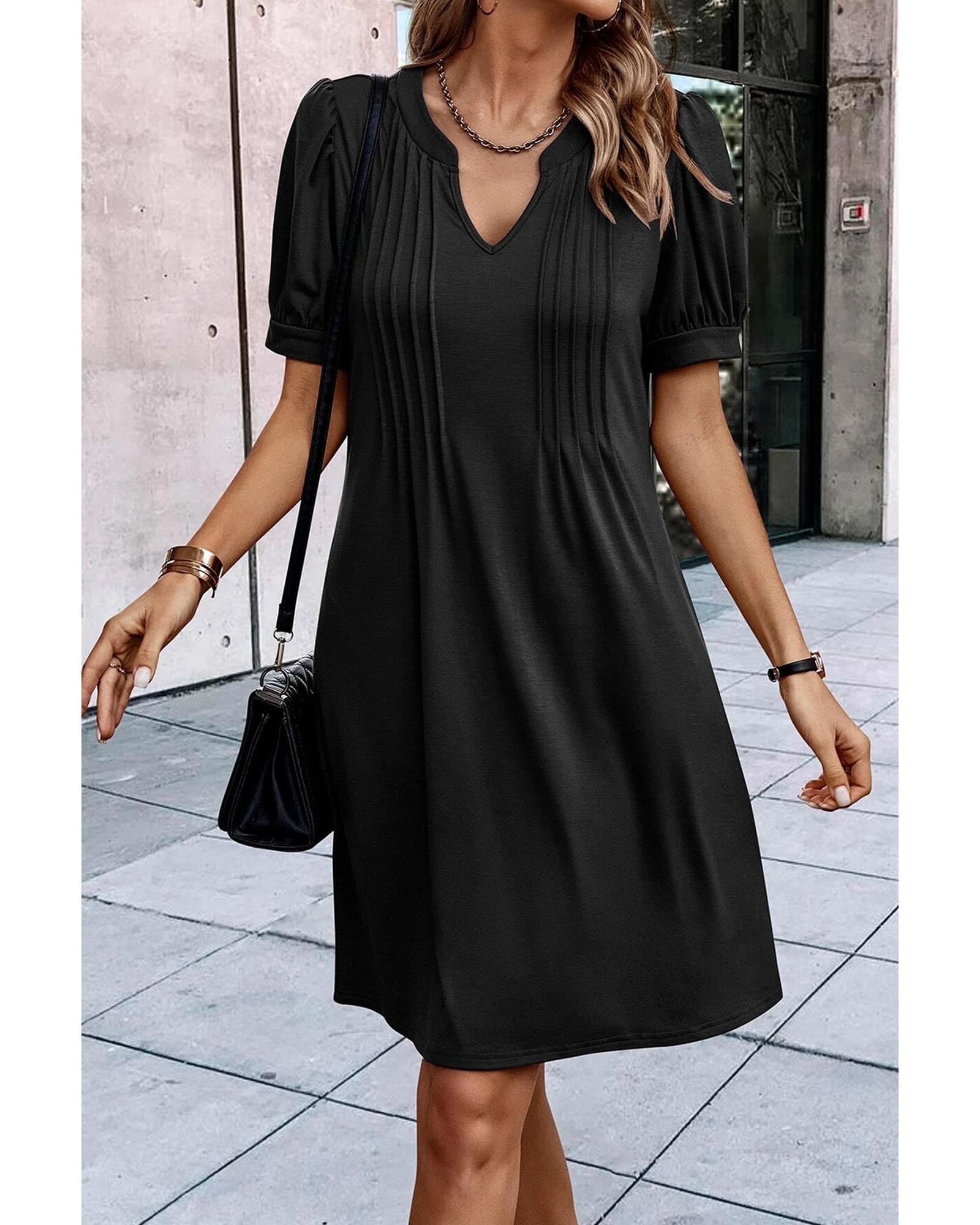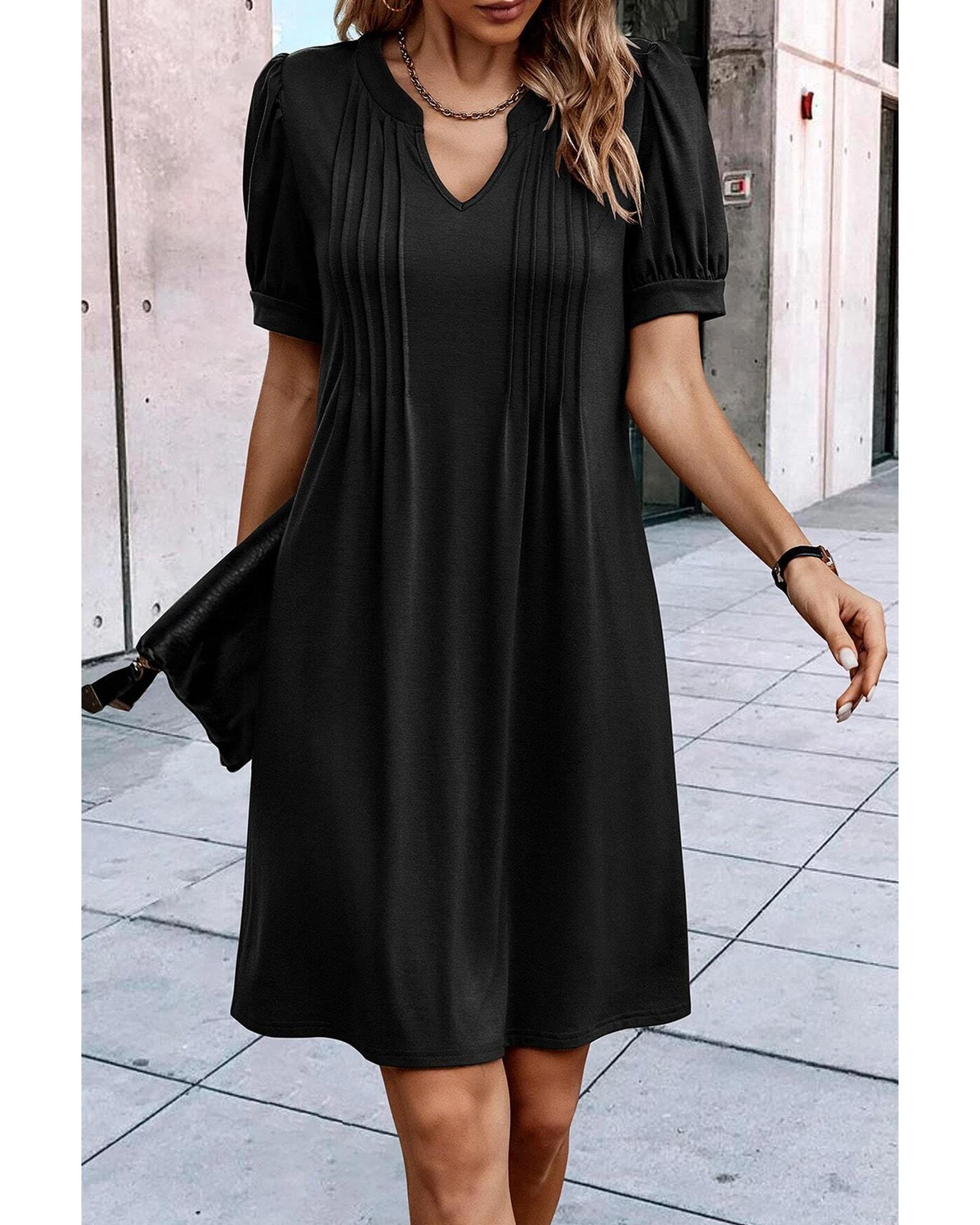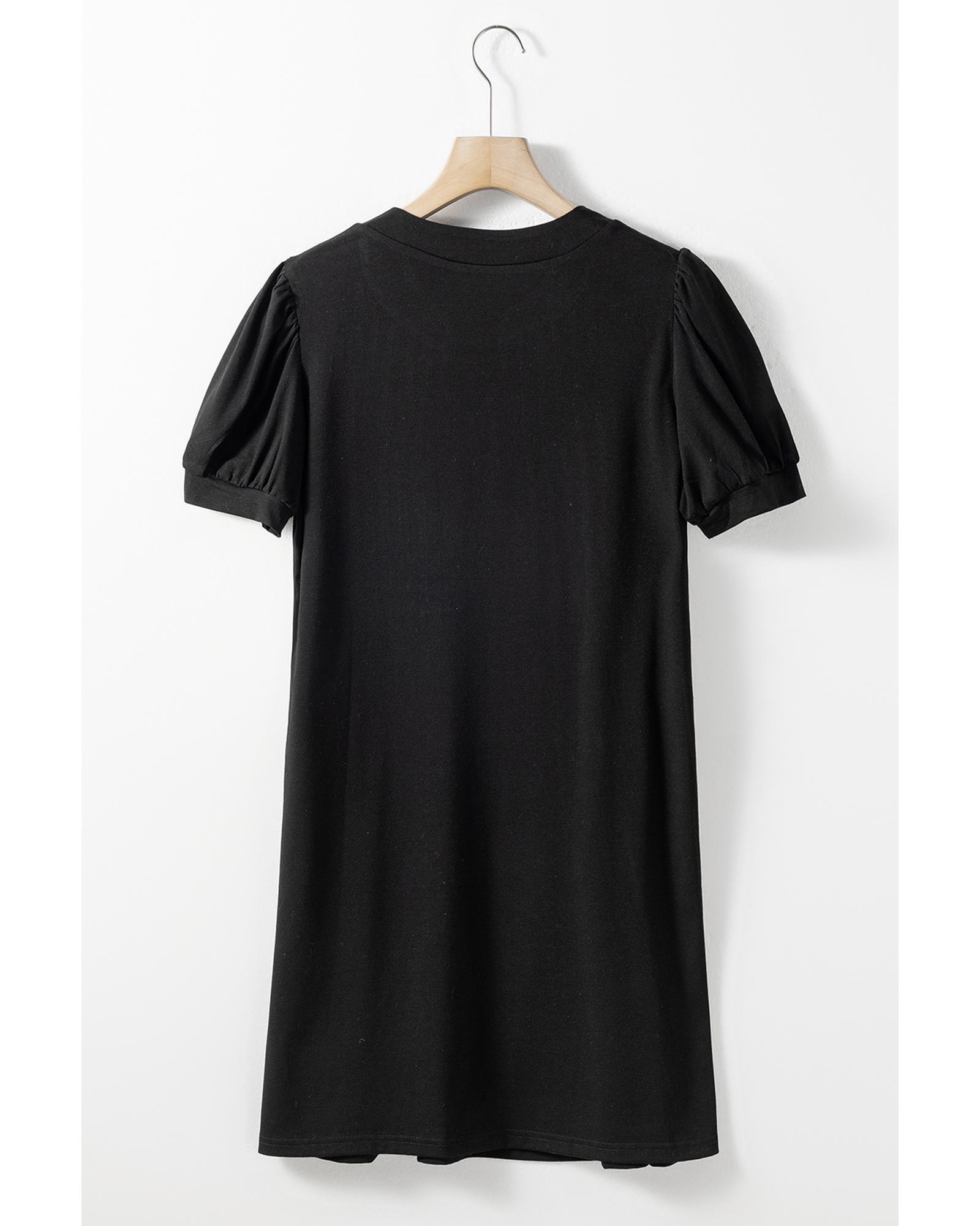 Black Notched Neck Pleated Puff Sleeve Shift T-shirt Dress – S