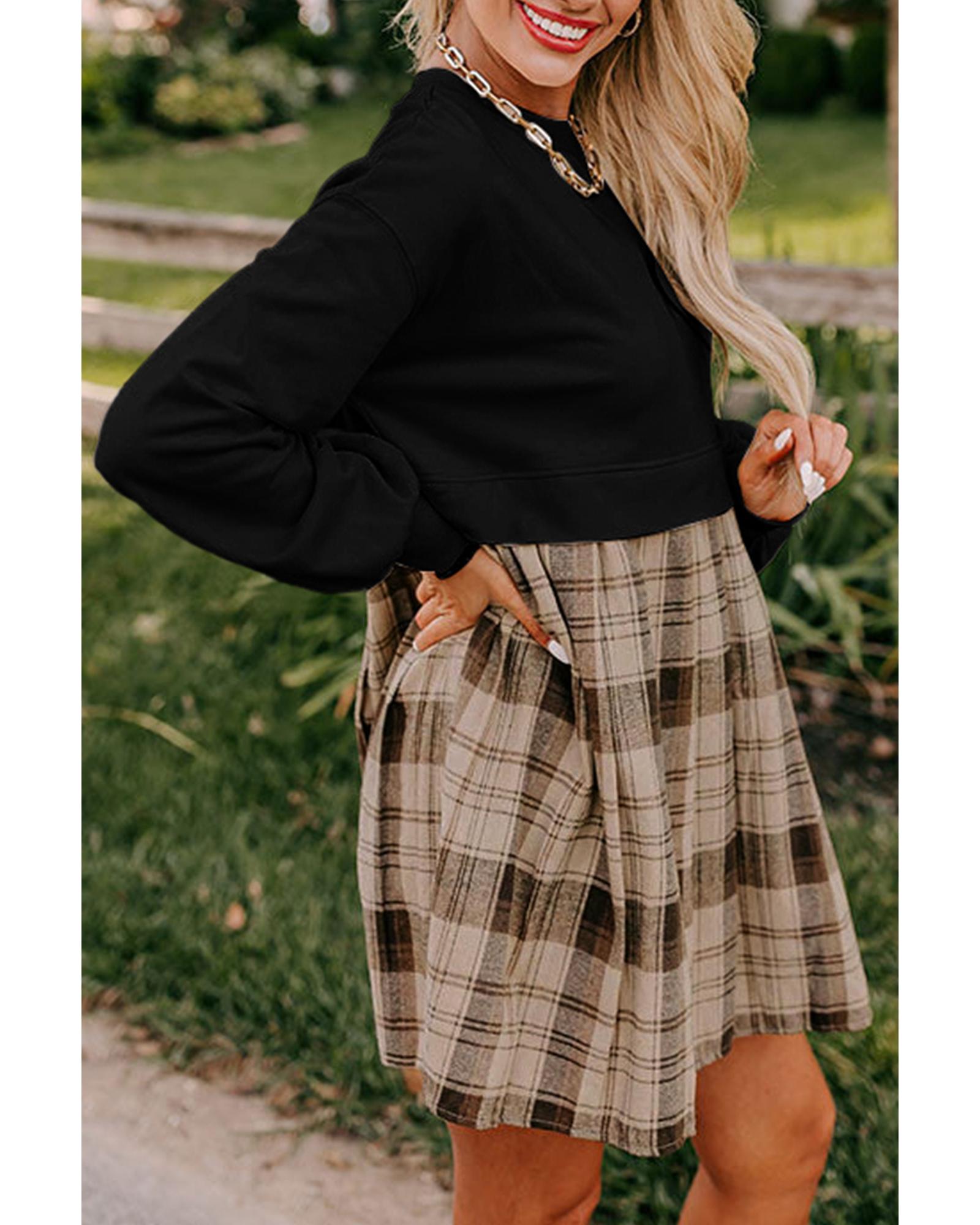 Black Plaid Patchwork High Waist Sweatshirt Mini Dress - M