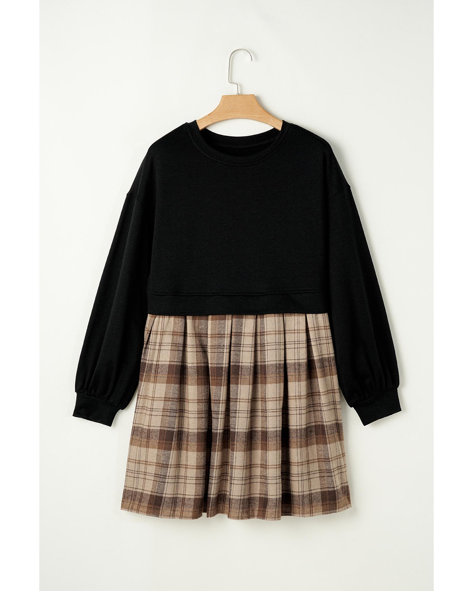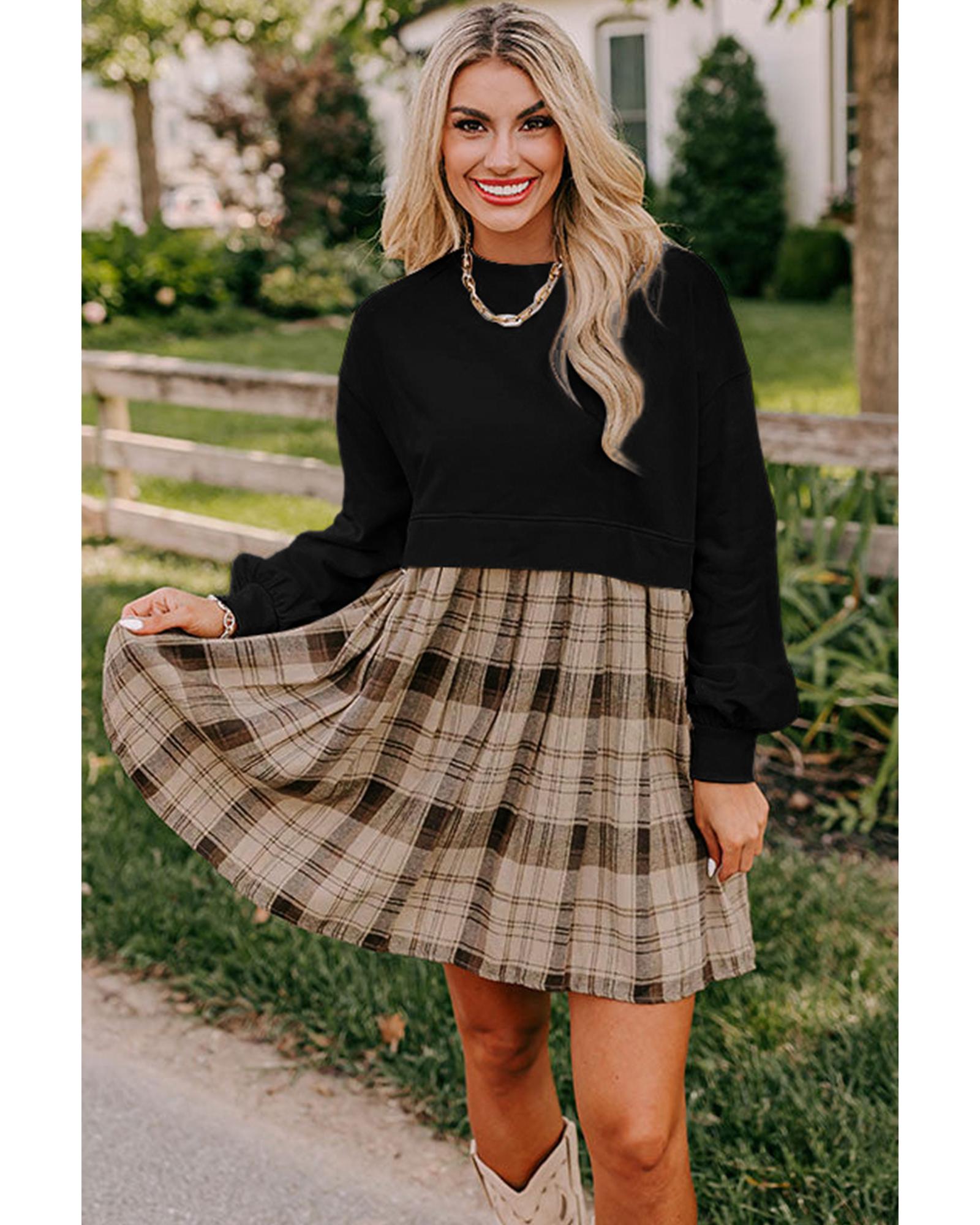 Black Plaid Patchwork High Waist Sweatshirt Mini Dress - S