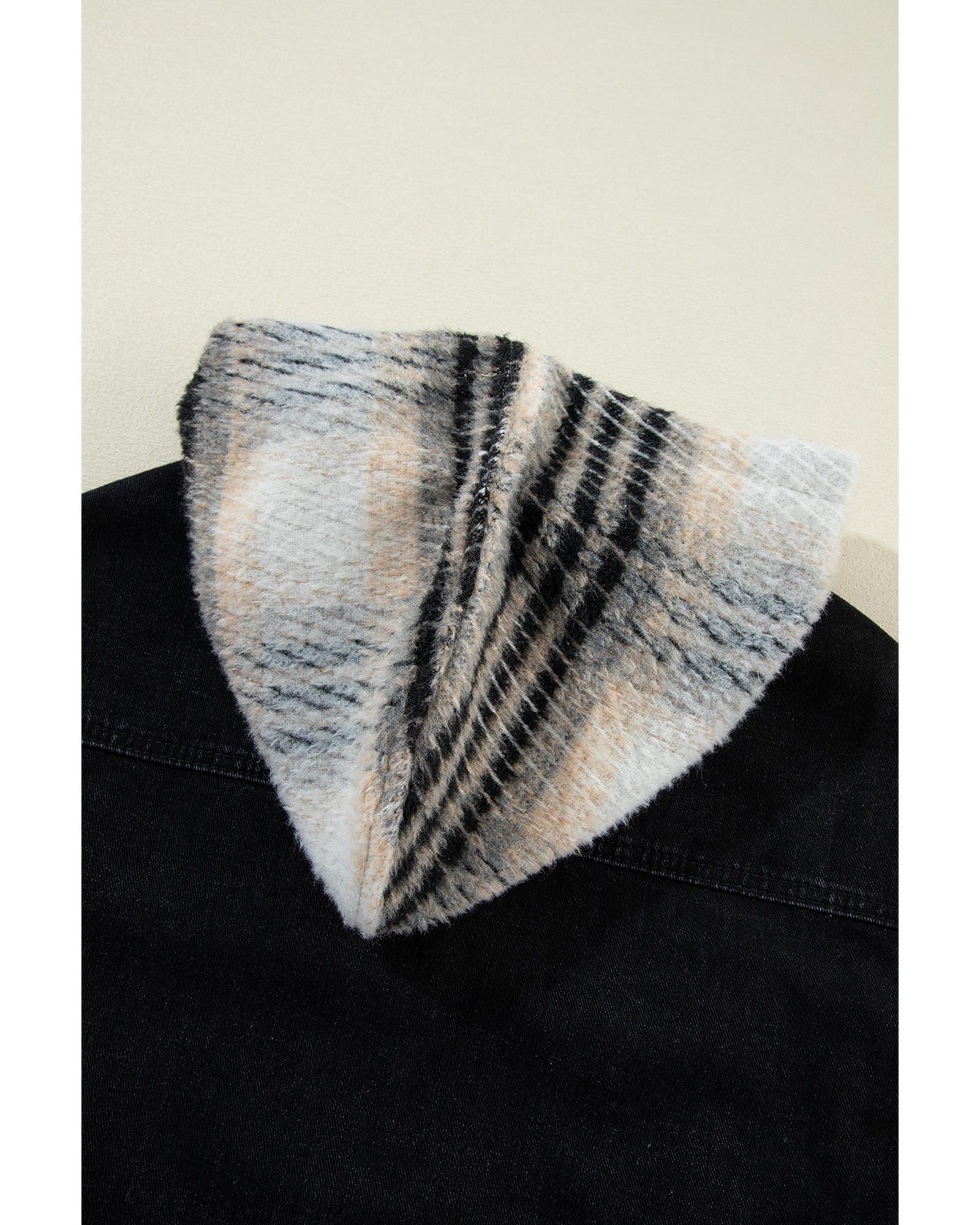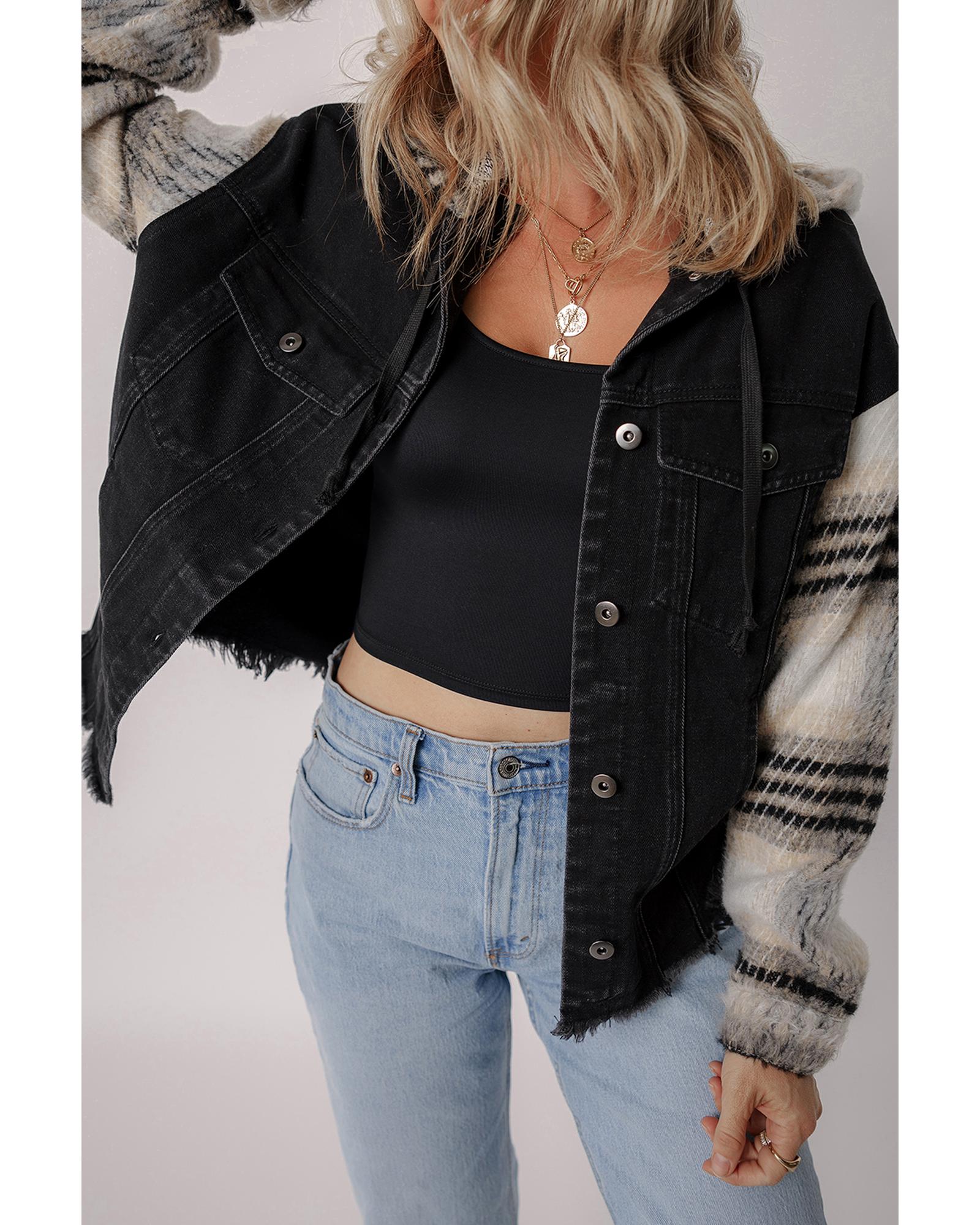 - Black Plaid Sleeve Frayed Hem Hooded Denim Jacket