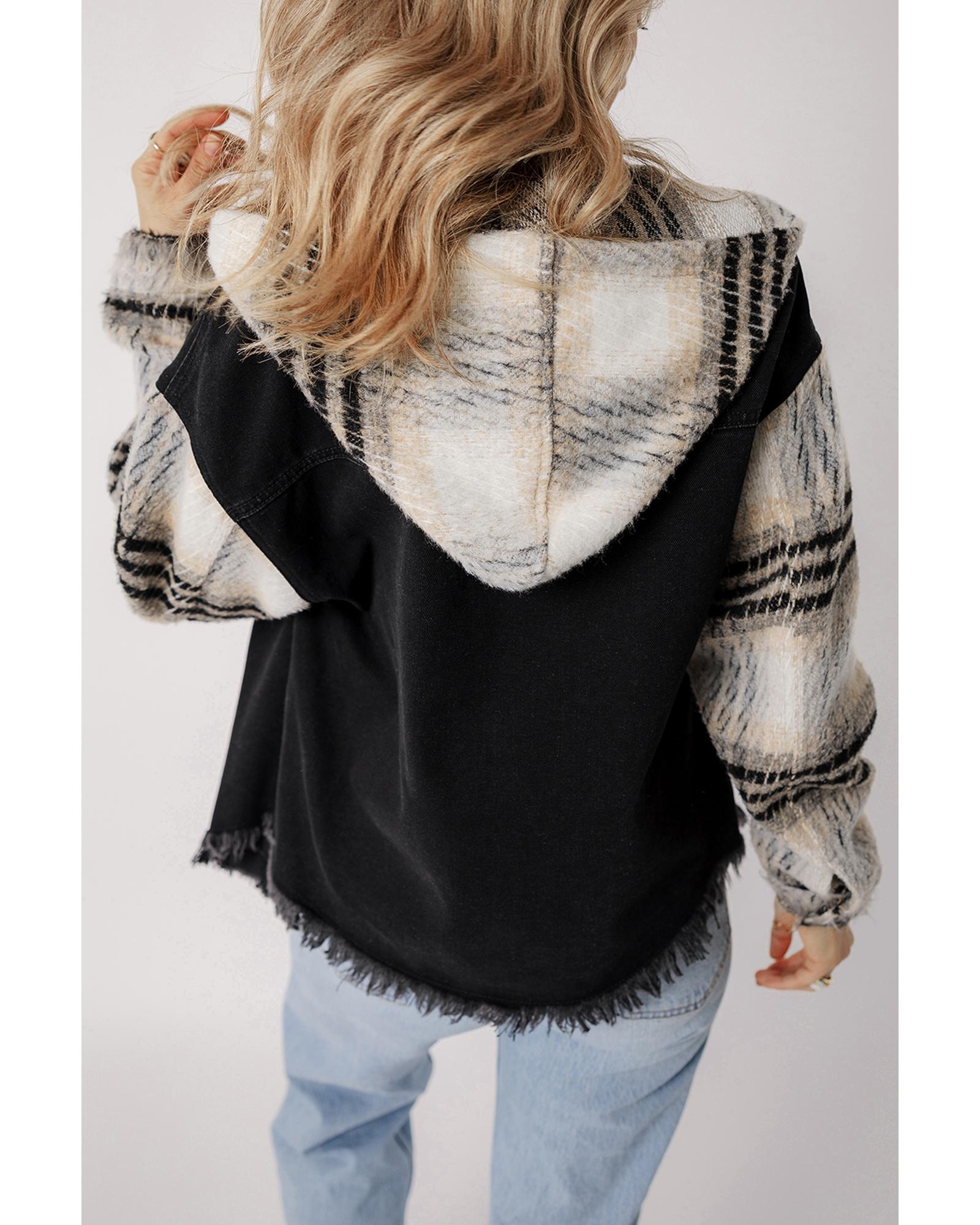 - Black Plaid Sleeve Frayed Hem Hooded Denim Jacket