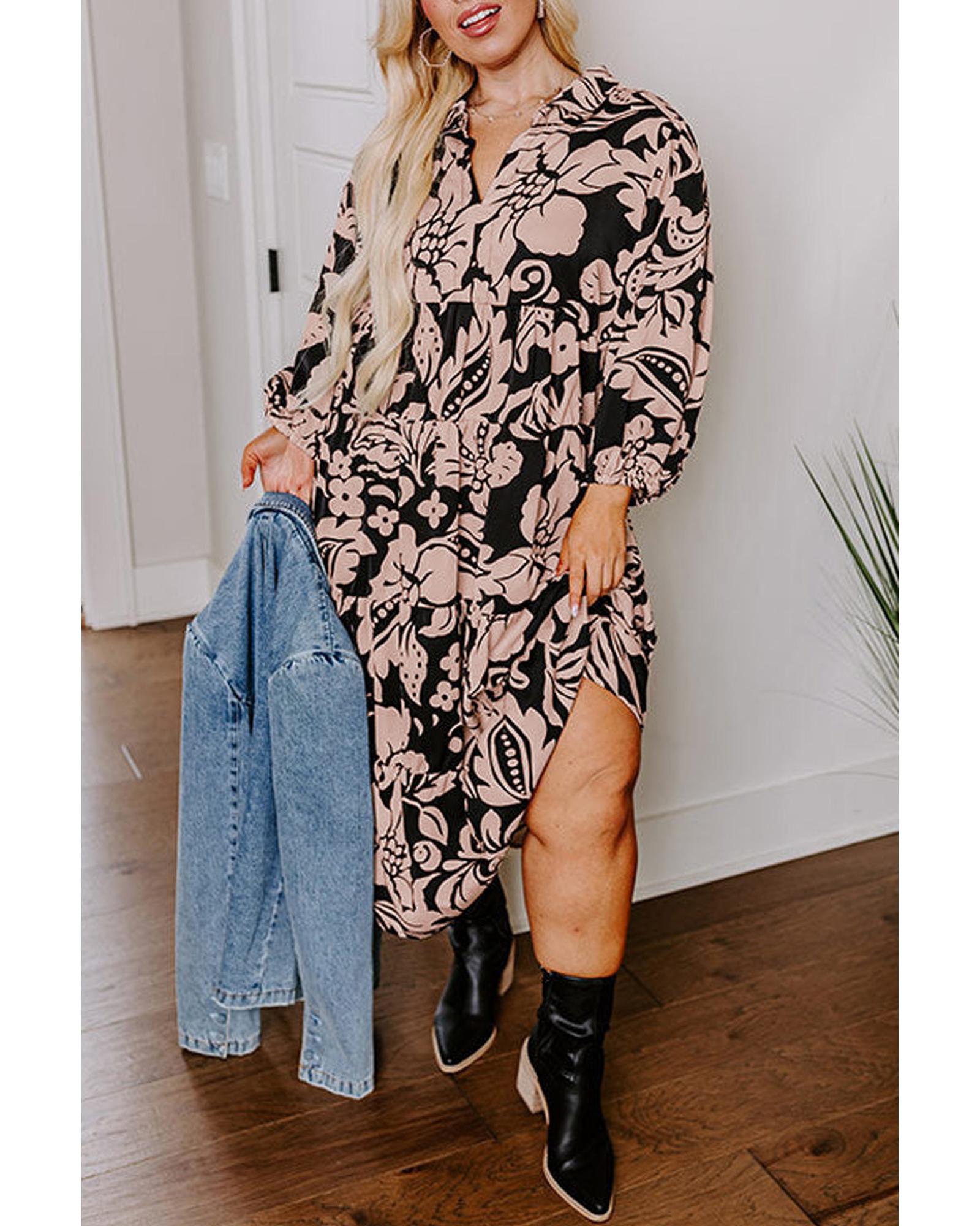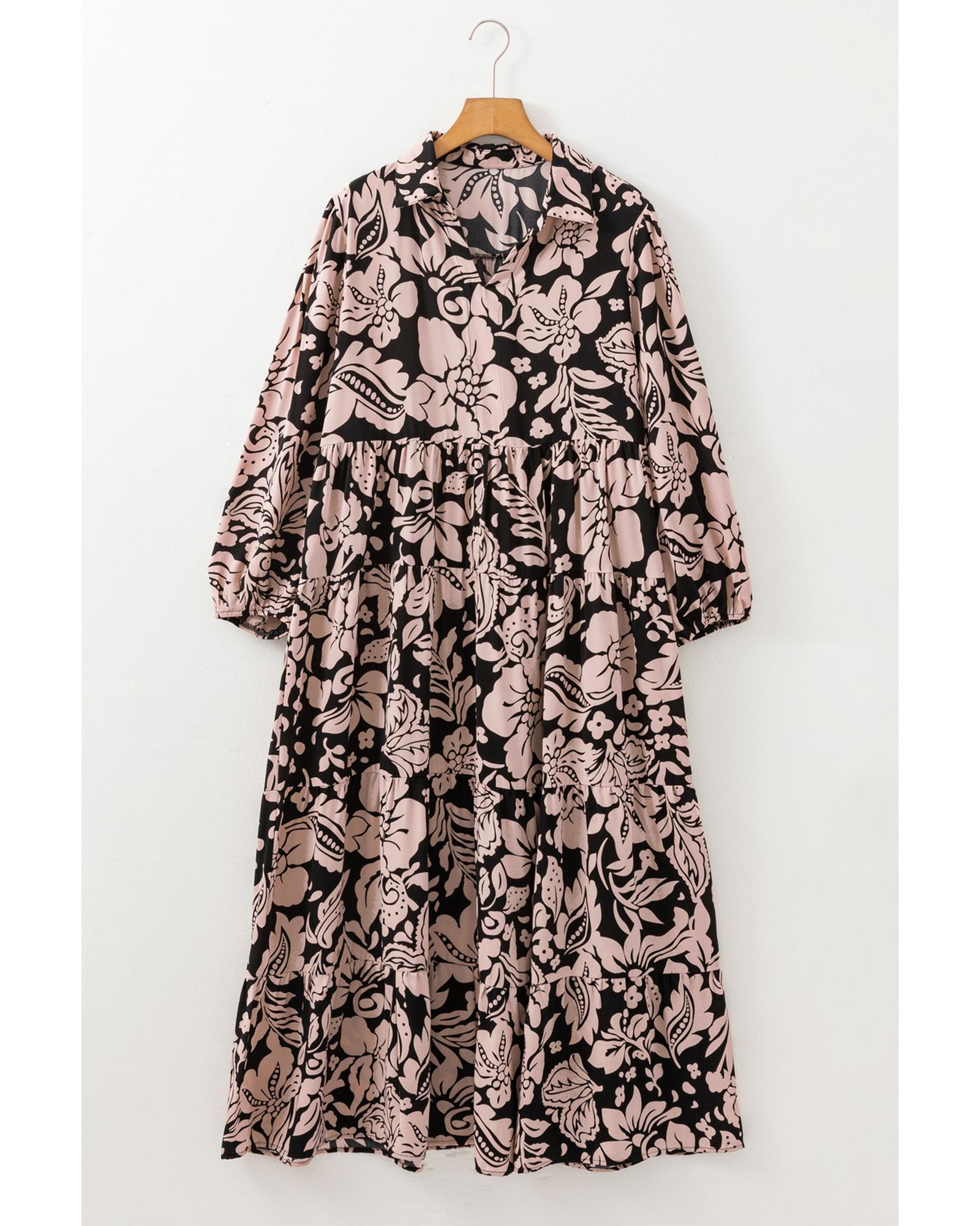 - Black Plus Size Floral Printed Puff Sleeve Collared Maxi Dress