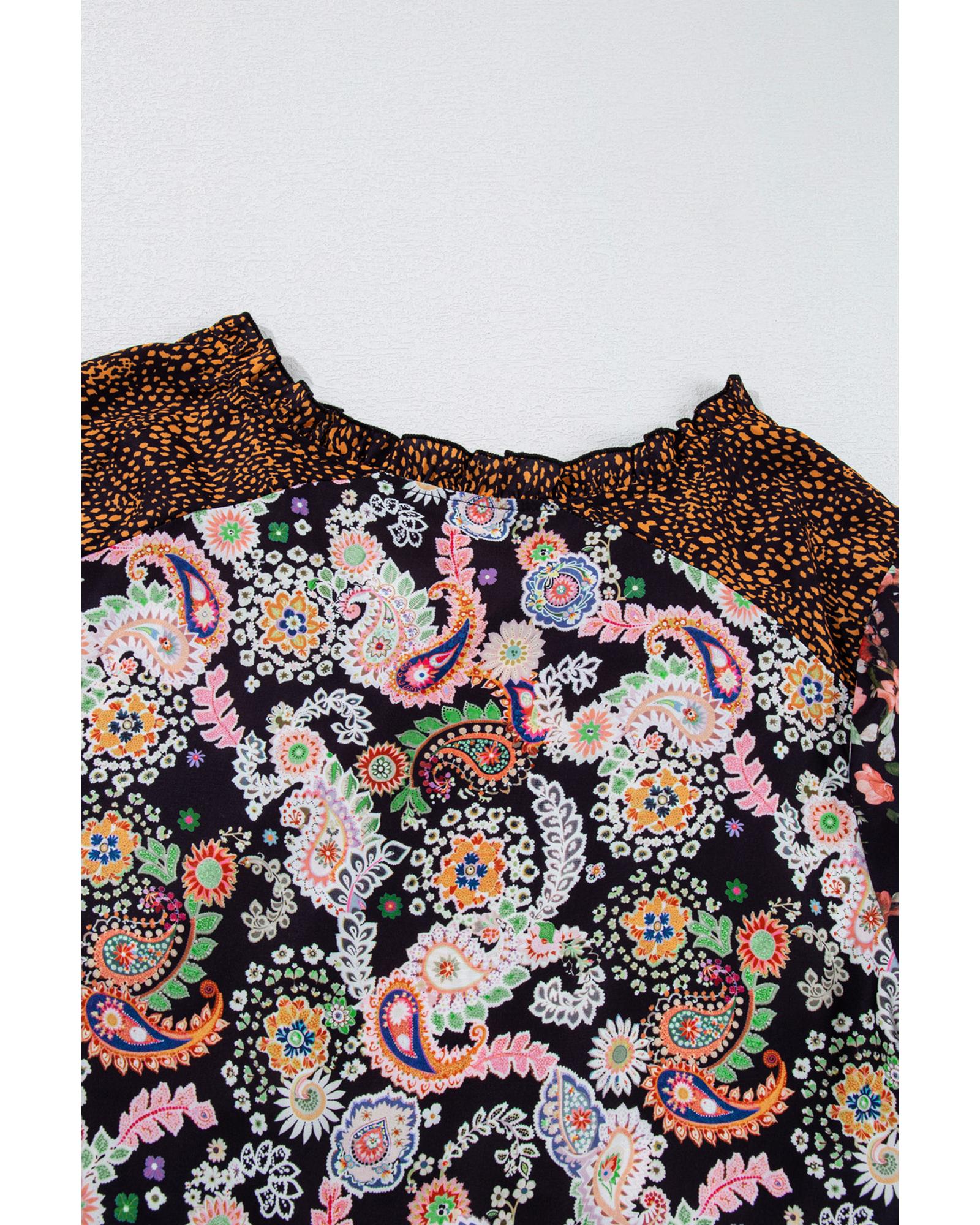Black Plus Size Paisley Floral Print V Neck Bubble Sleeve Blouse – 3X