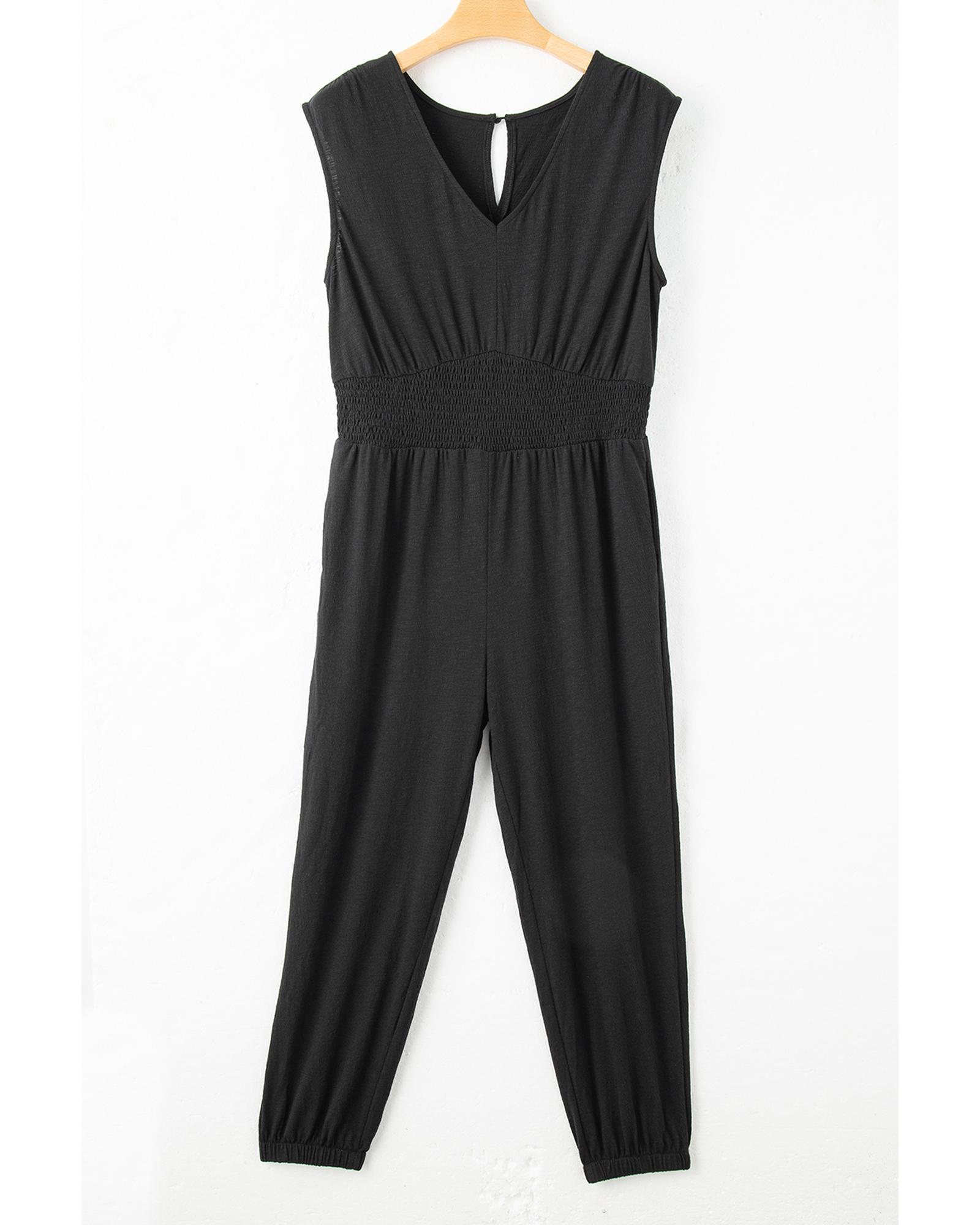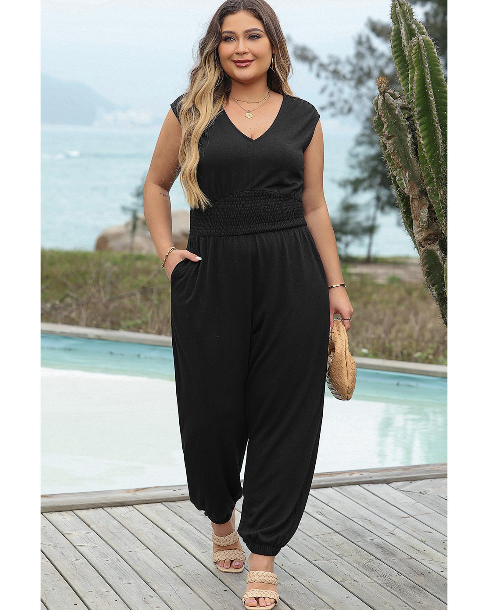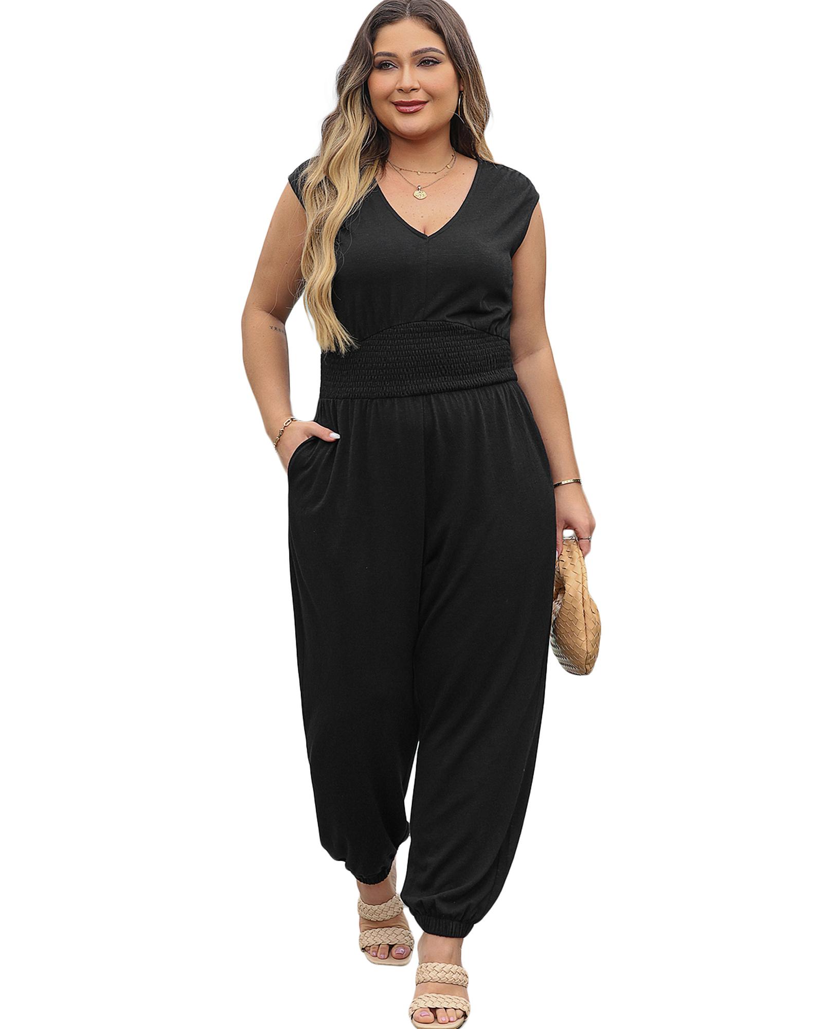 Black Plus Smocked High Waist Sleeveless V Neck Jumpsuit – 3X