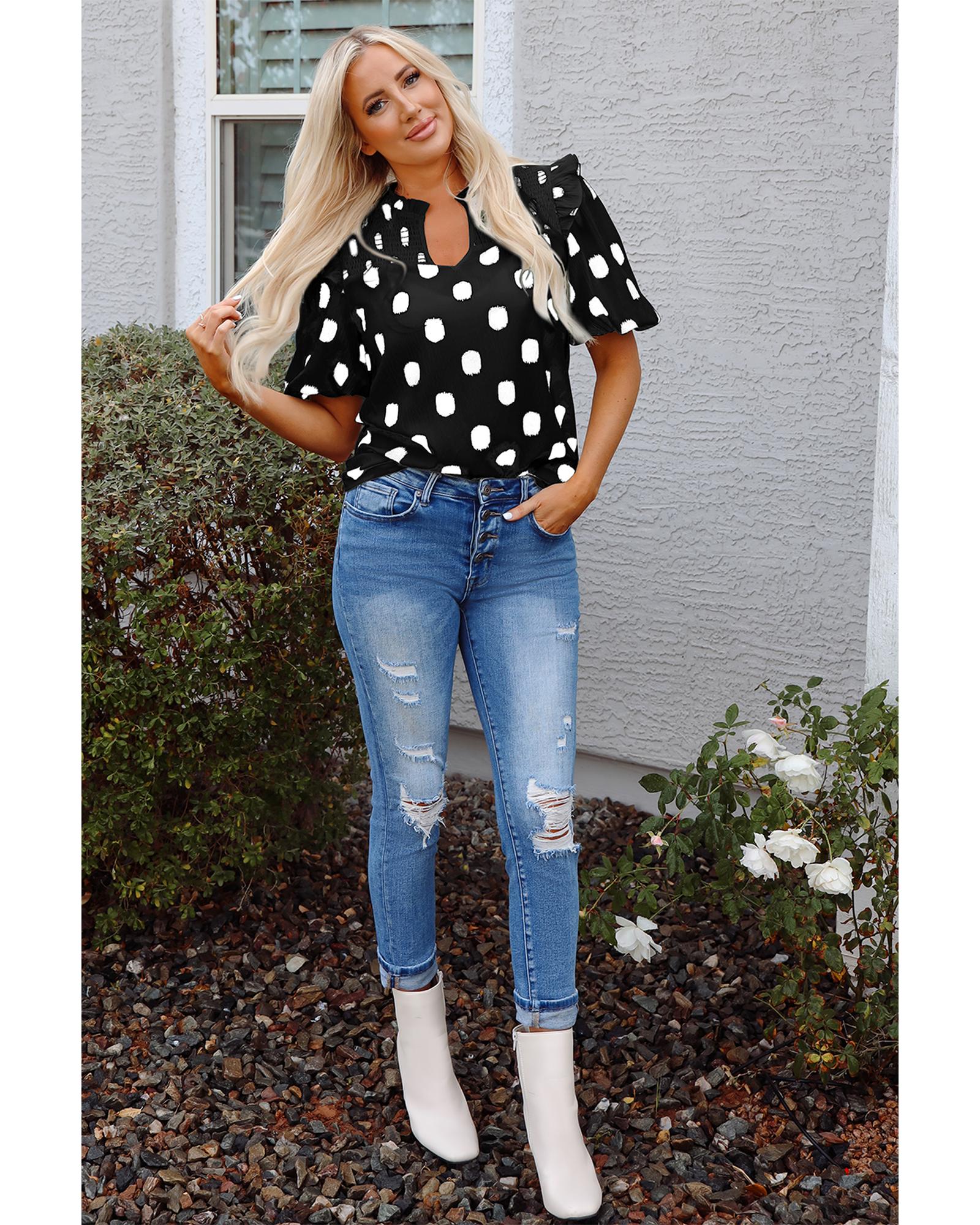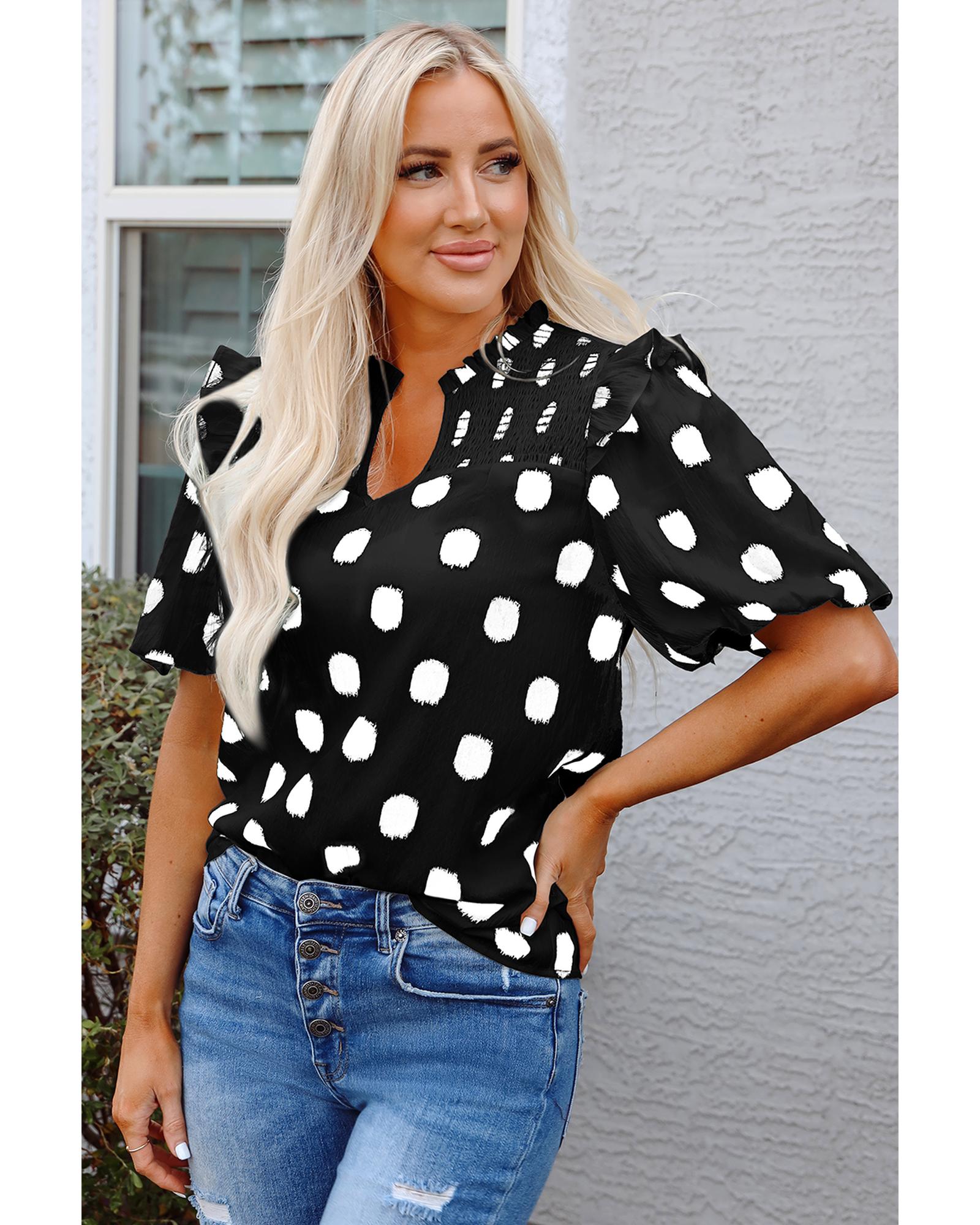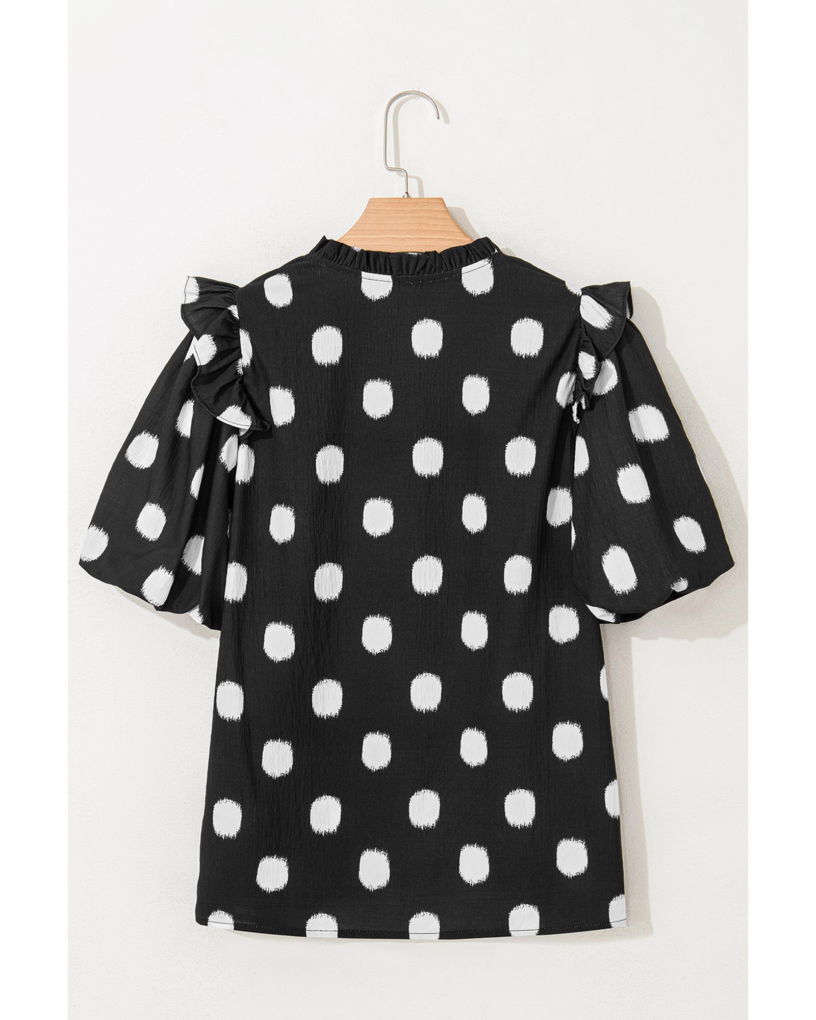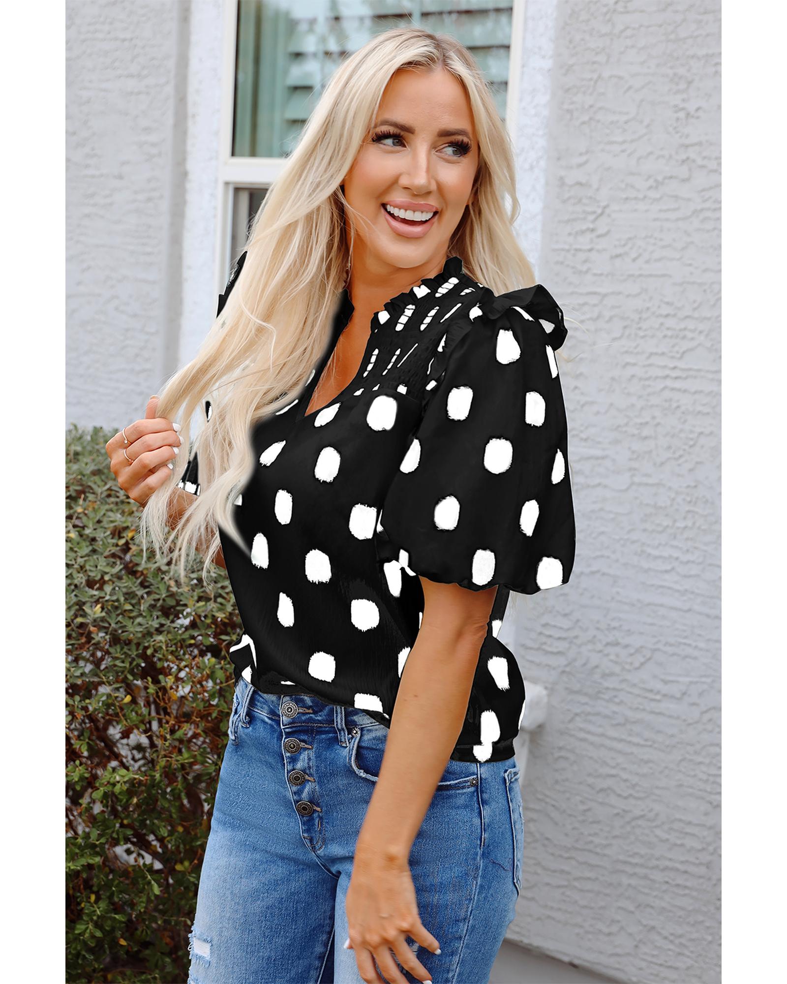 Black Polka Dot Print Shirred Yoke Notched Neck Balloon Sleeve Blouse – S