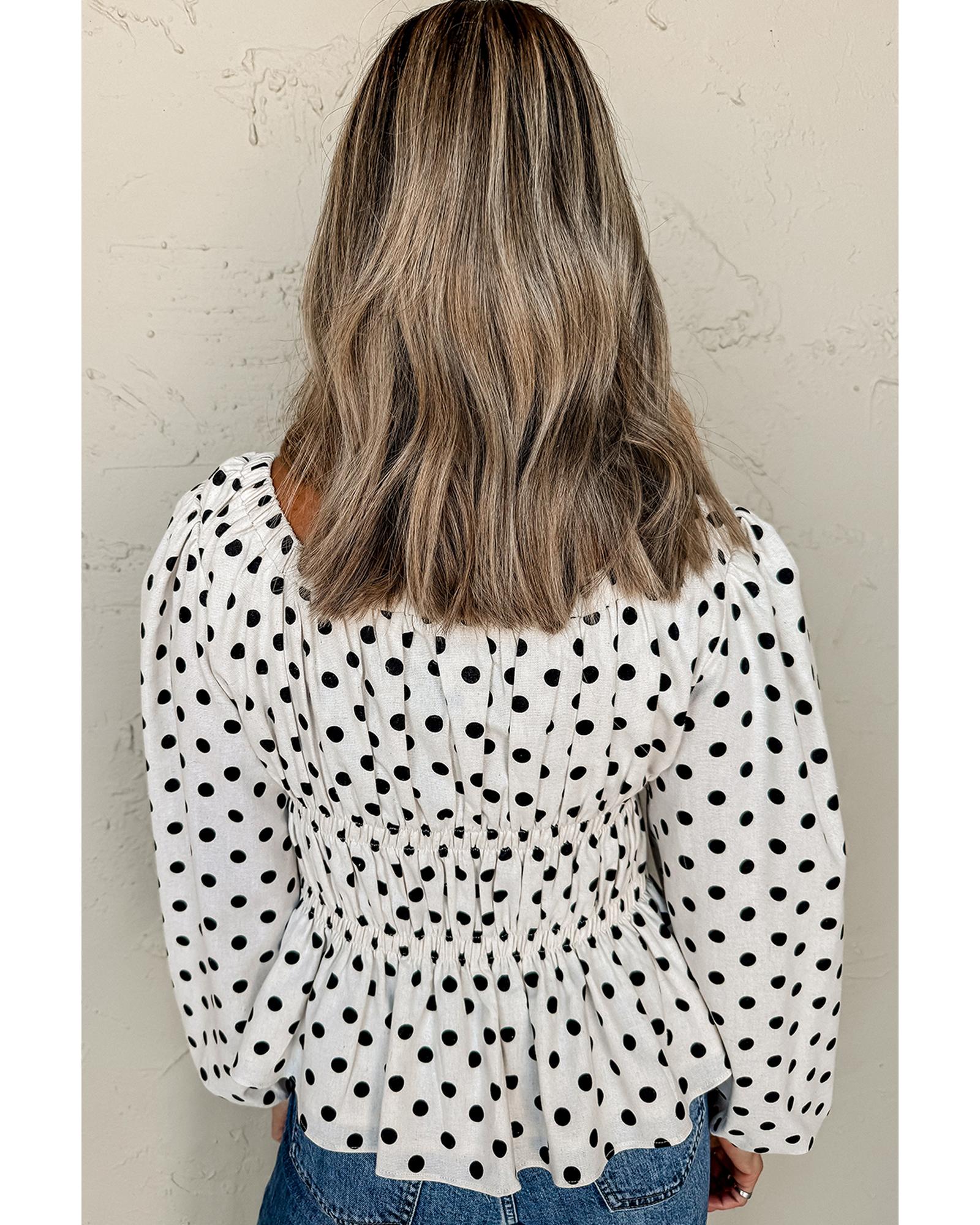 Black Polka Dot Puff Sleeve Bow Square Neck Peplum Top – L