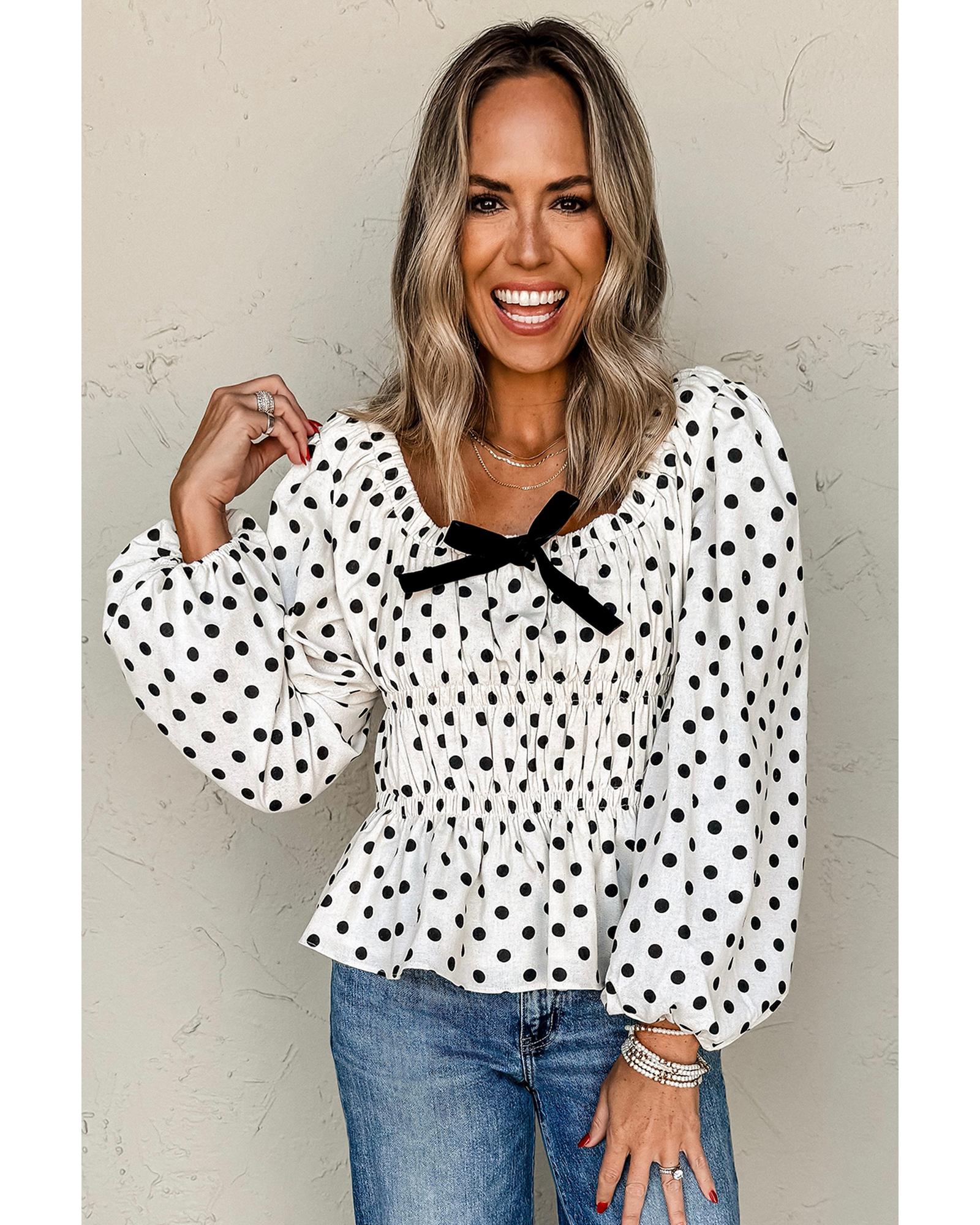 Black Polka Dot Puff Sleeve Bow Square Neck Peplum Top – M