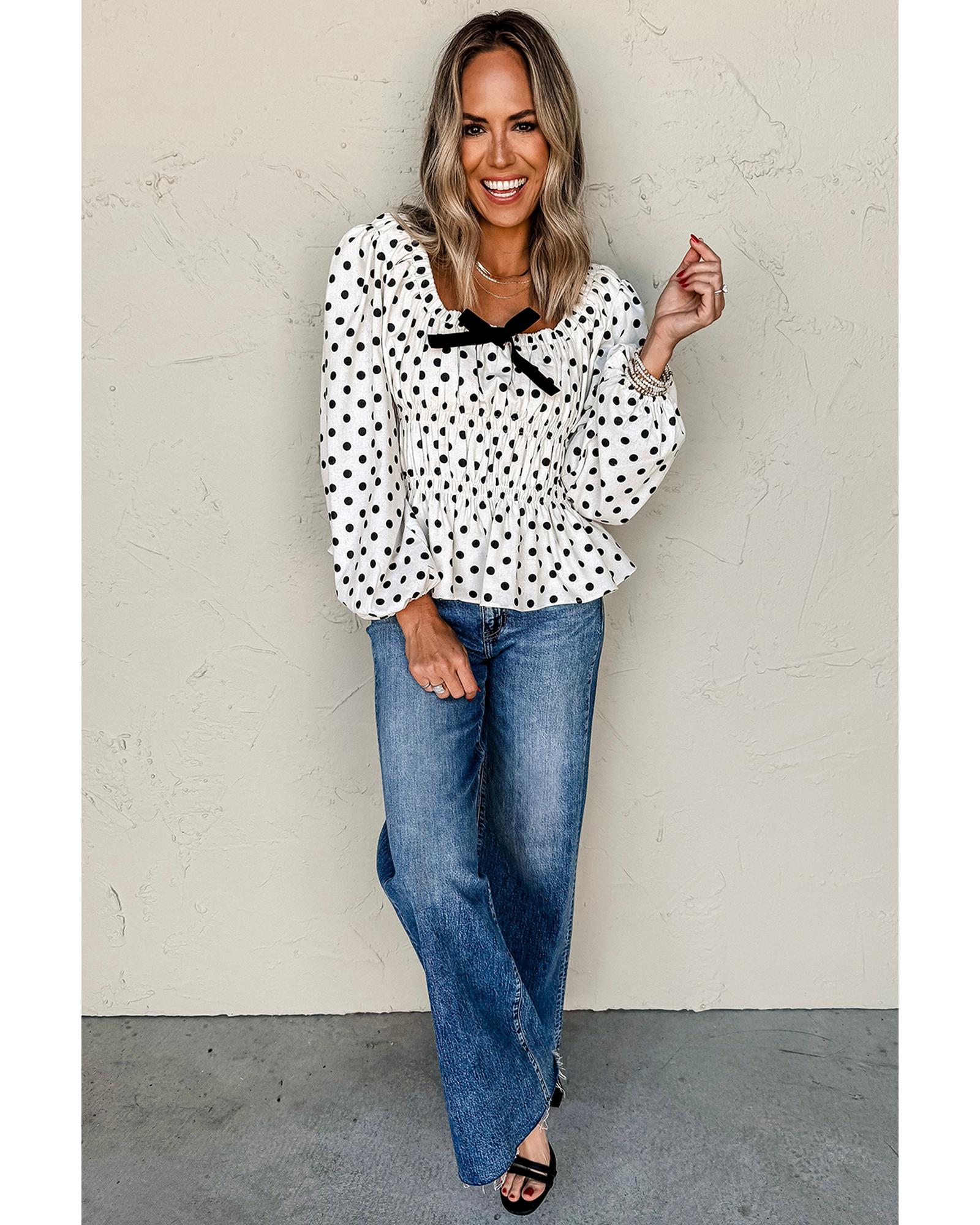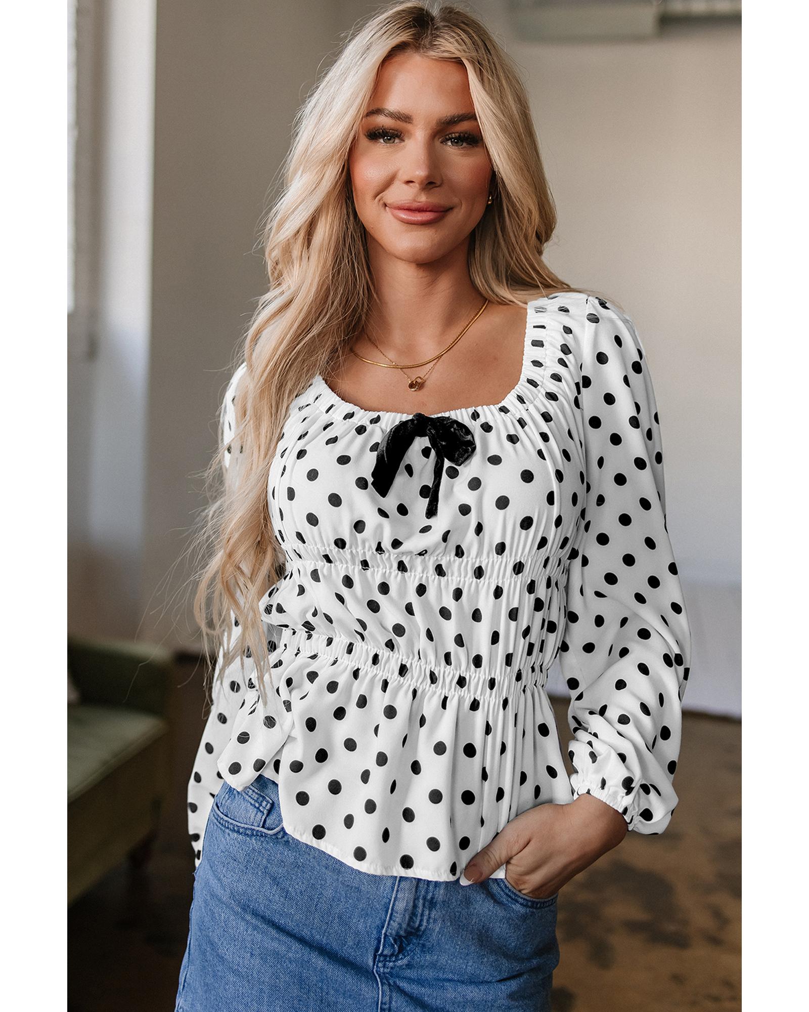 Black Polka Dot Puff Sleeve Bow Square Neck Peplum Top – XL