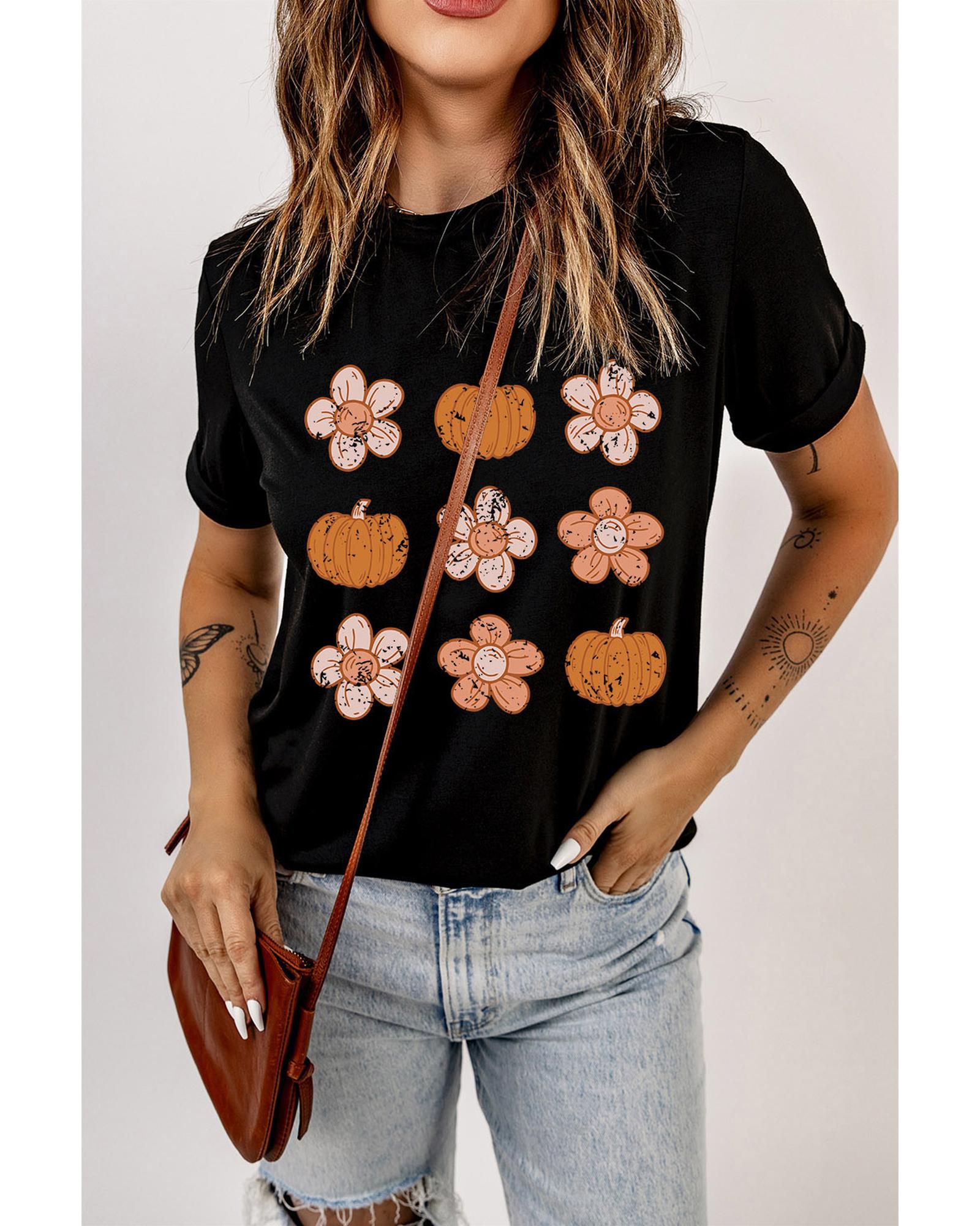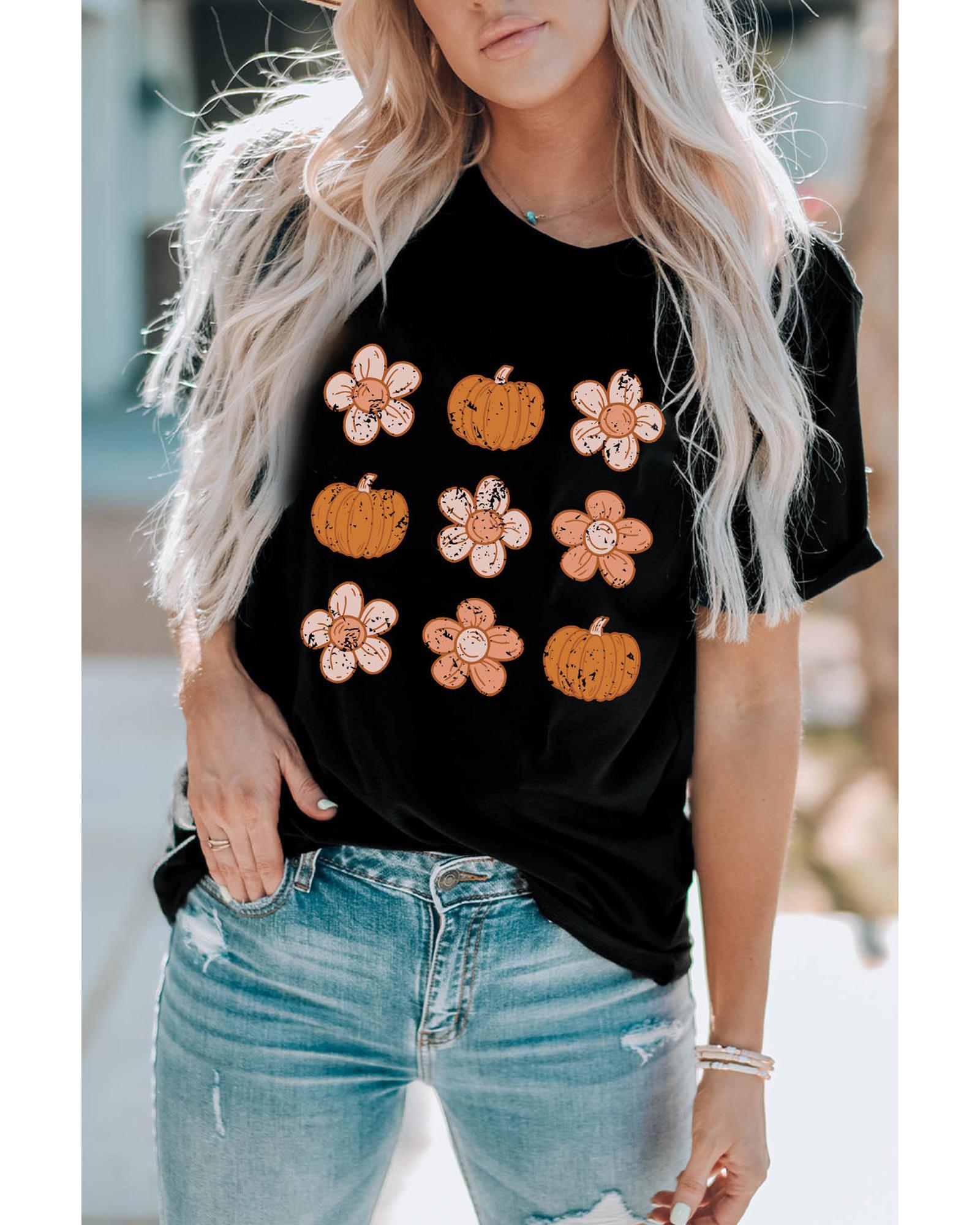 Stylish and trendy Black Pumpkin Flower Print Short Sleeve Graphic Top Made with high - quality materials for a comfortable fit Flattering silhouette enhances your figure Unique pumpkin flower print adds a touch of femininity Versatile and easy to style for casual or dressier occasions Available in various sizes for the perfect fit