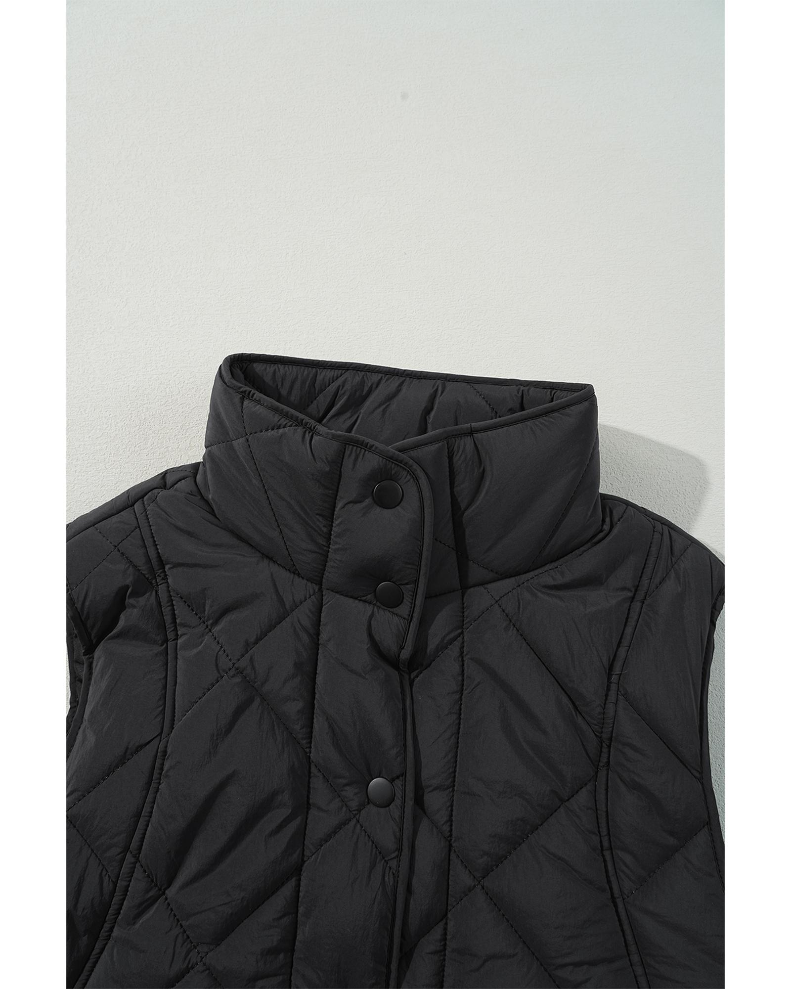 - Black quilted high neck button up pocket vest coat