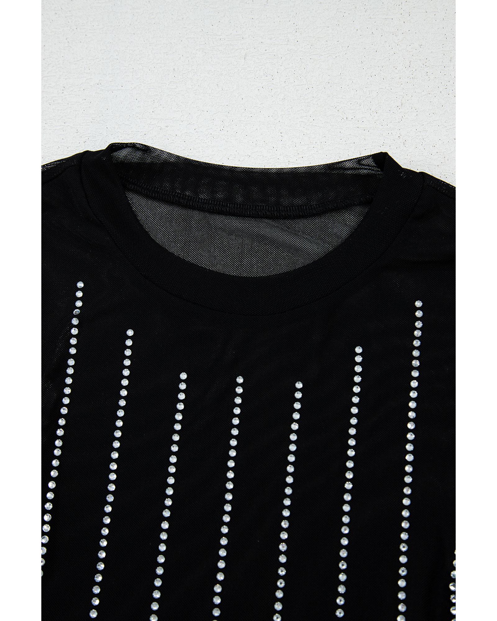 Black Rhinestone Decor Striped Mesh Long Sleeve Bodysuit – M