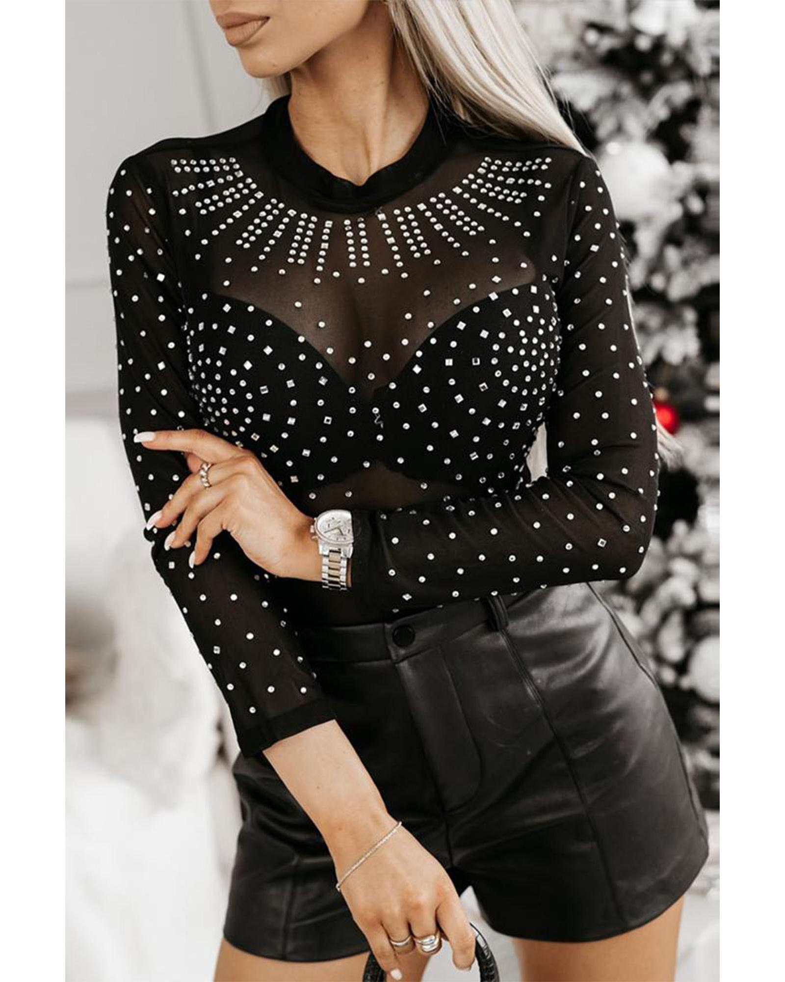 Black Rhinestone Sheer Mesh Long Sleeve Bodysuit – XL