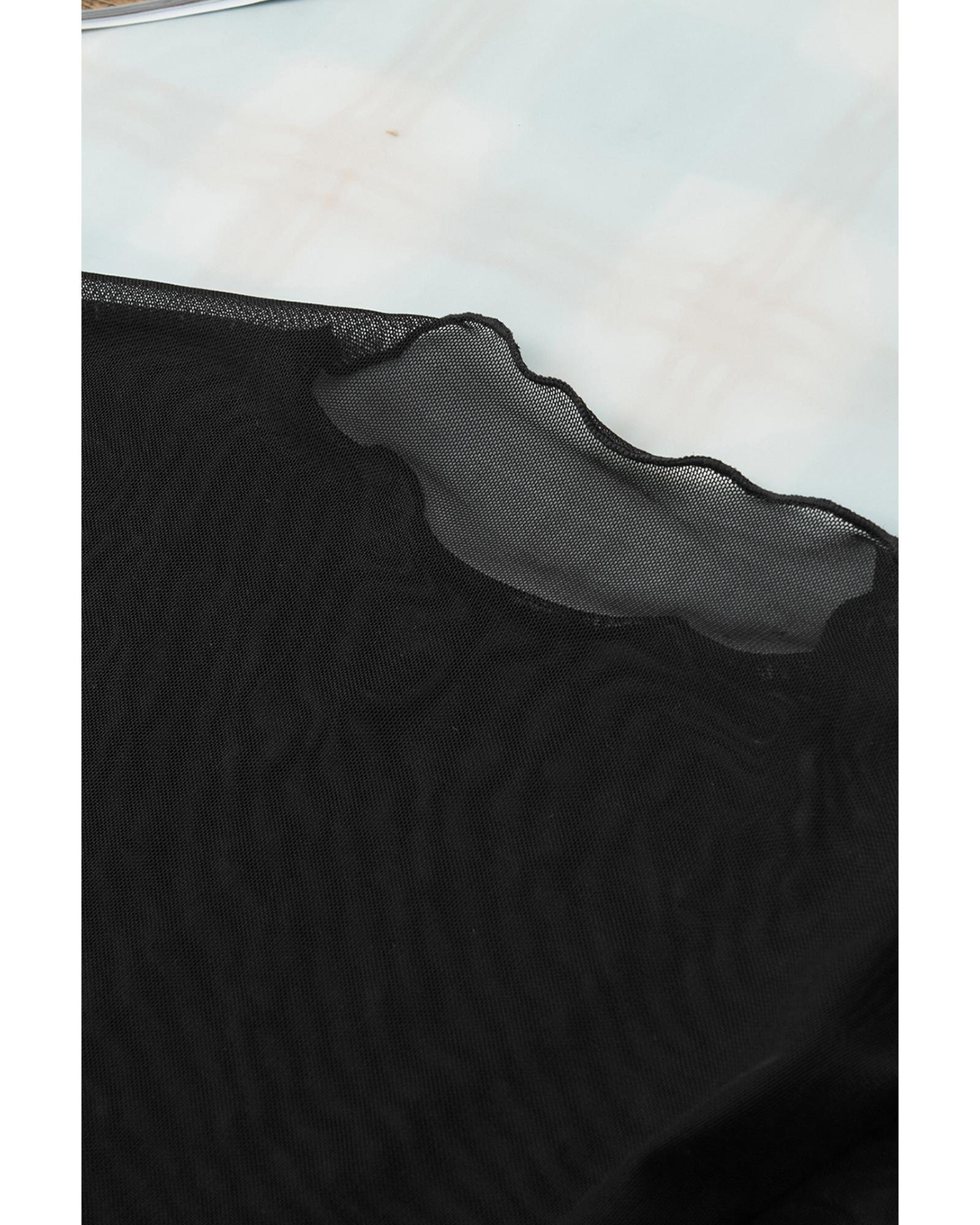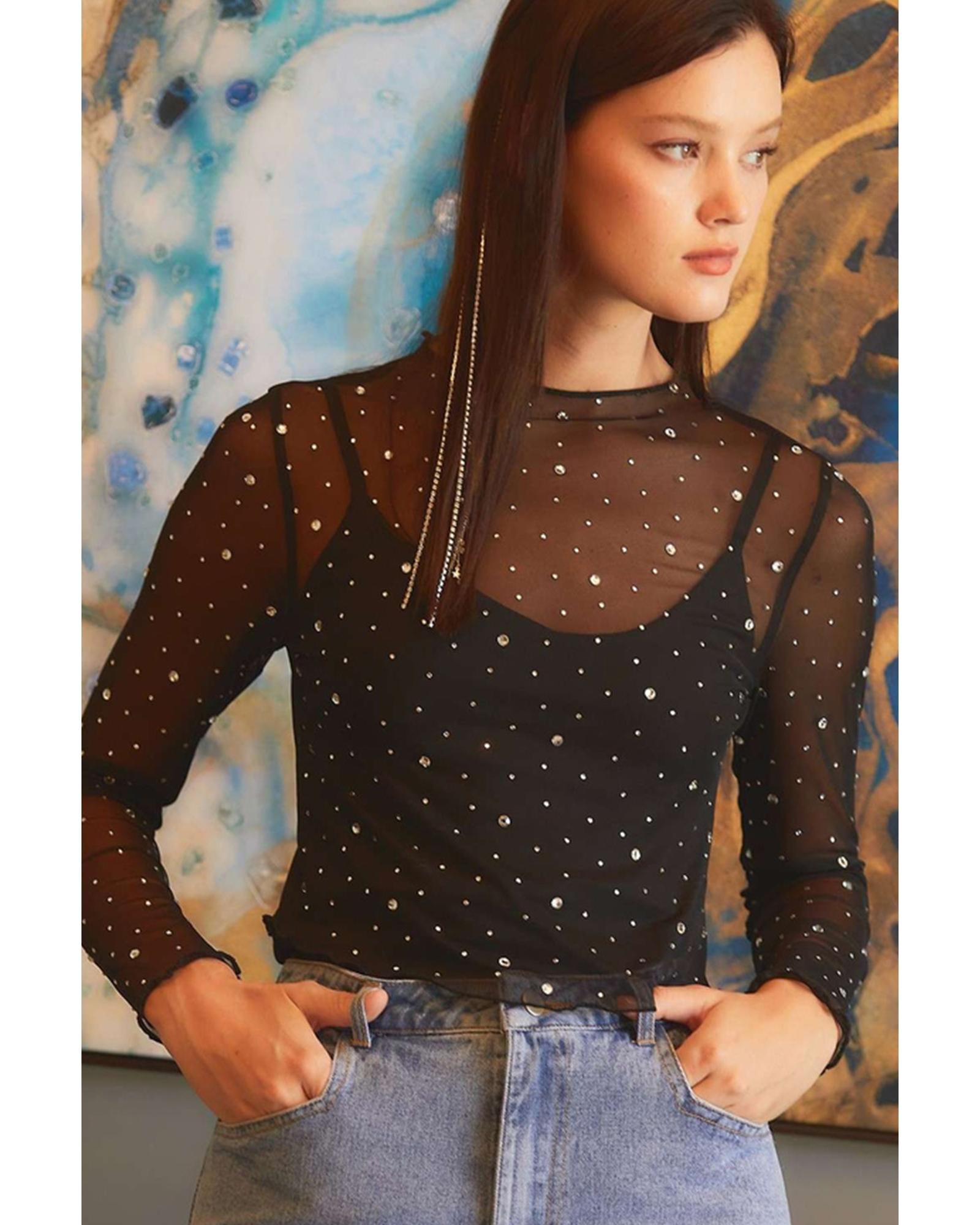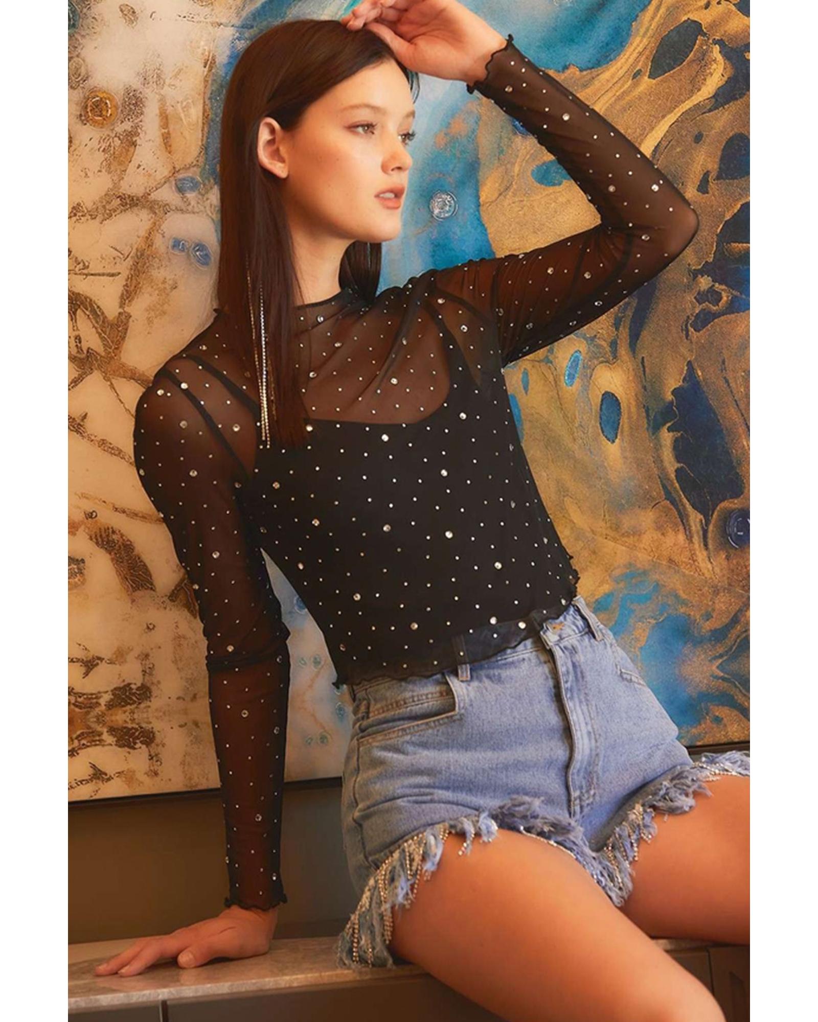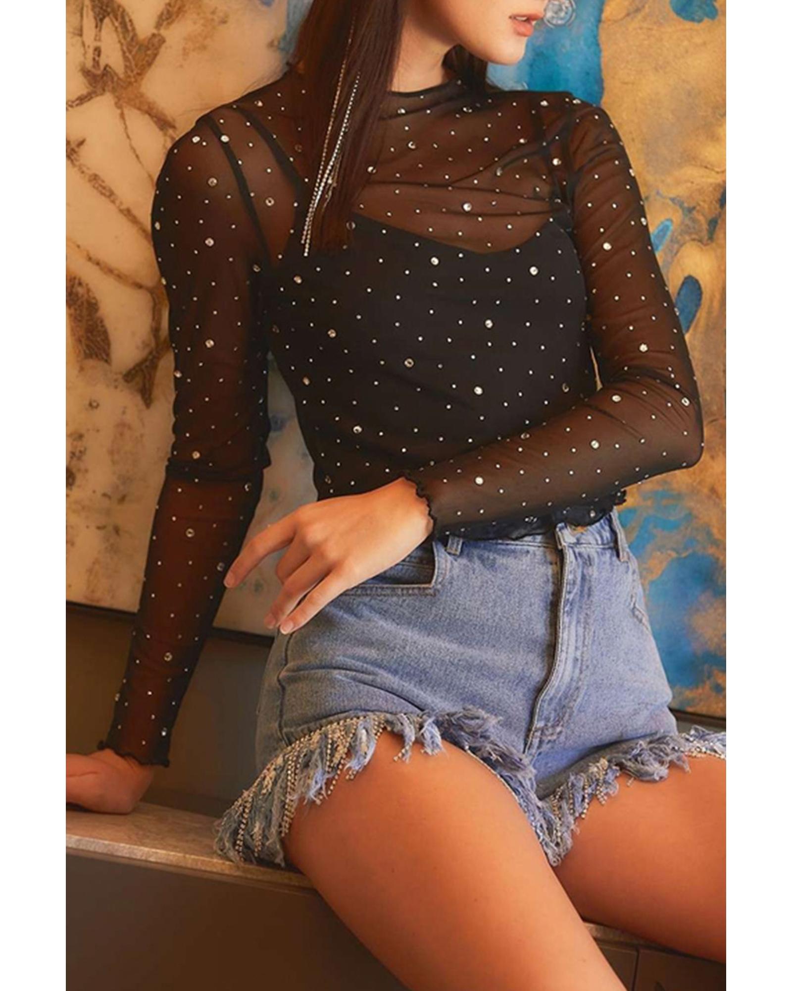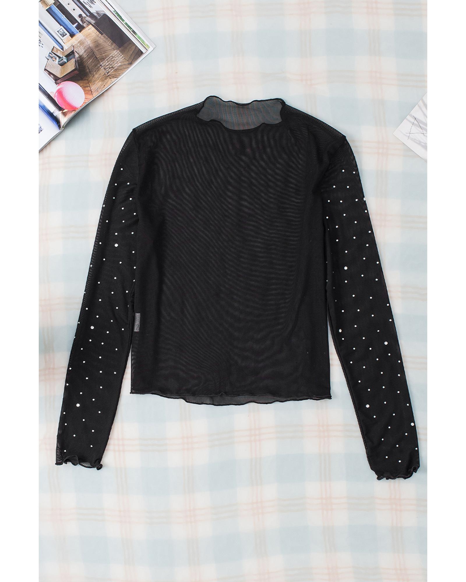 • Black Rhinestone Sheer Mesh Slim Fit Long Sleeve Top