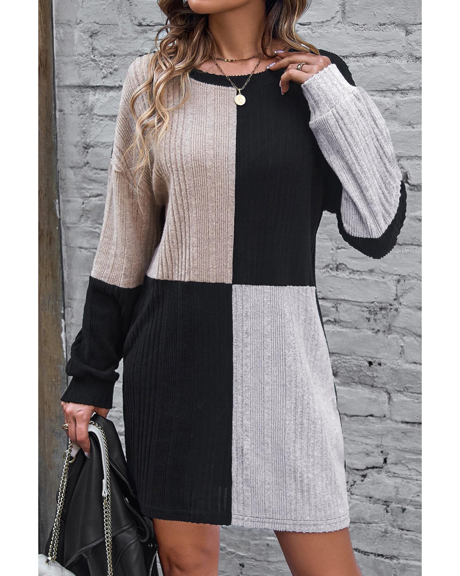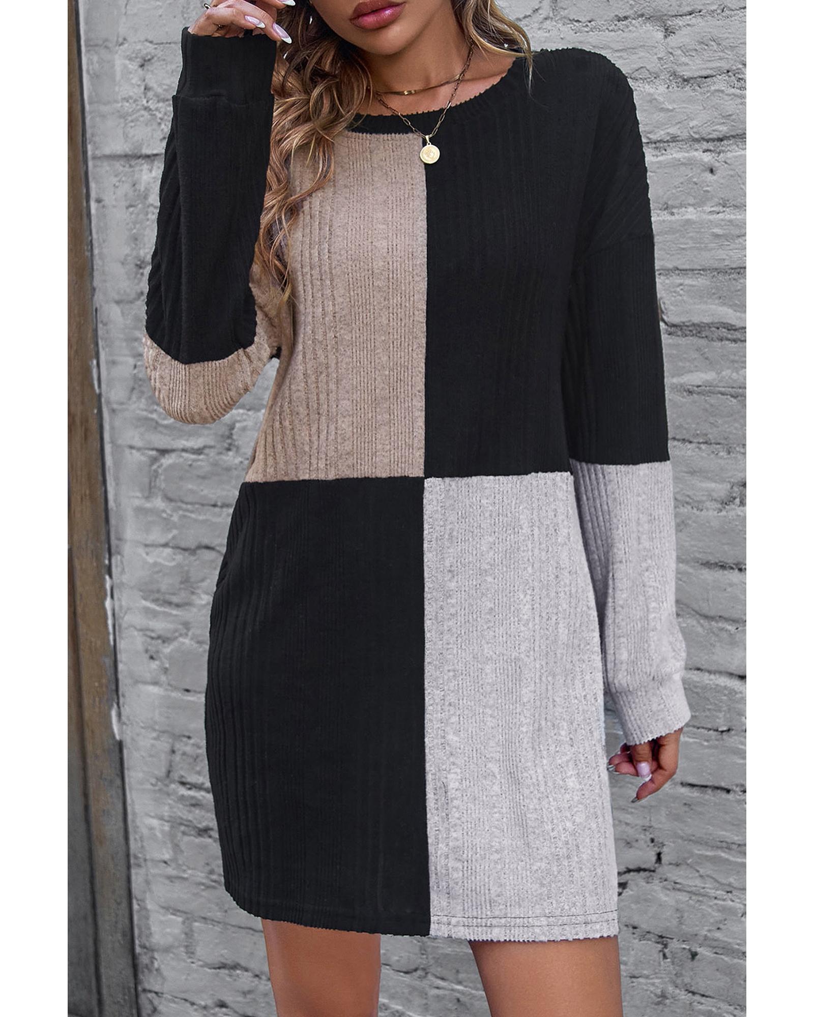 Black Ribbed Color Block Drop Shoulder Long Sleeve Mini Dress - S