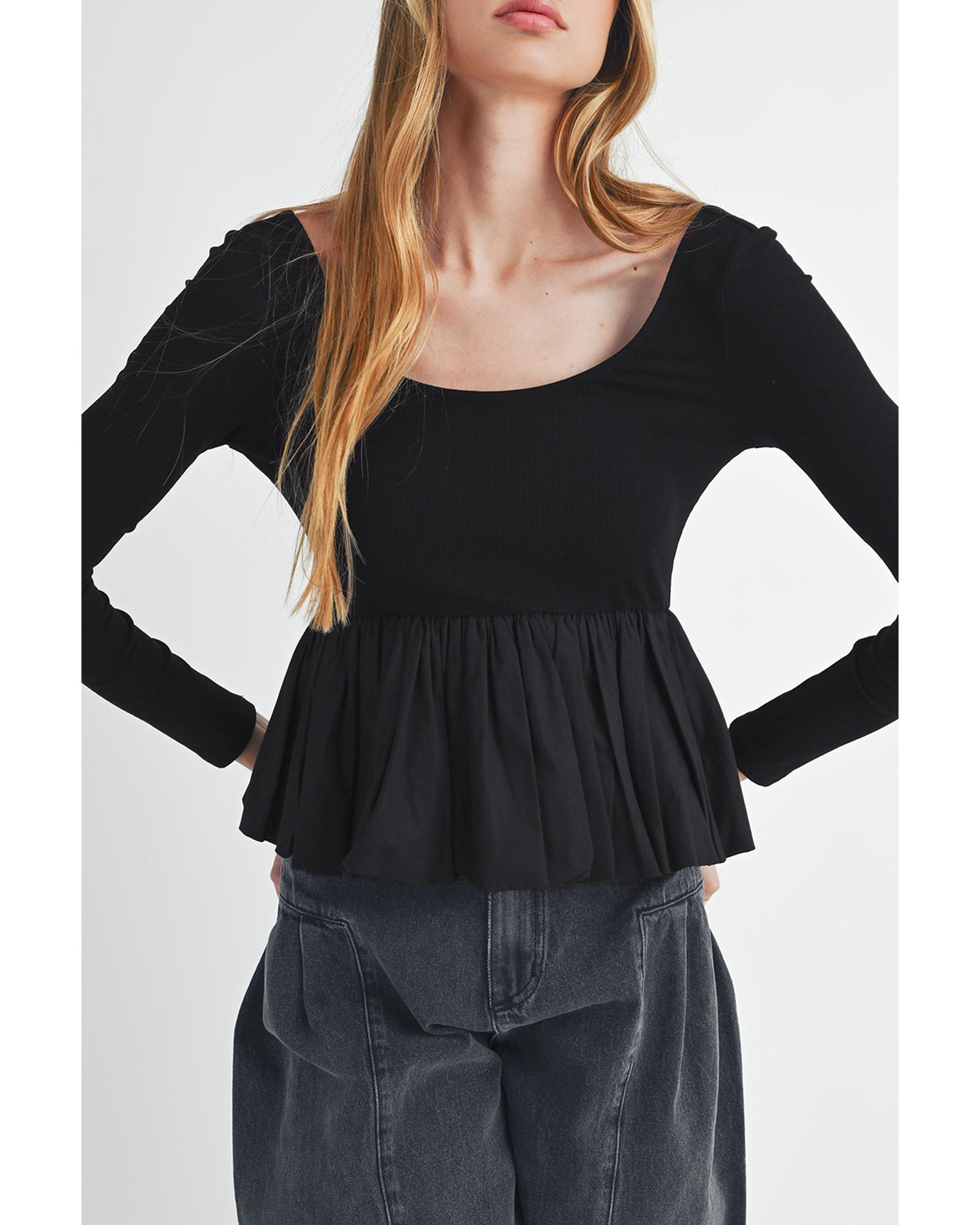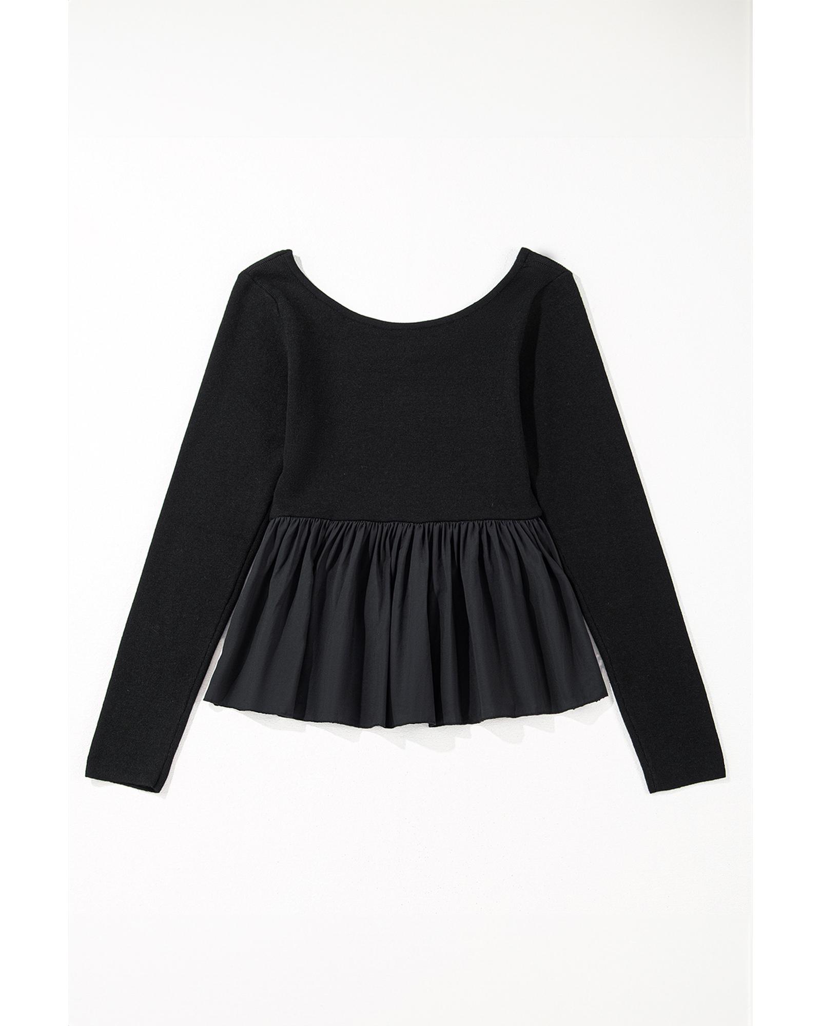Black Ribbed Knit Long Sleeve Scoop Neck Peplum Patchwork Top – M