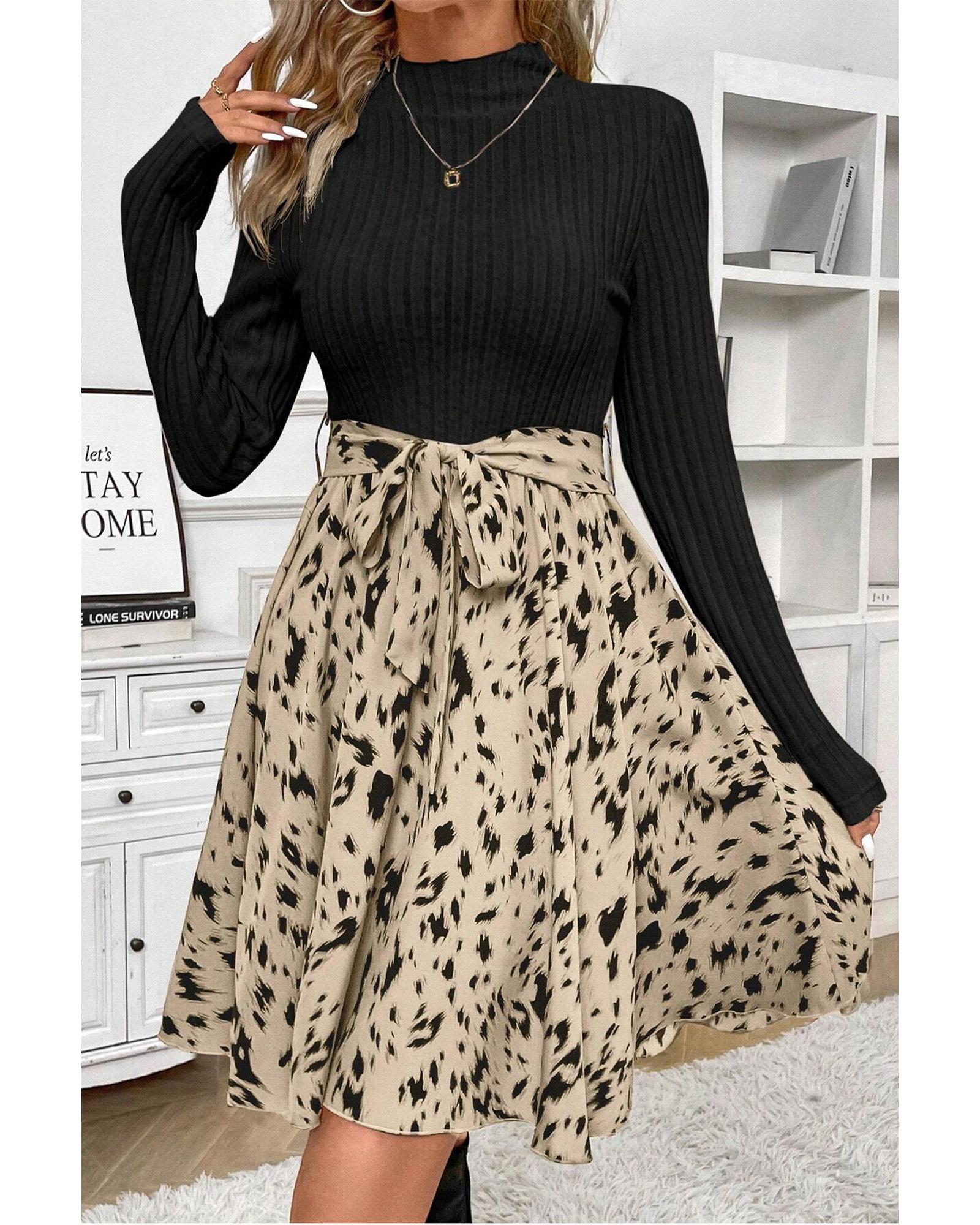 Black Ribbed Knit Patchwork Printed Belted A-line Dress – S