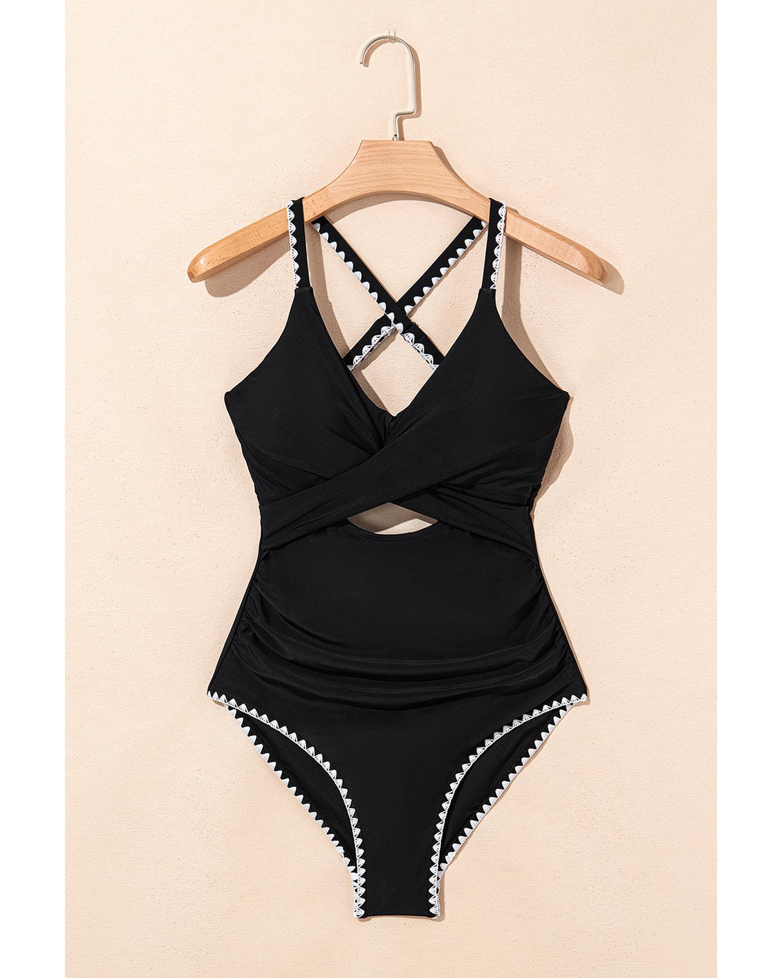 Black Ric Rac Trim Contrasted Patchwork Cutout One Piece Swimsuit – L