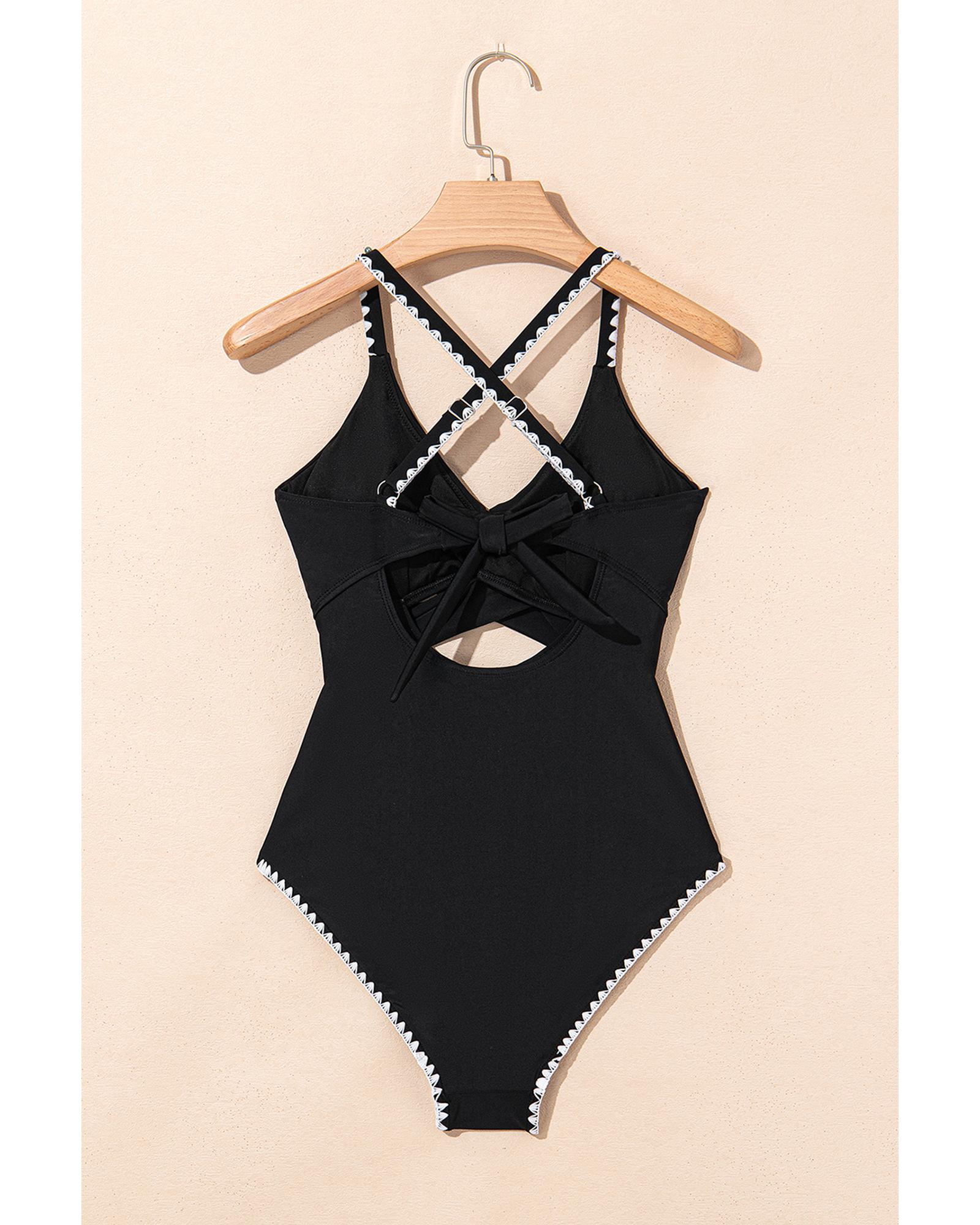 Black Ric Rac Trim Contrasted Patchwork Cutout One Piece Swimsuit – M