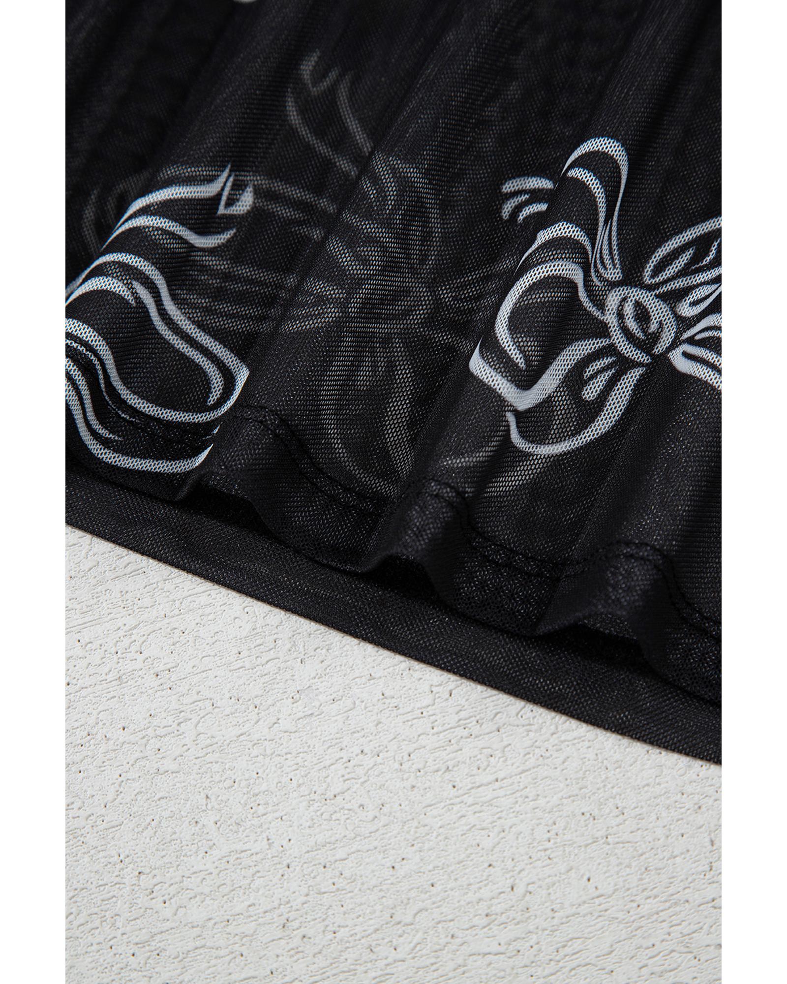 Black Round Neck Bow Print Long Sleeve Mesh Top – XL