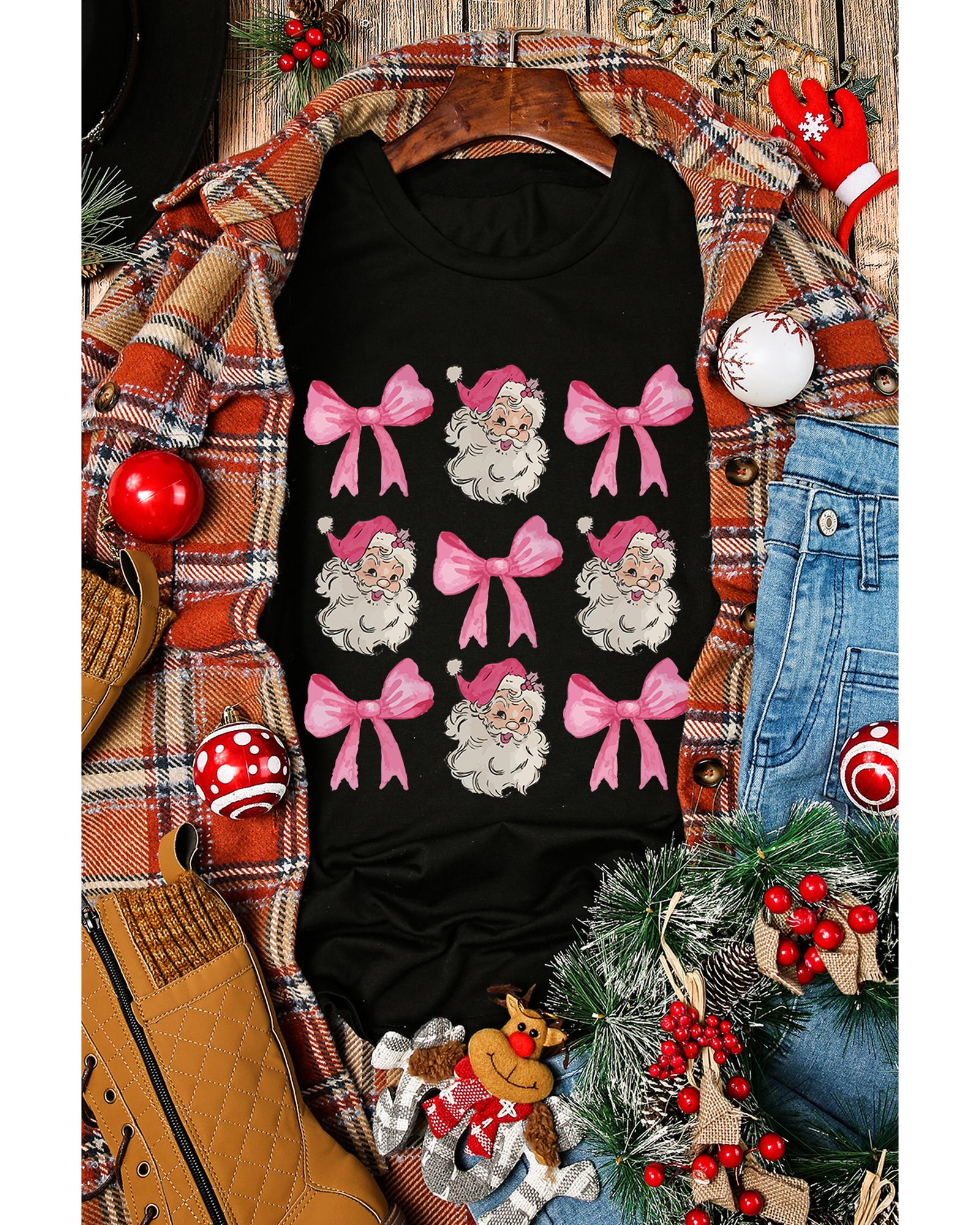 - Festive Black Santa Claus Bow Knot Christmas Graphic T Shirt