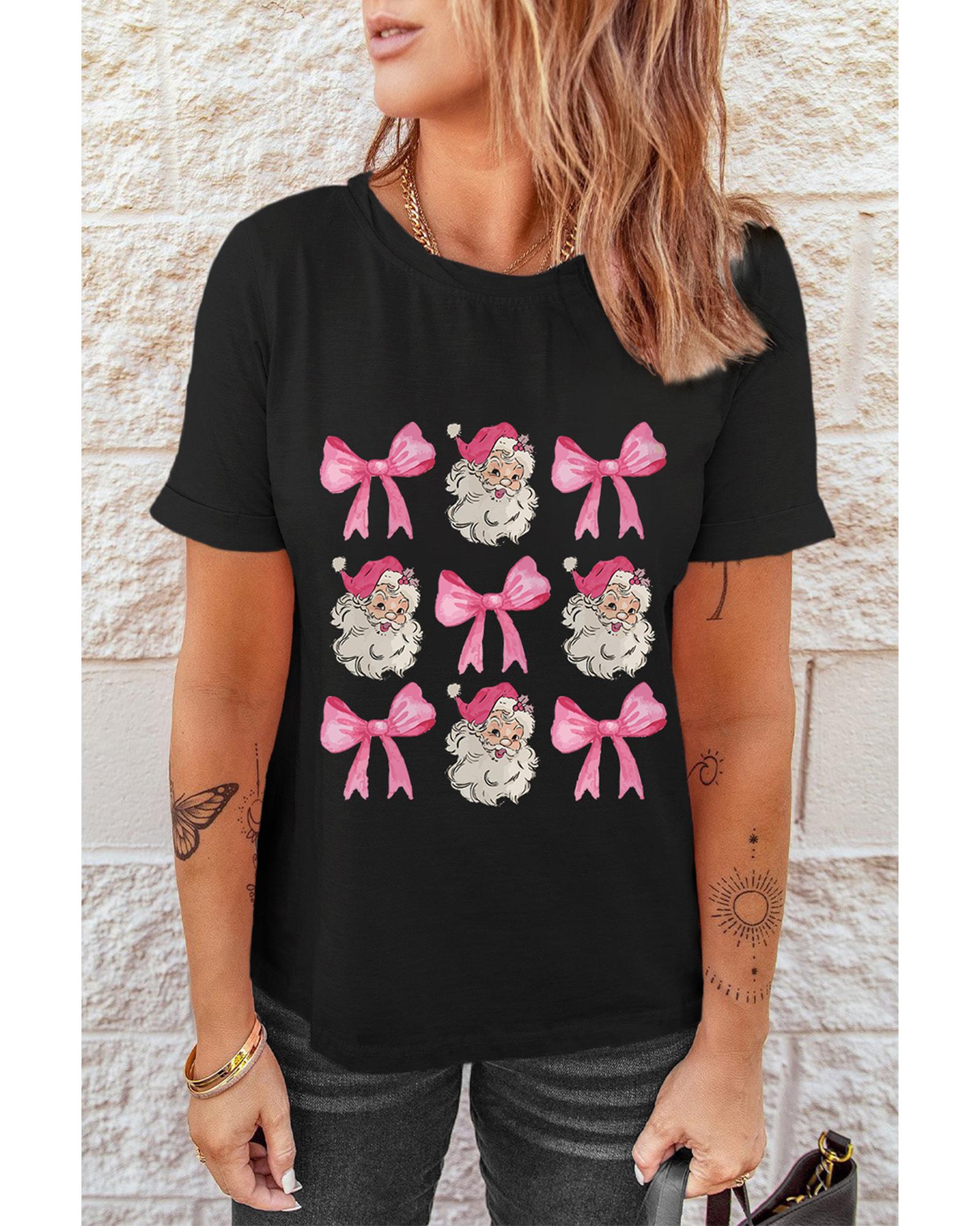 - Festive Black Santa Claus Bow Knot Christmas Graphic T Shirt