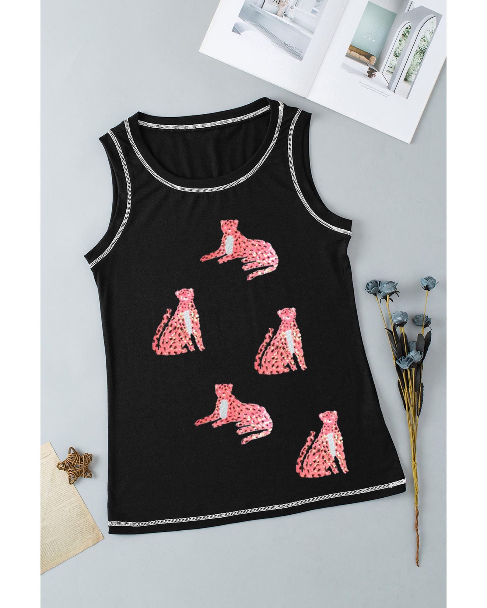 - Black Sequin Cheetah Round Neck Stitching Loose Tank Top