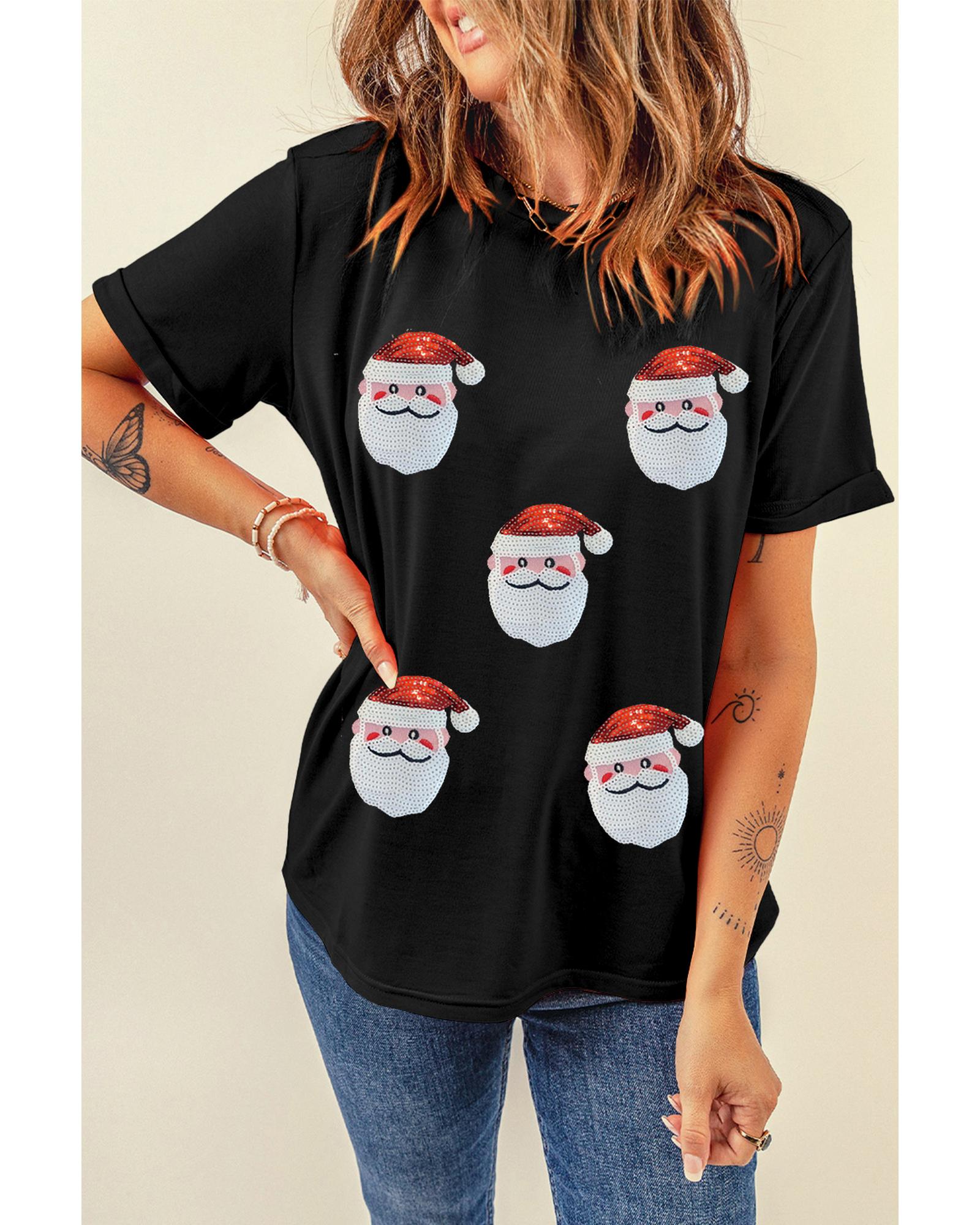 - Festive Black Sequin Christmas Claus Pattern Crewneck T Shirt