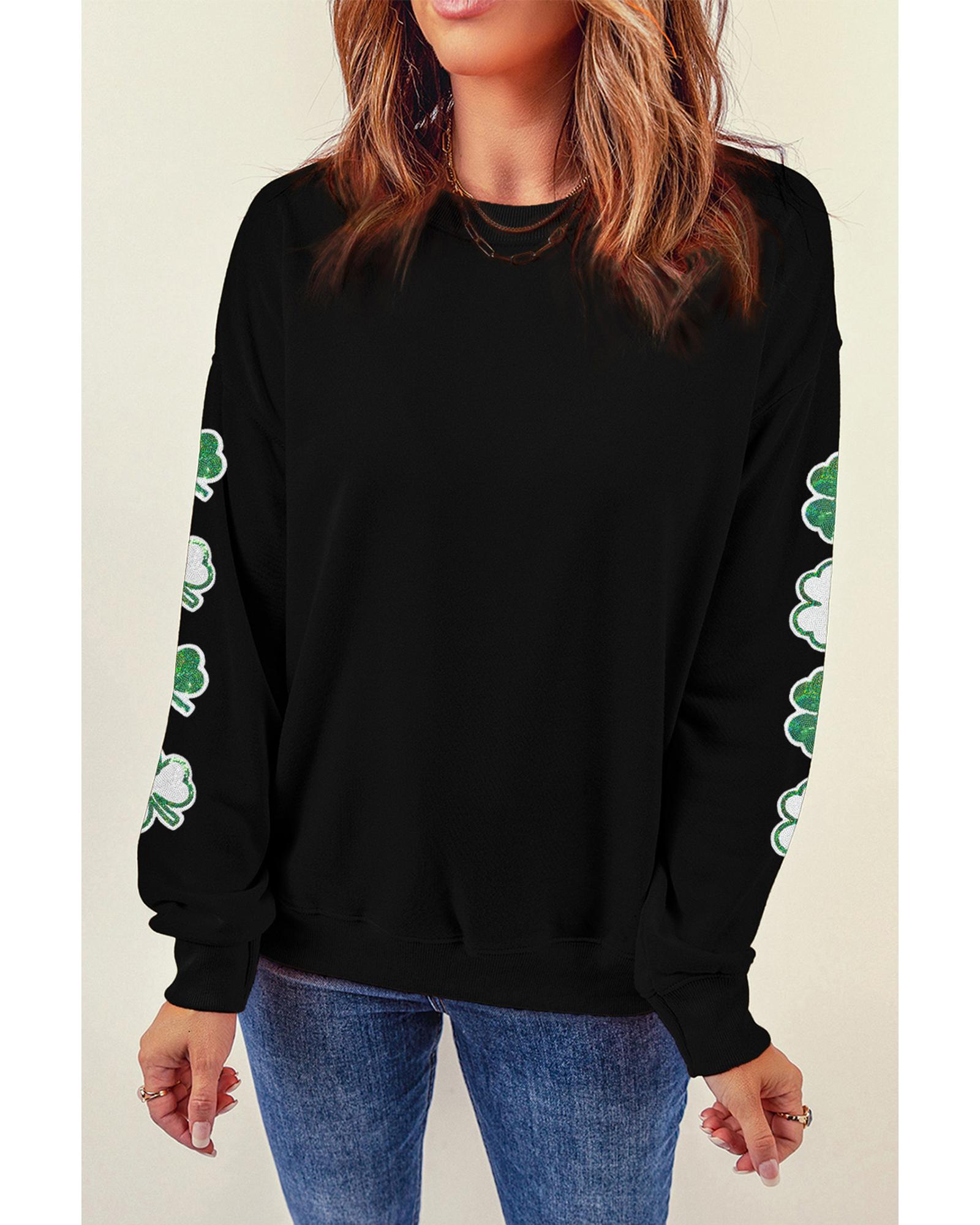 - Black Sequin Clover Patched Drop Shoulder Sweatshirt