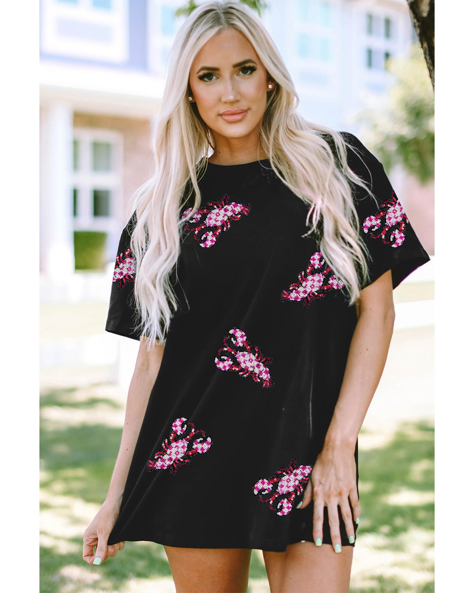 - Black Sequin Crawfish Patched Crew Neck Tee